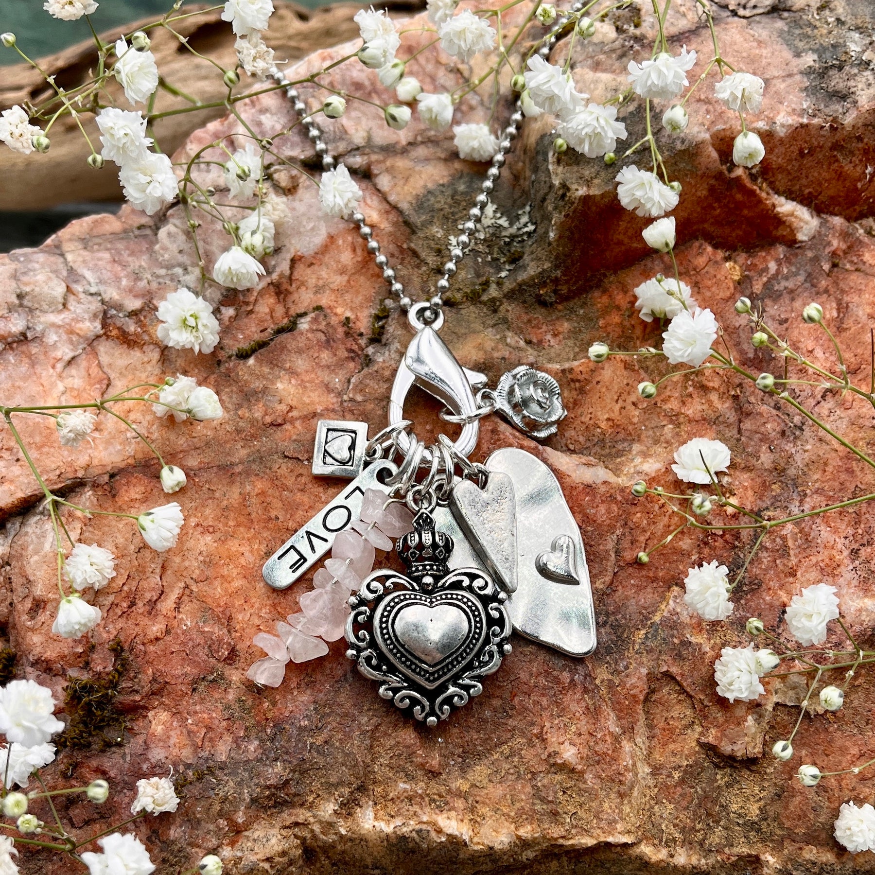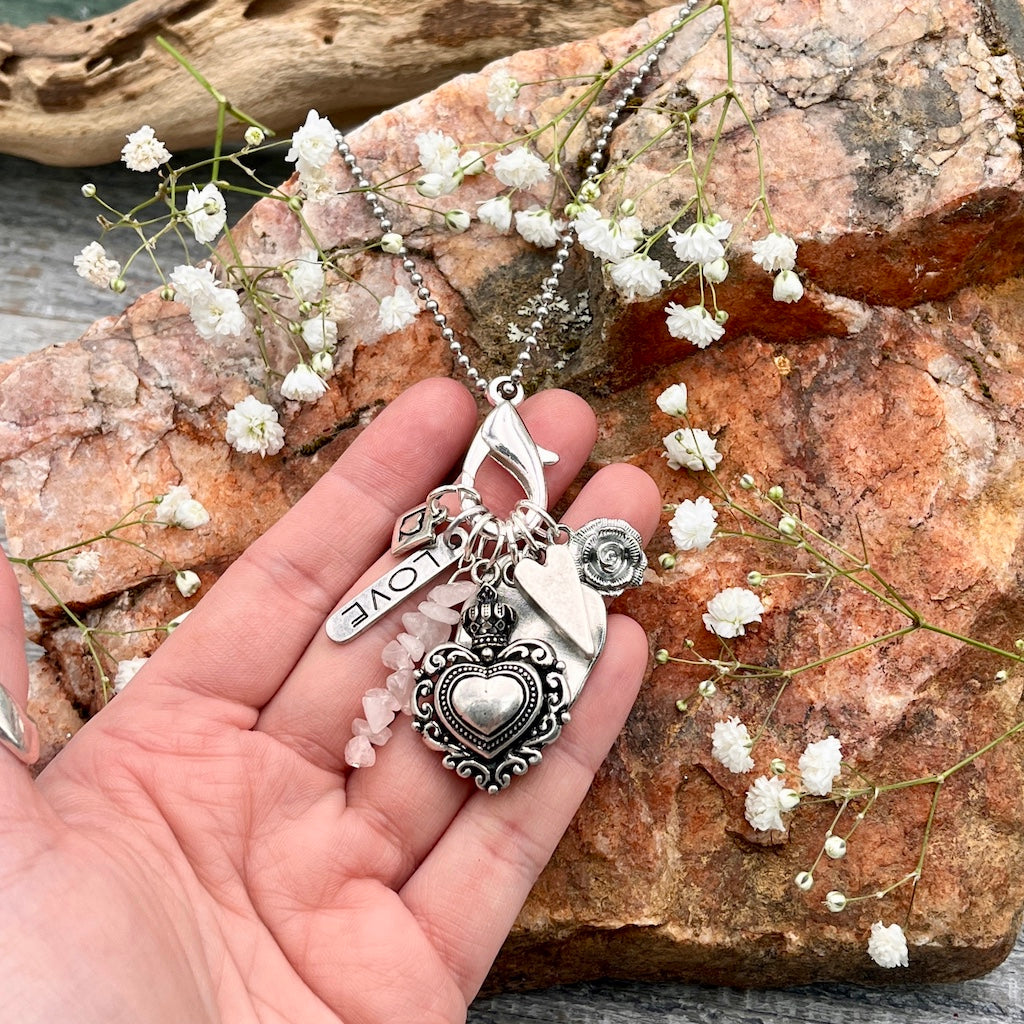 Invite love into your life with this Love Charm Necklace. Featuring a whimsical collection of heart charms and accented with Rose Quartz, this fun and frivolous necklace adds a little sparkle to any outfit.