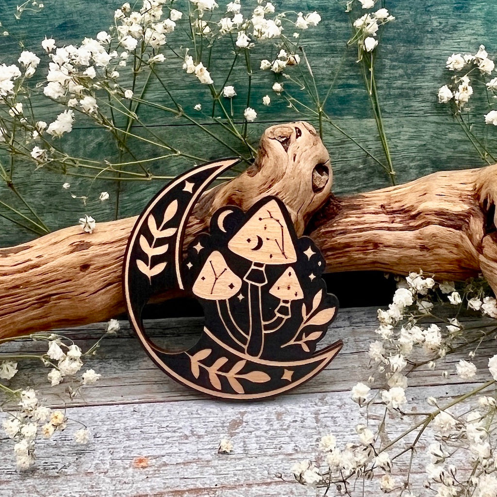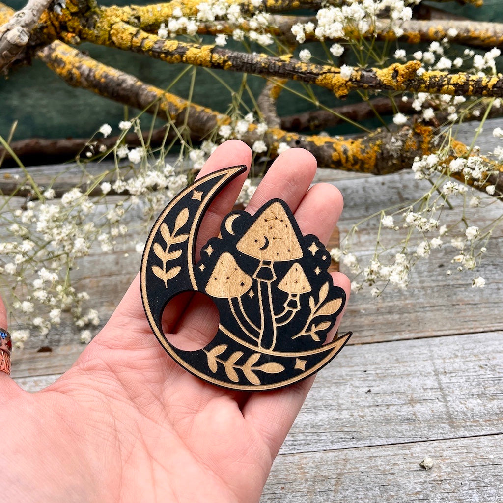 Wood Sphere Holder Moon and Mushrooms