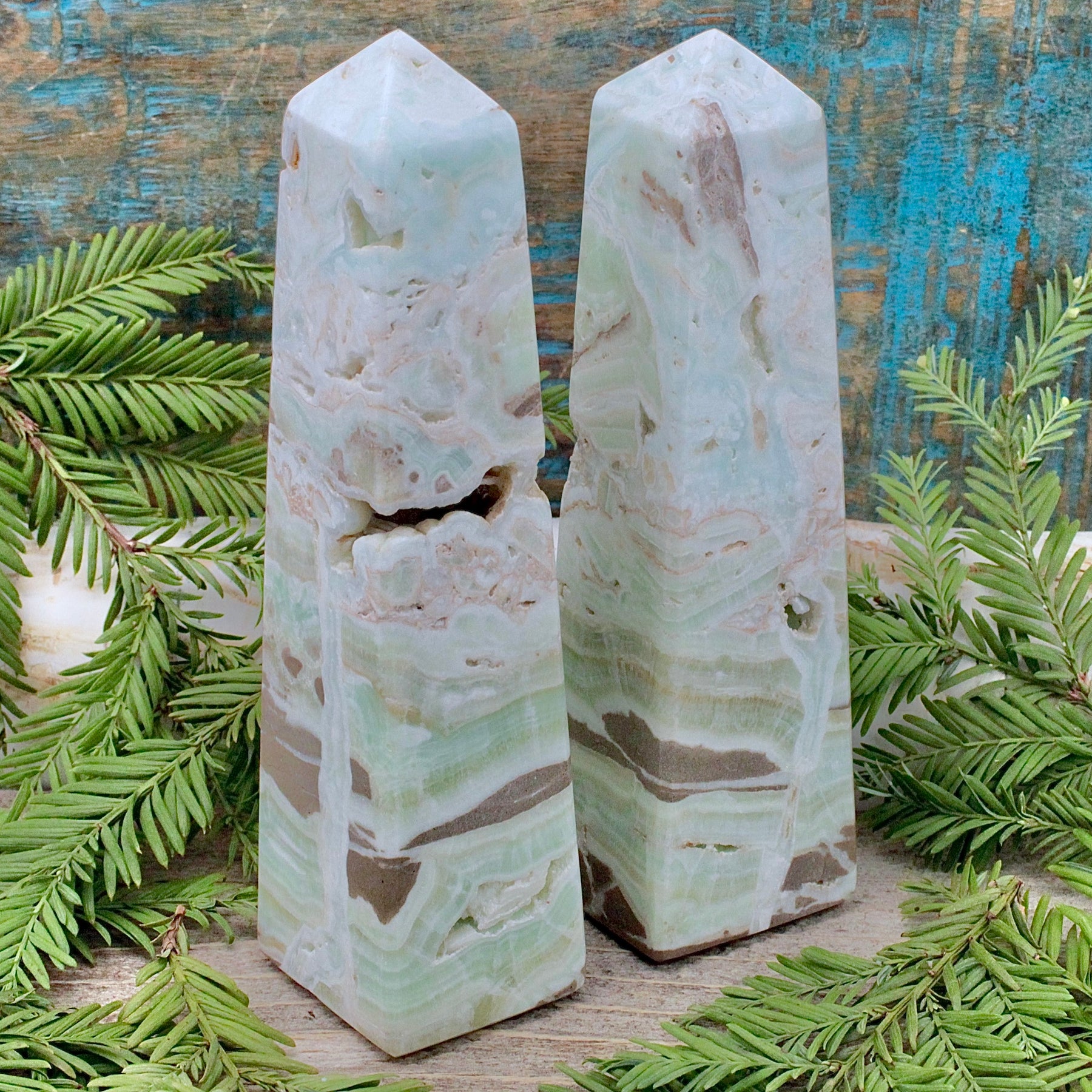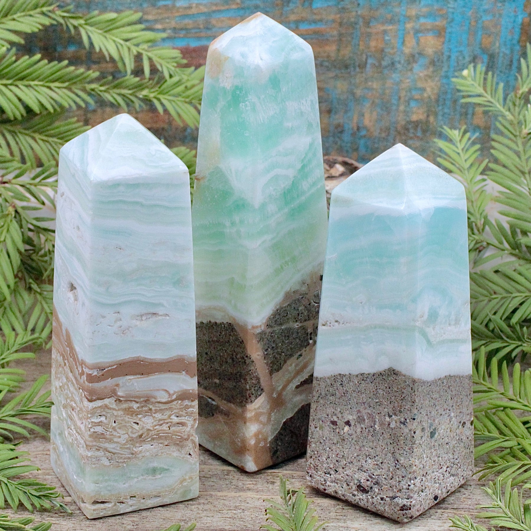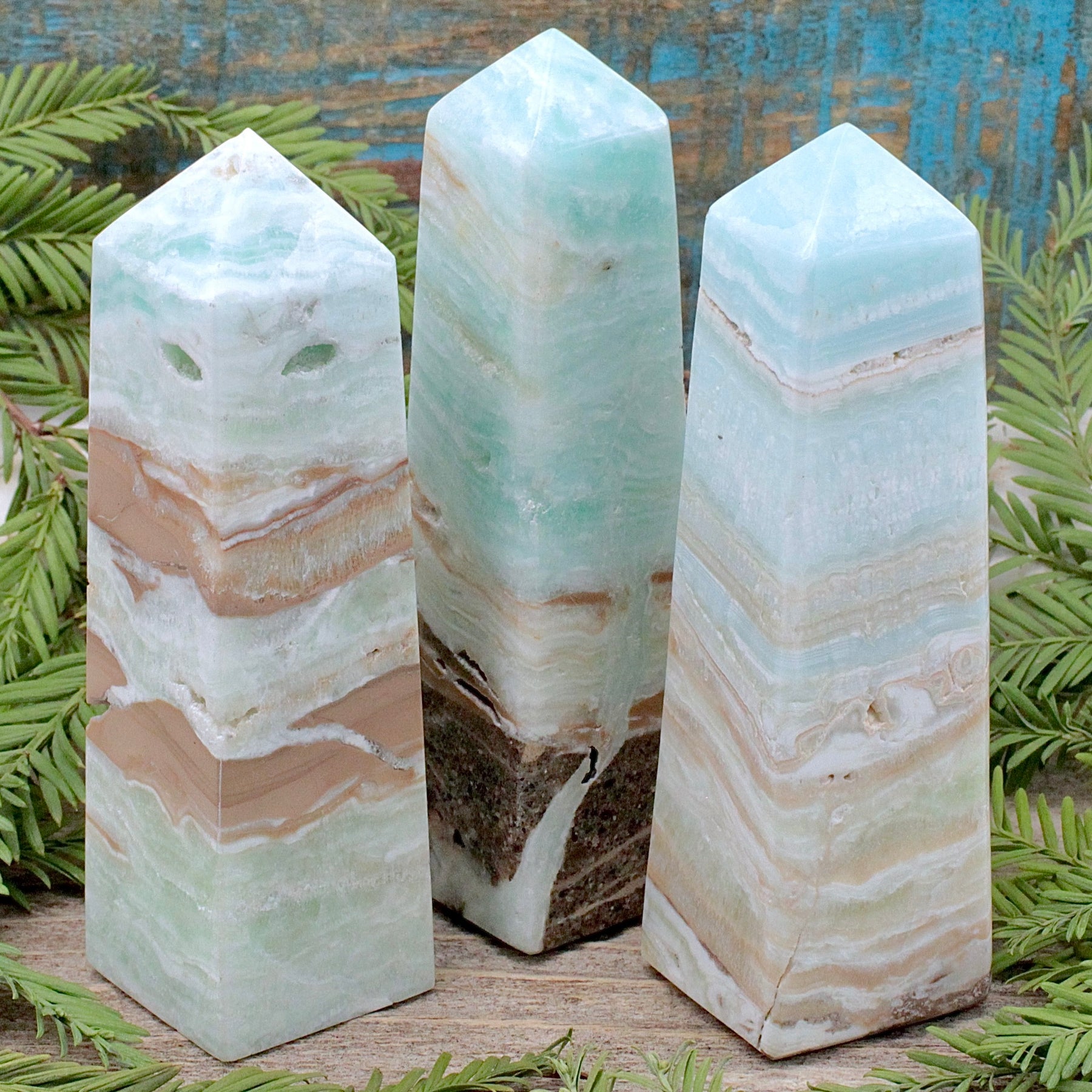 Regain your sense of yourself and your connection to a higher vibration with a Caribbean Calcite Obelisk. With pale, aqua blues, and sandy light browns, these obelisks are as soothing as an ocean breeze.