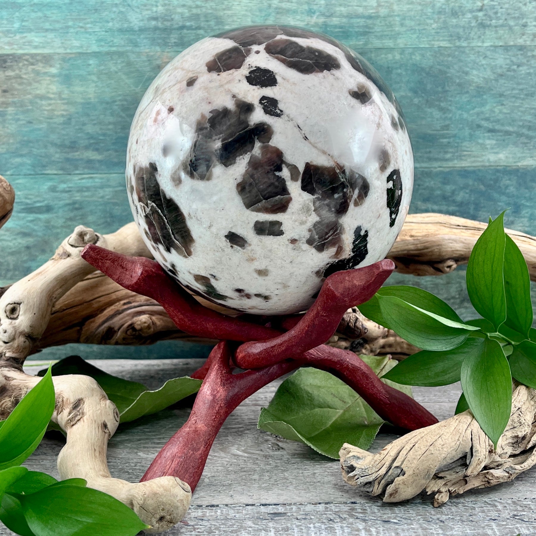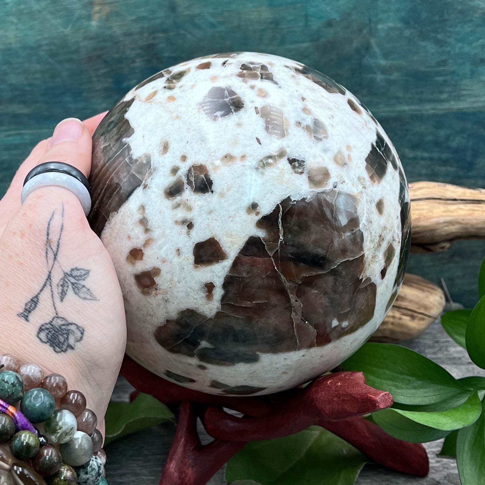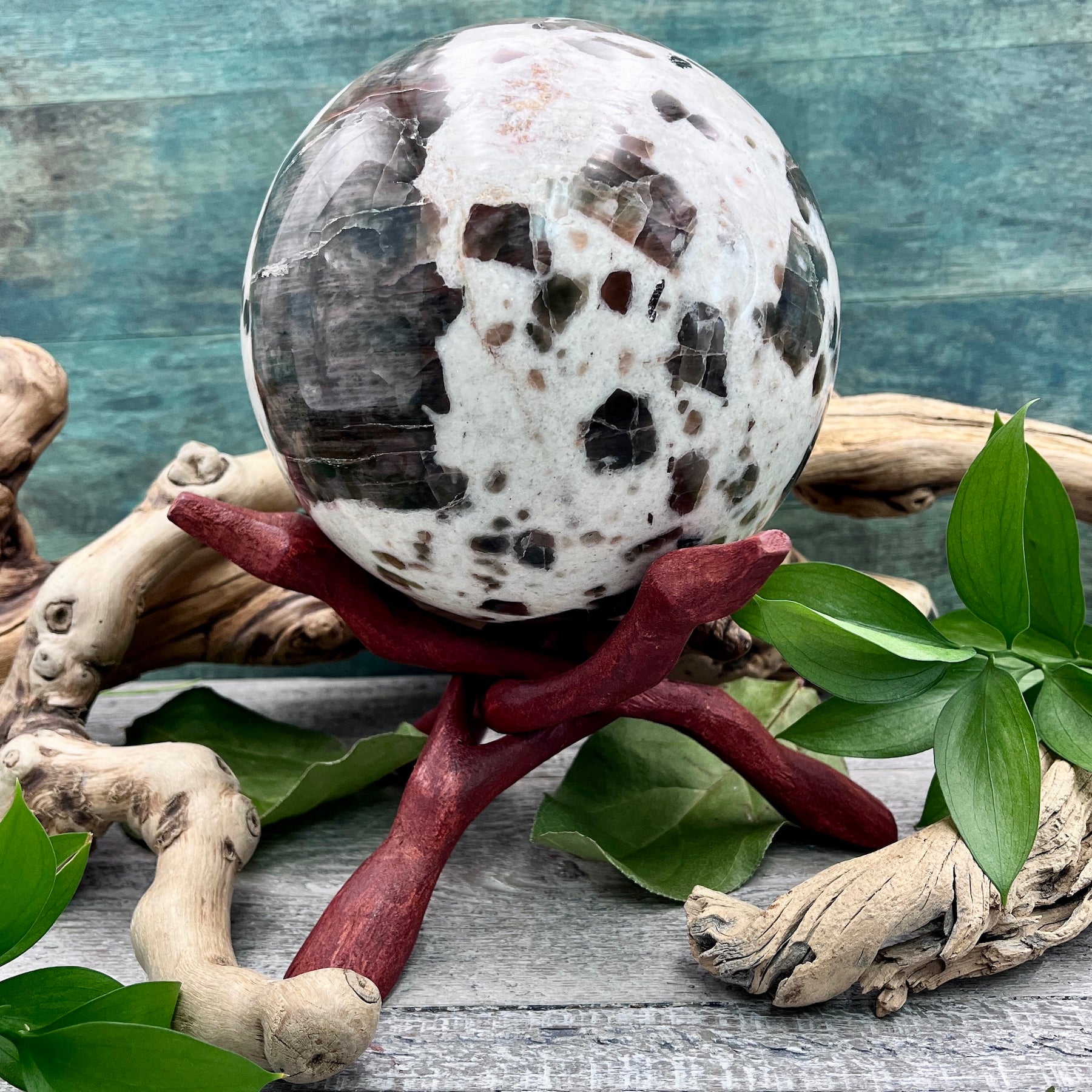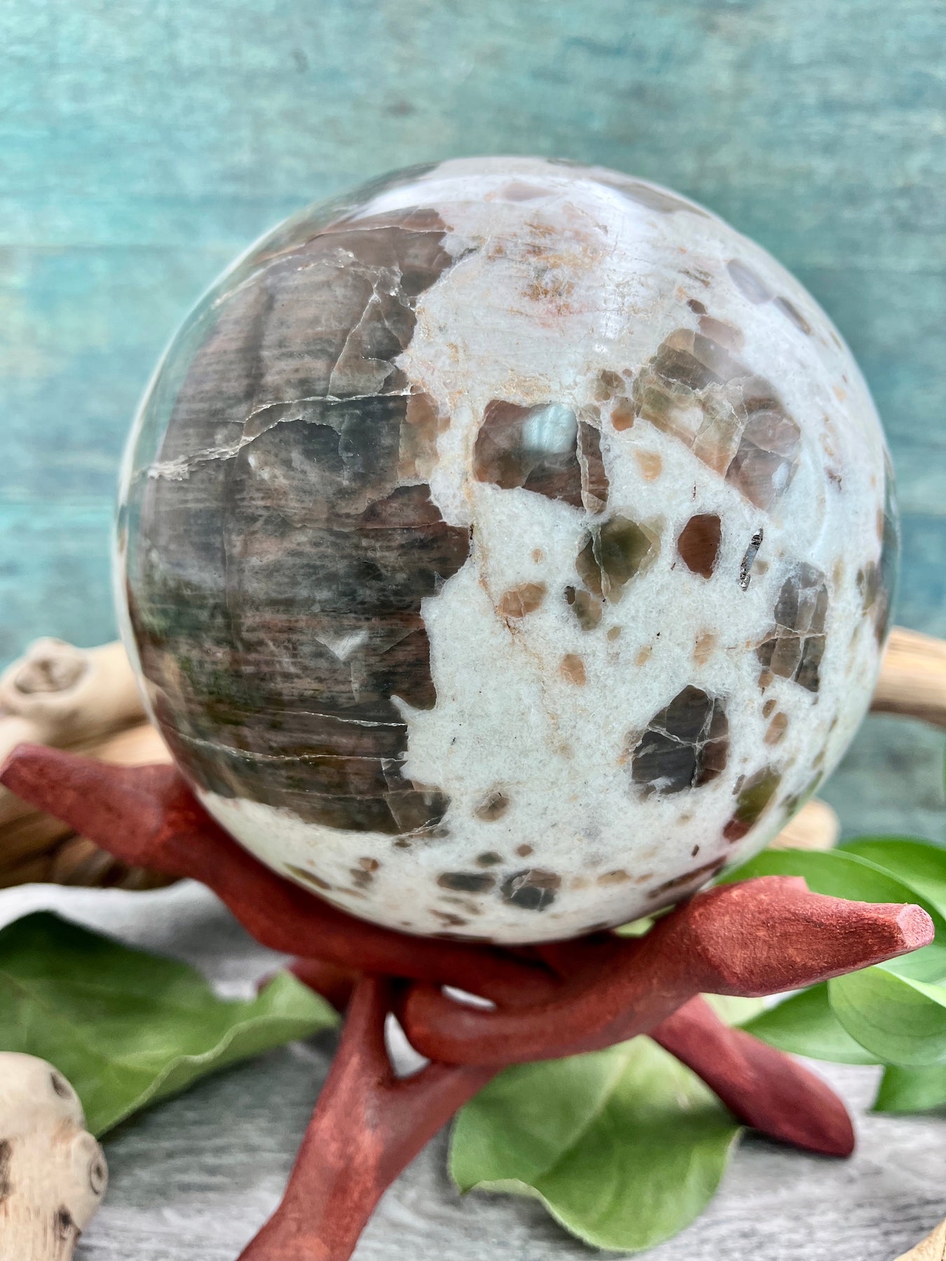 Welcome in intuition and protection with this Polarity Moonstone Sphere. This big beautiful stone is ready to be the centerpiece of your crystal collection!