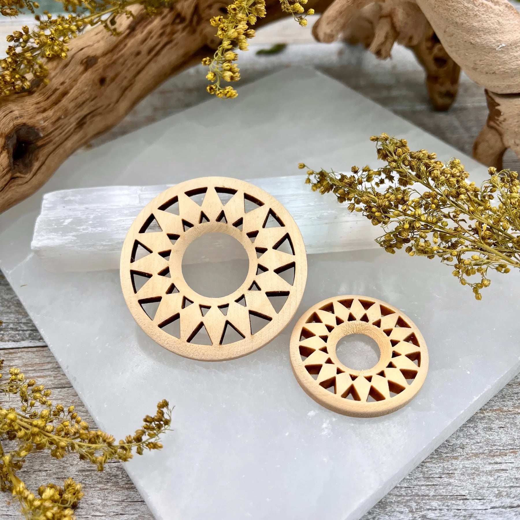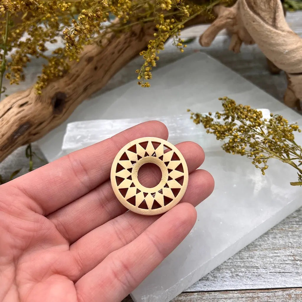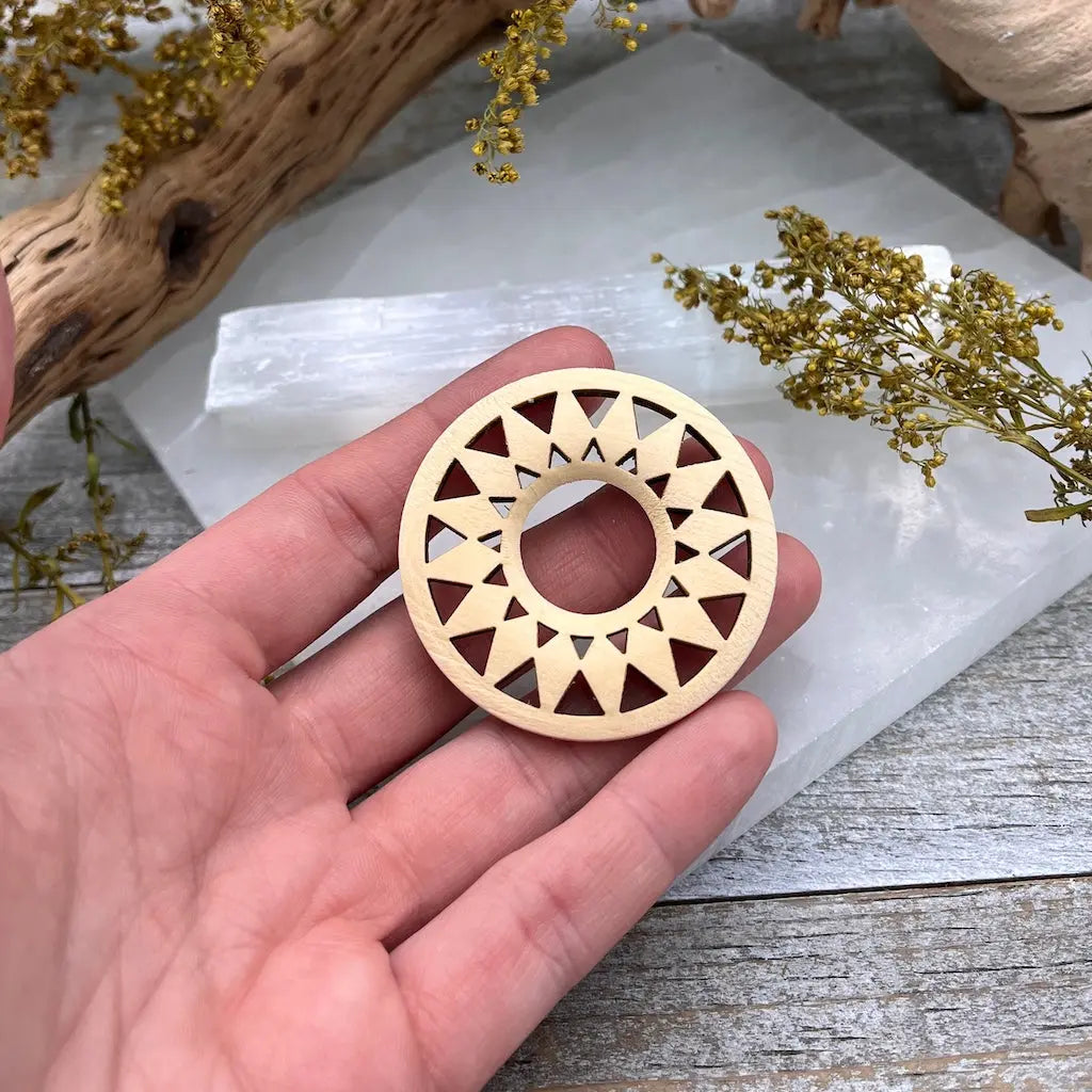 These Light Wood Sphere Holders are laser cut with a fun sunburst design. Available in two sizes, these stands are a lovely way to display your favorite crystal sphere, egg, or tumble.