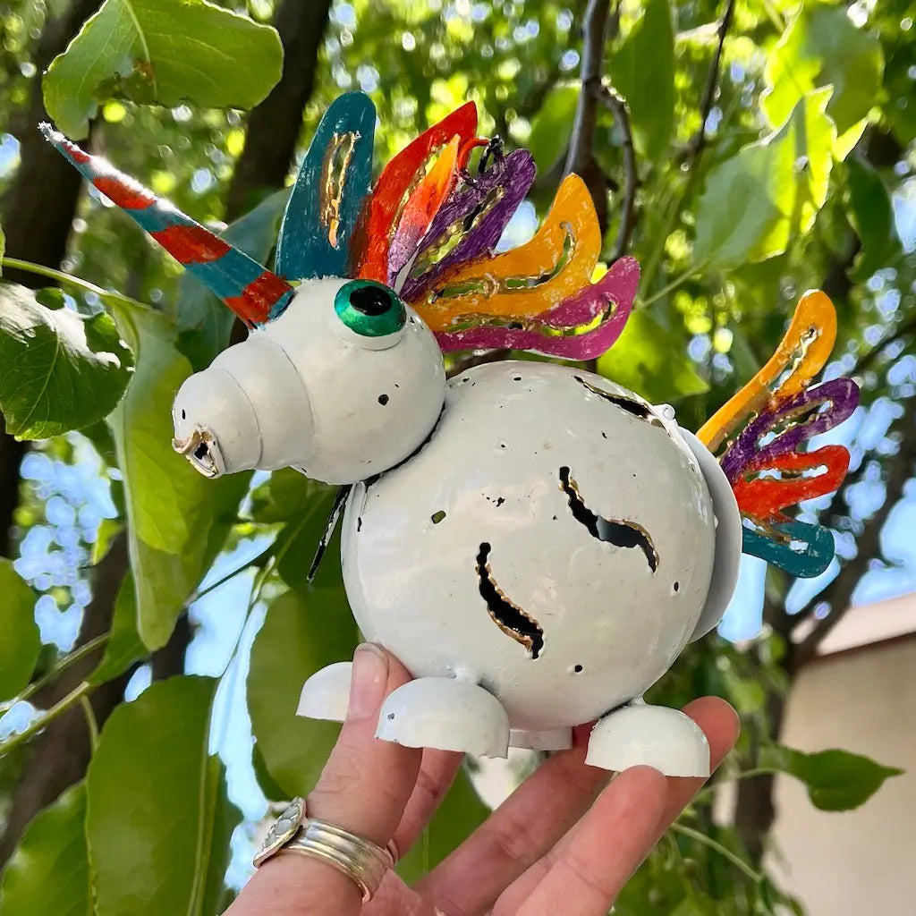 This lovable, quirky Unicorn is made of metal, with colorful designs and cutouts that let the light flicker and shine through. There is a flap near the rear for placing a tea light (or small LED light) inside. Isn't this such a cute and magical way to add a pop of color to your decor?