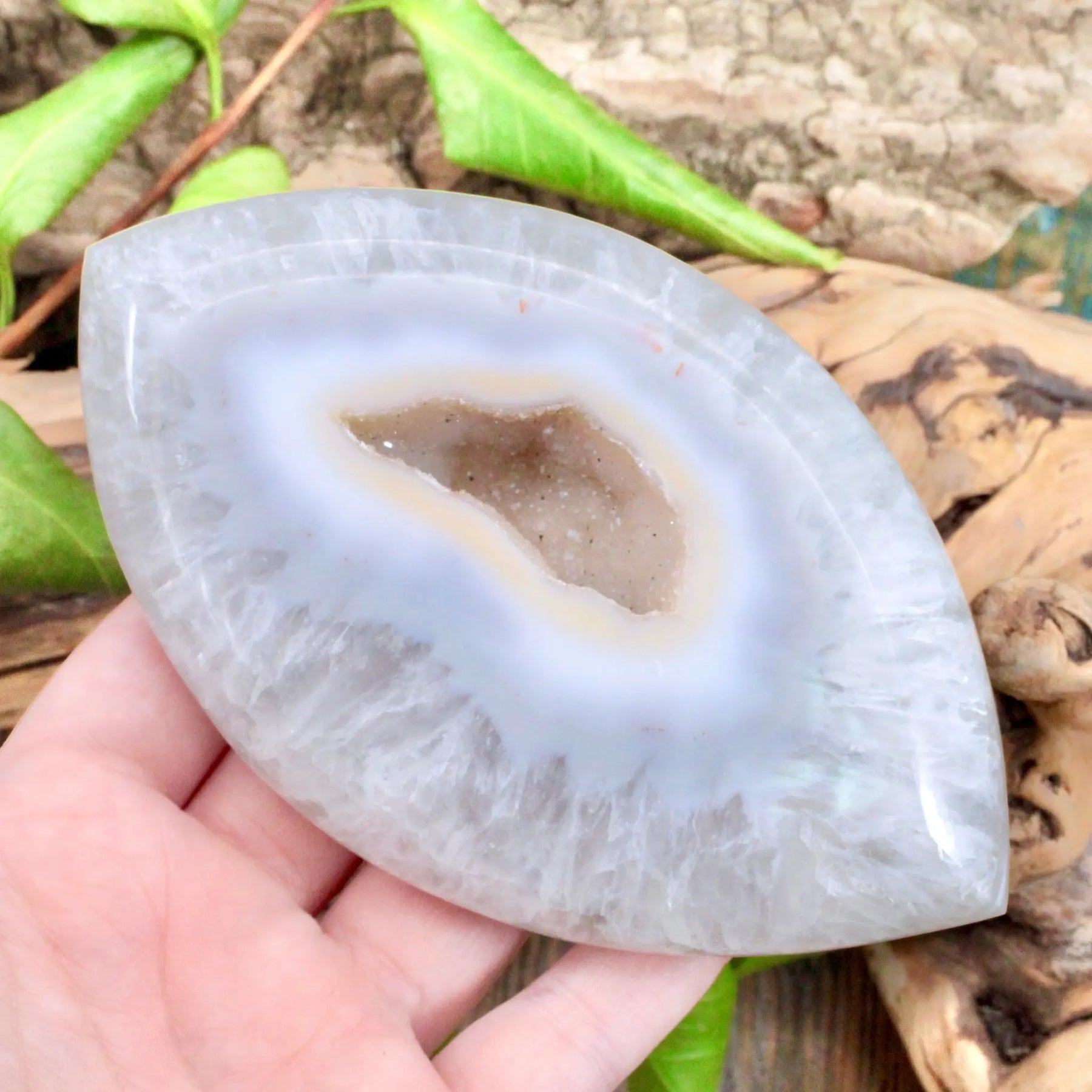 Find a sense of balance with this Agate Eye. This lovely agate with a druzy center reminds one of an eye. Let it look into your life and offer the energy of growth and balance.