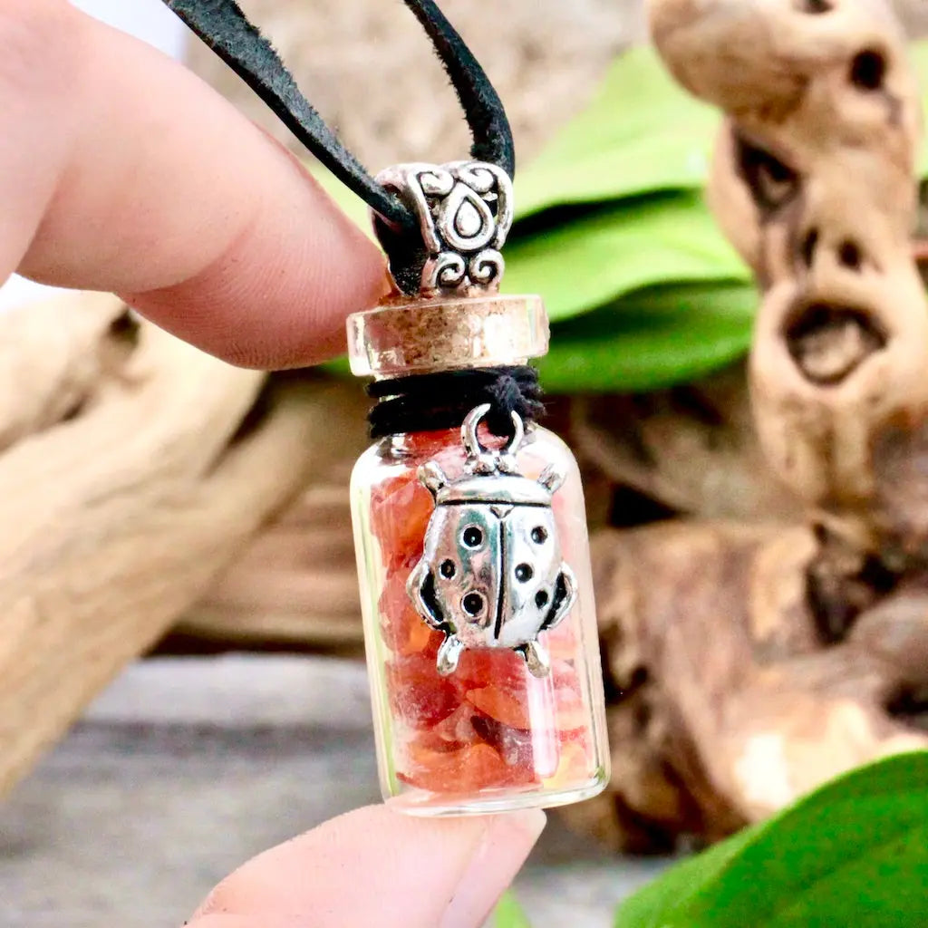 Invite luck into your life with this Good Luck Spell Jar with Carnelian Necklace. The deep oranges of the stone are invigorating and you can feel the crystal instilling you with the motivation to achieve all of your dreams. The leather cord is fully adjustable and the ladybug charm was added for extra luck.