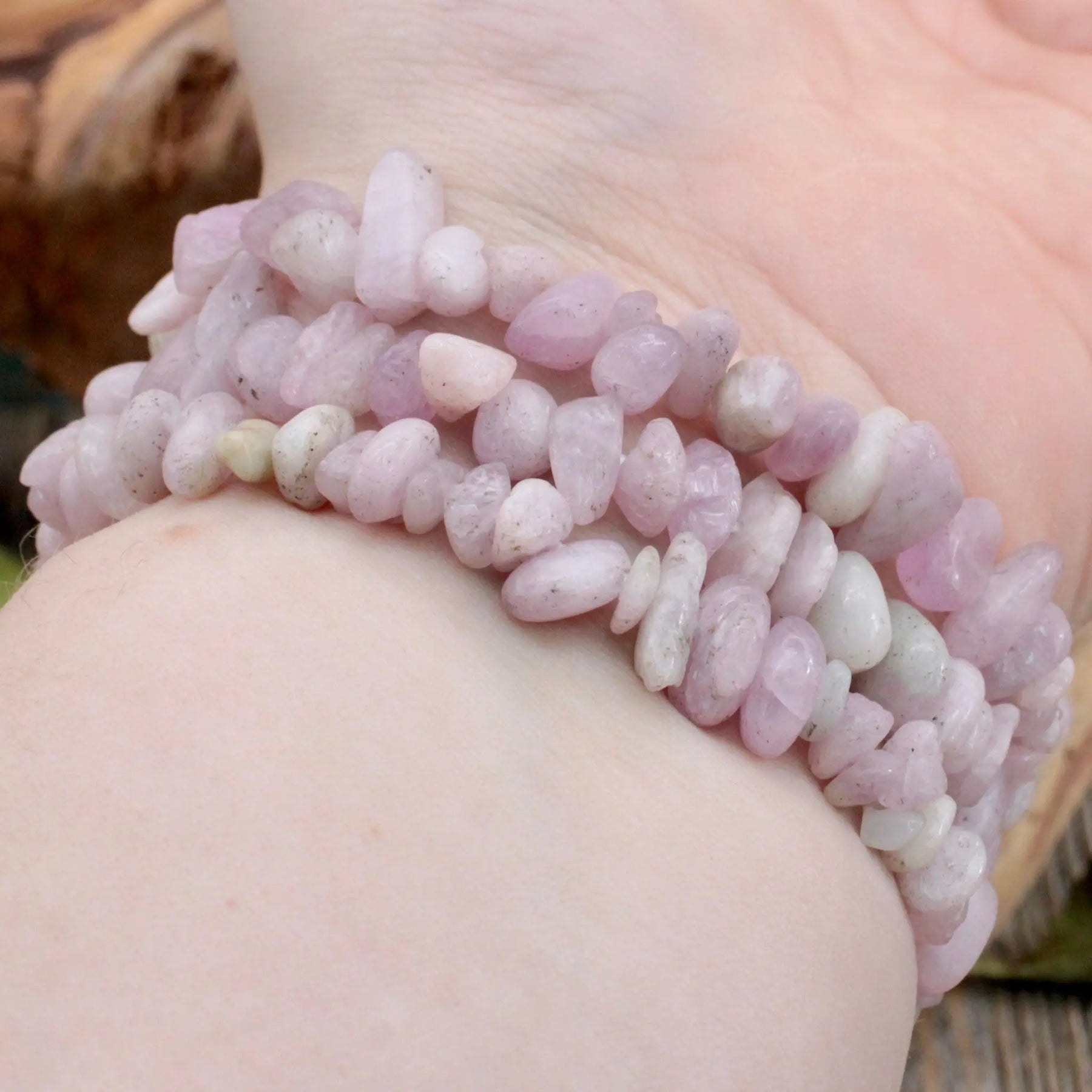 Extract negativity from your life with this Kunzite chip bracelet. Kunzite can shield you from negative emotions and events as well as instill peace and love into your heart.