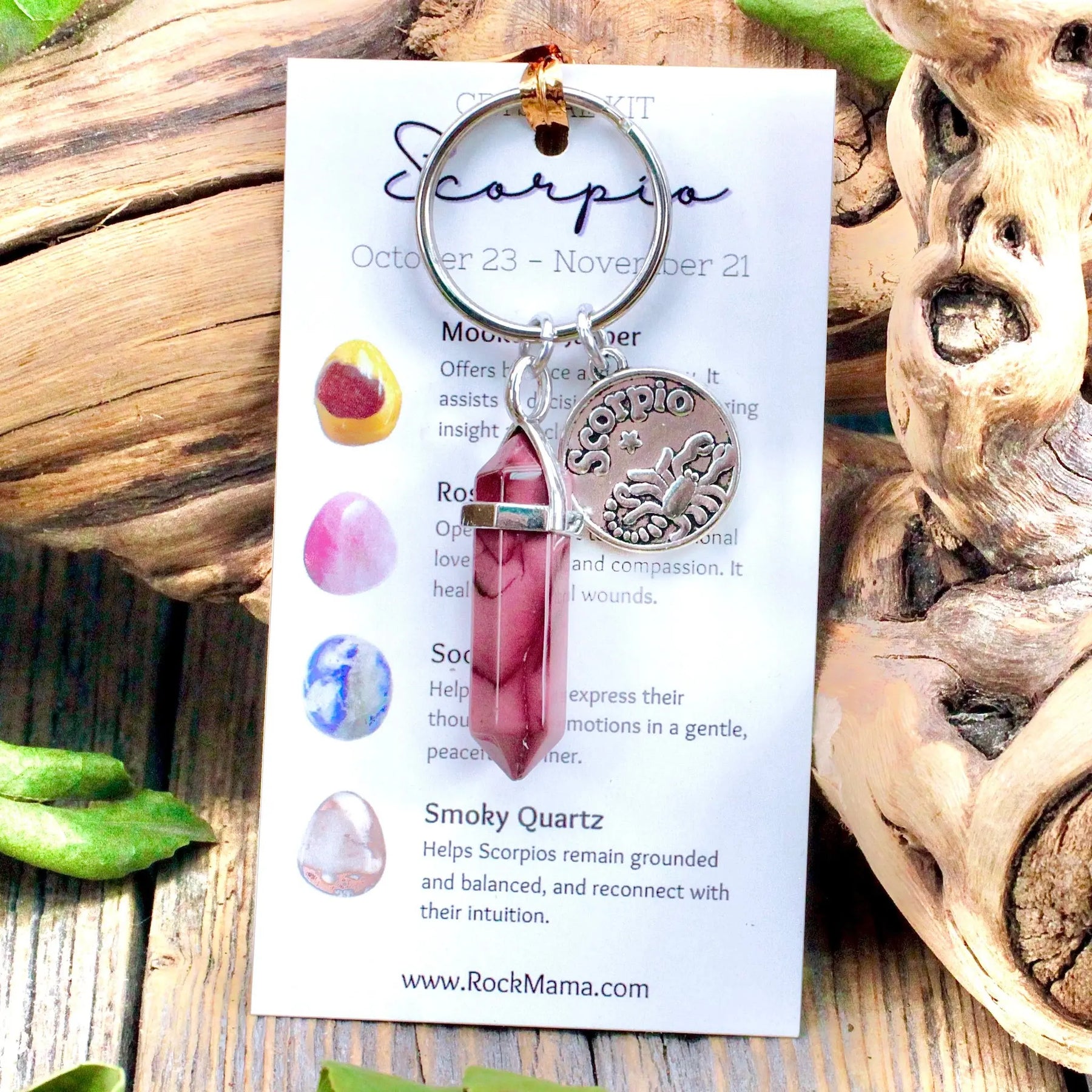 Make the best decisions with this Mookaite Jasper key ring with Scorpio charm. Mookaite Jasper is a beautiful stone that keeps us grounded and connected to our intuition. It brings clarity in times of confusion and helps us see the beauty of the world around us.