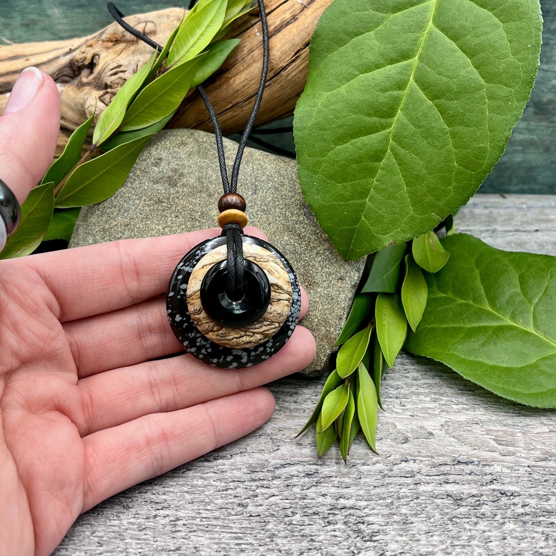 The pendant is 40mm in diameter and the waxed cotton cord is adjustable from 15"-30". Handcrafted in California.