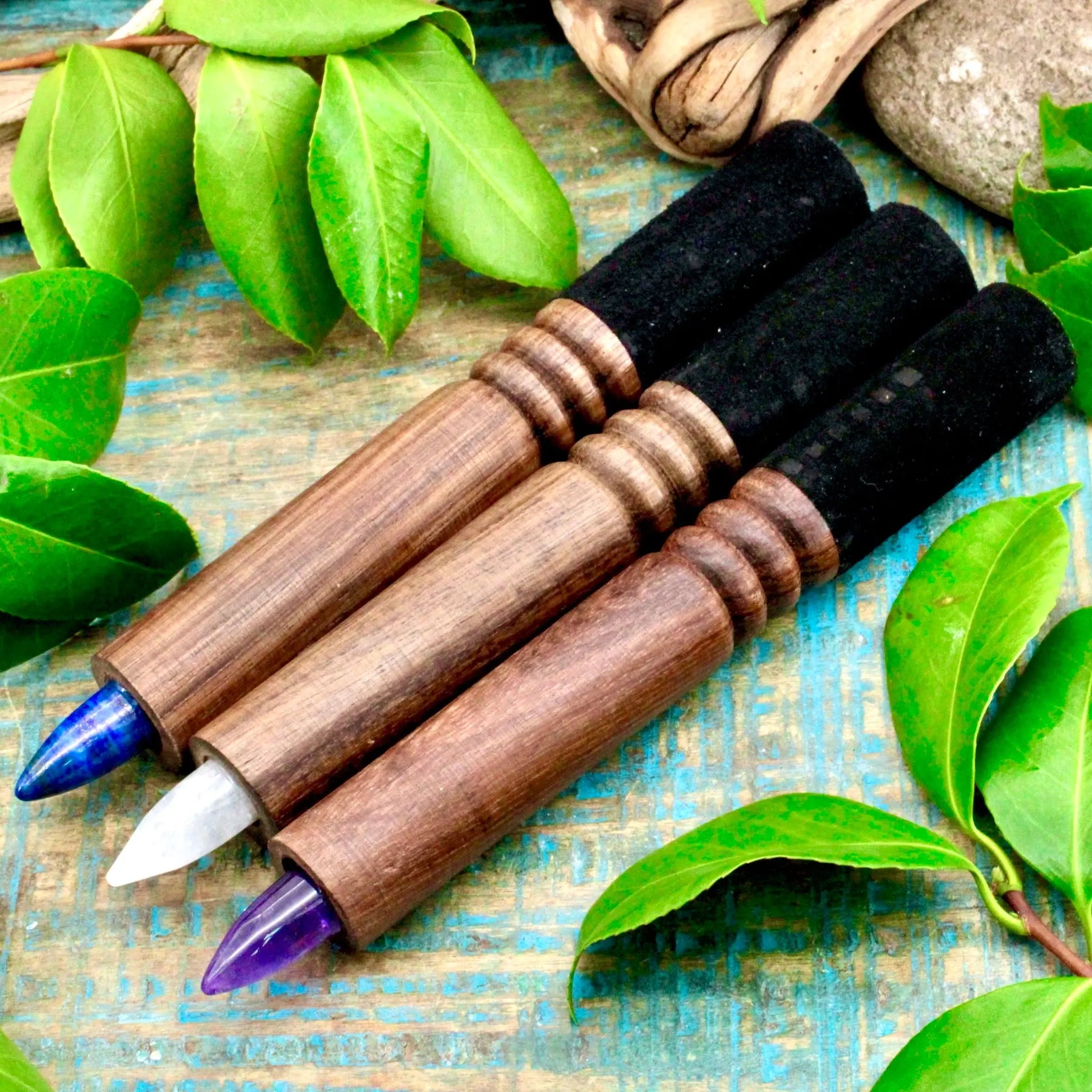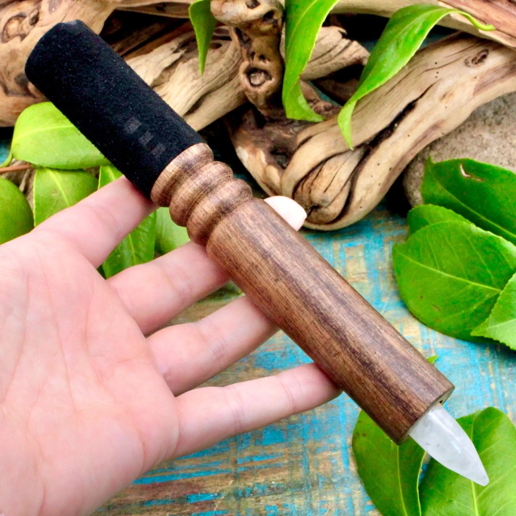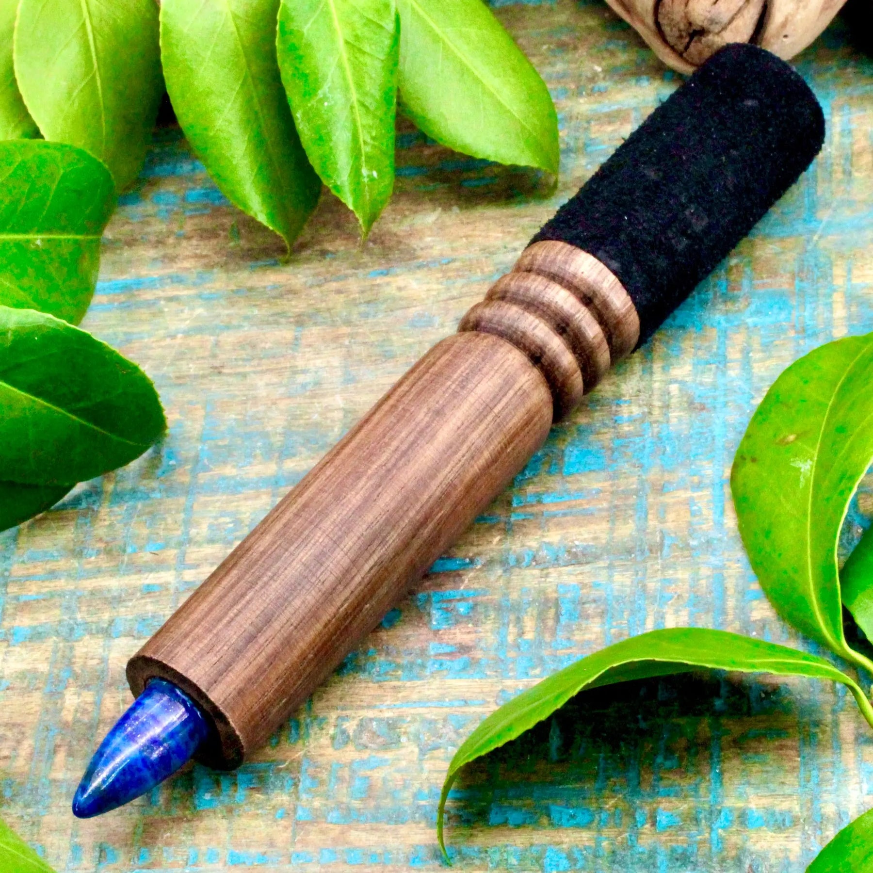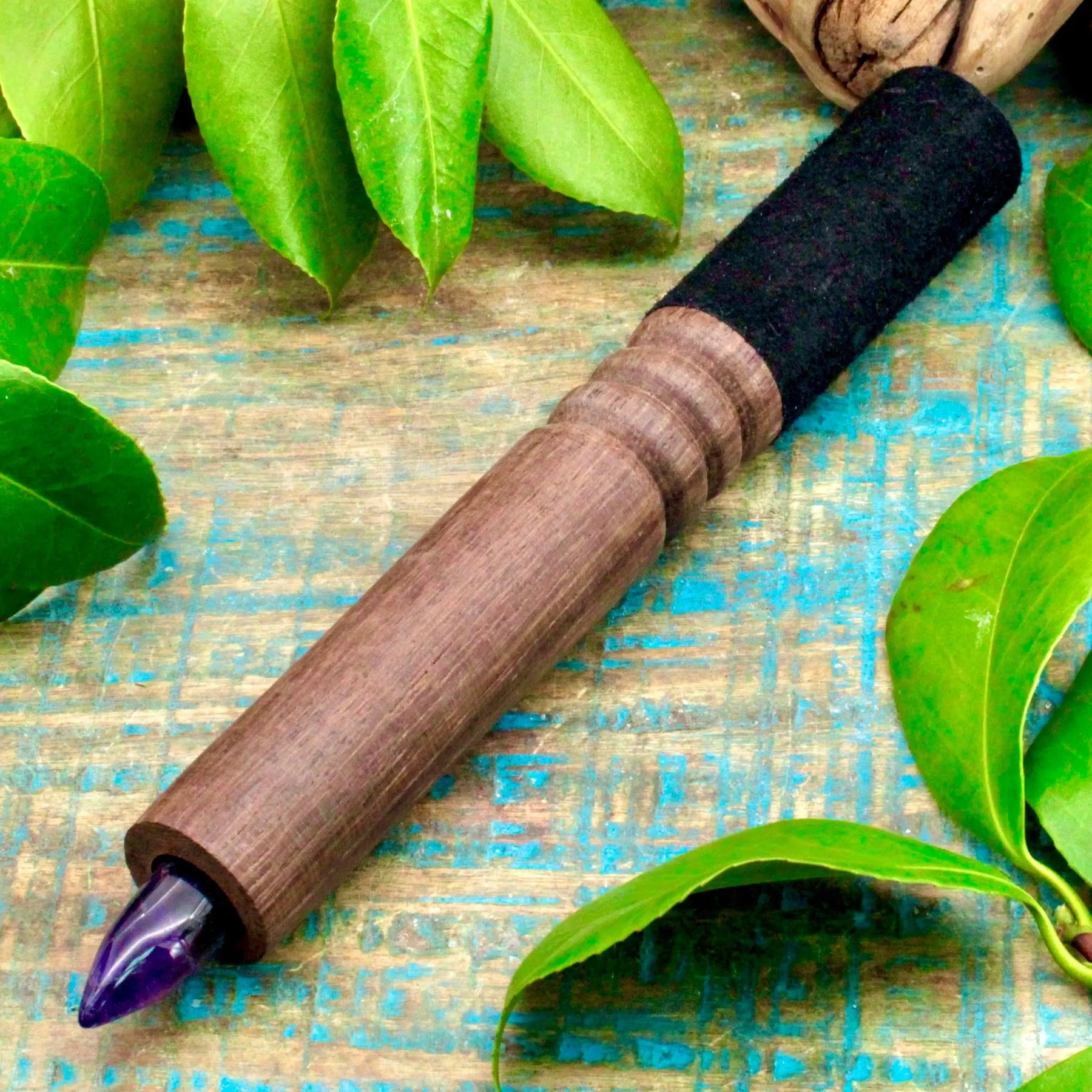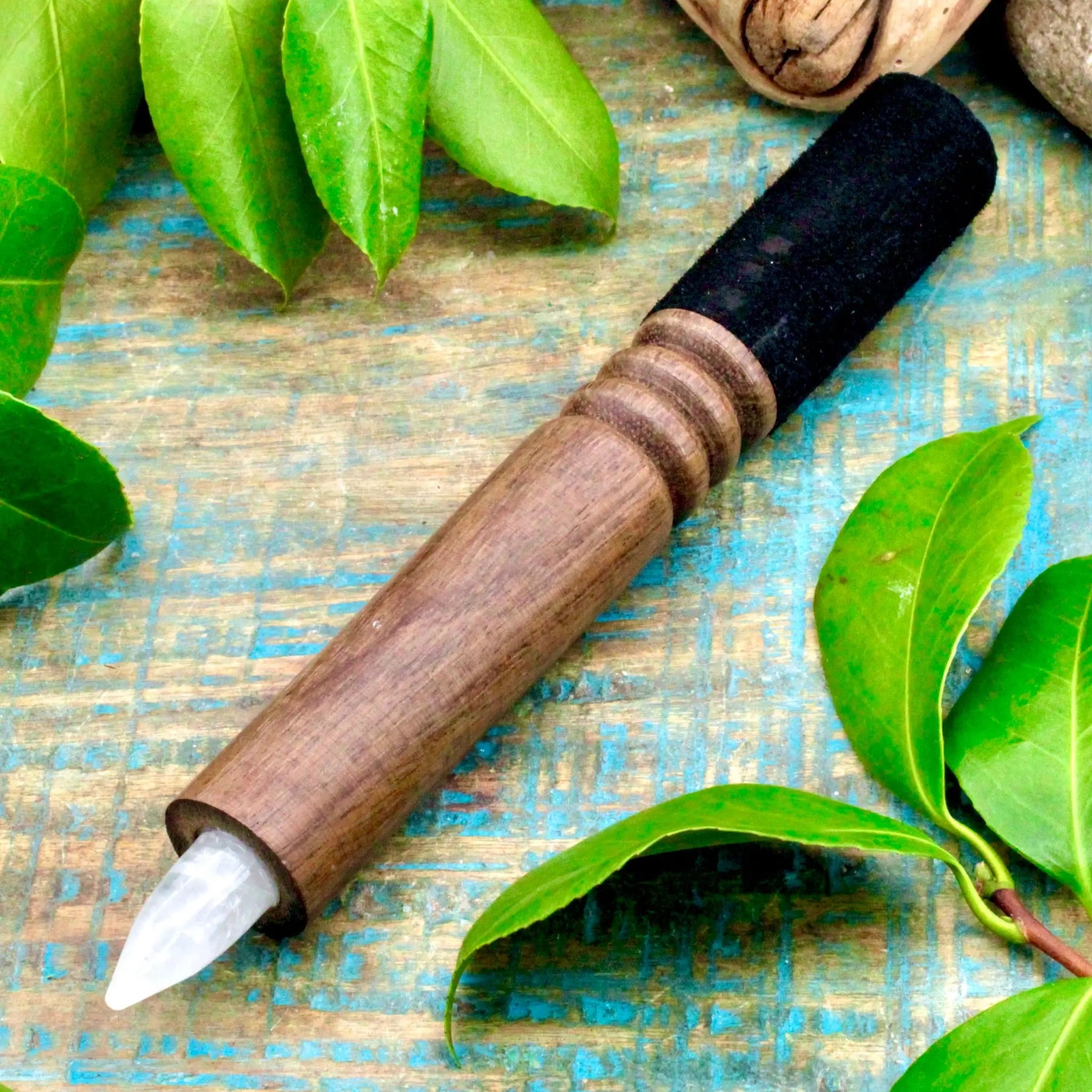 Enhance the vibe of your singing bowl situation with this crystal mallet. This beautiful mallet features a velvety black handle and a crystal point.