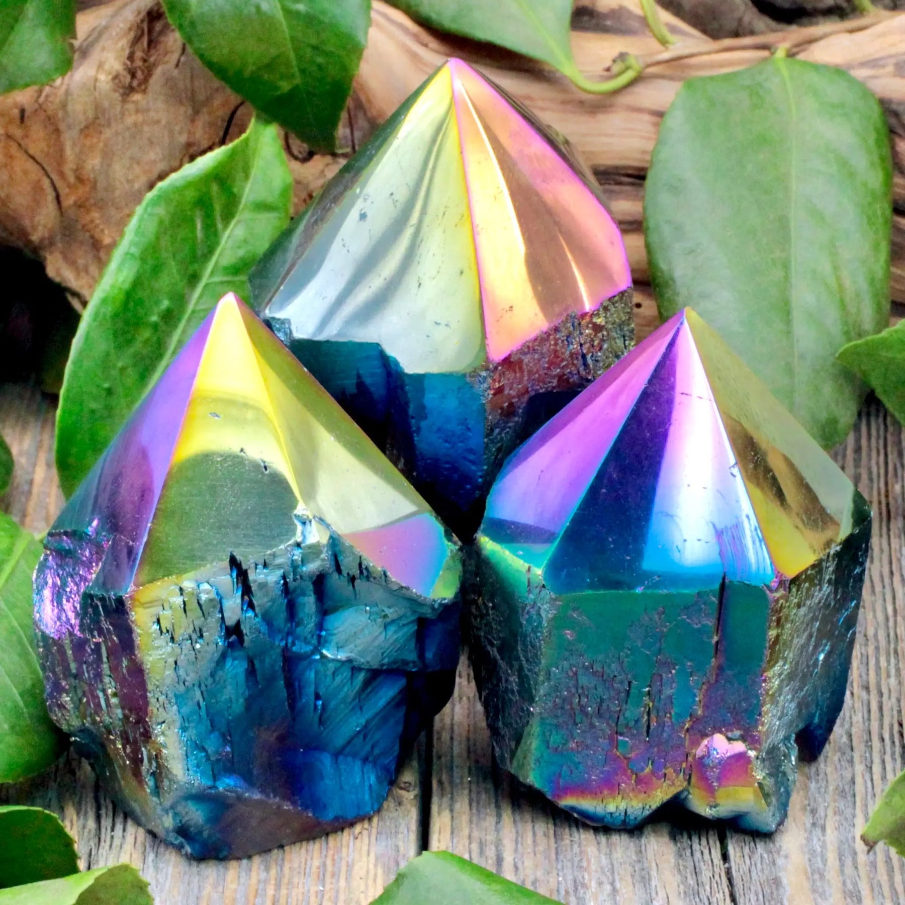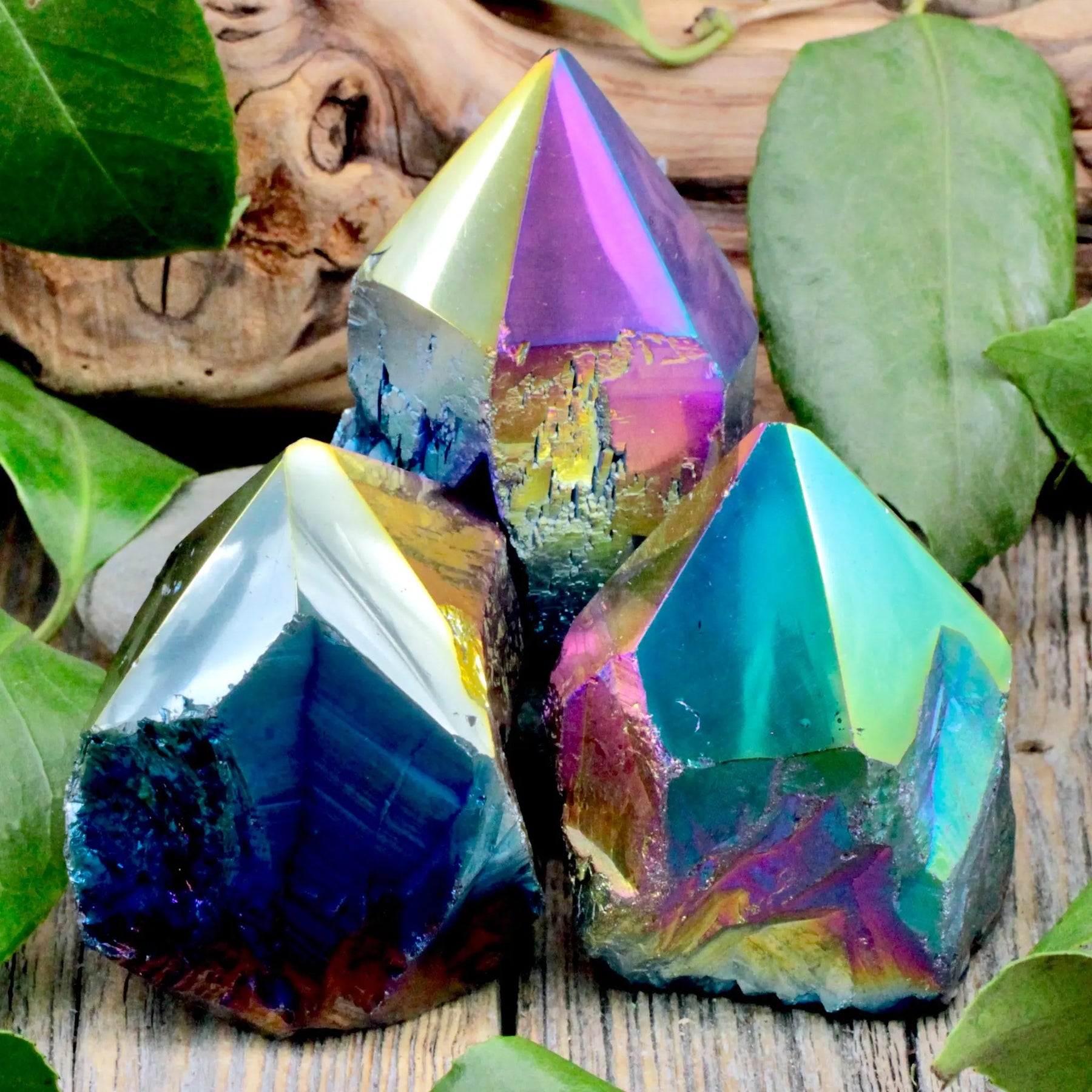 The distinctive rainbow effect activates all our chakras, resonating especially with our solar plexus, offering increased confidence and support to manifest our dreams. The aura effect is obtained through a chemical process that super-heats and transfers ionized particles of precious metal to the crystal's surface, creating a permanent molecular bond and changing the color of the stone. The base stone retains its inherent qualities, and the precious metal enhances the crystal's already high vibration. It encourages connection with our authentic selves, dispelling limiting beliefs and behaviors, and freeing us to explore and embrace new experiences and new ways of seeing the world.