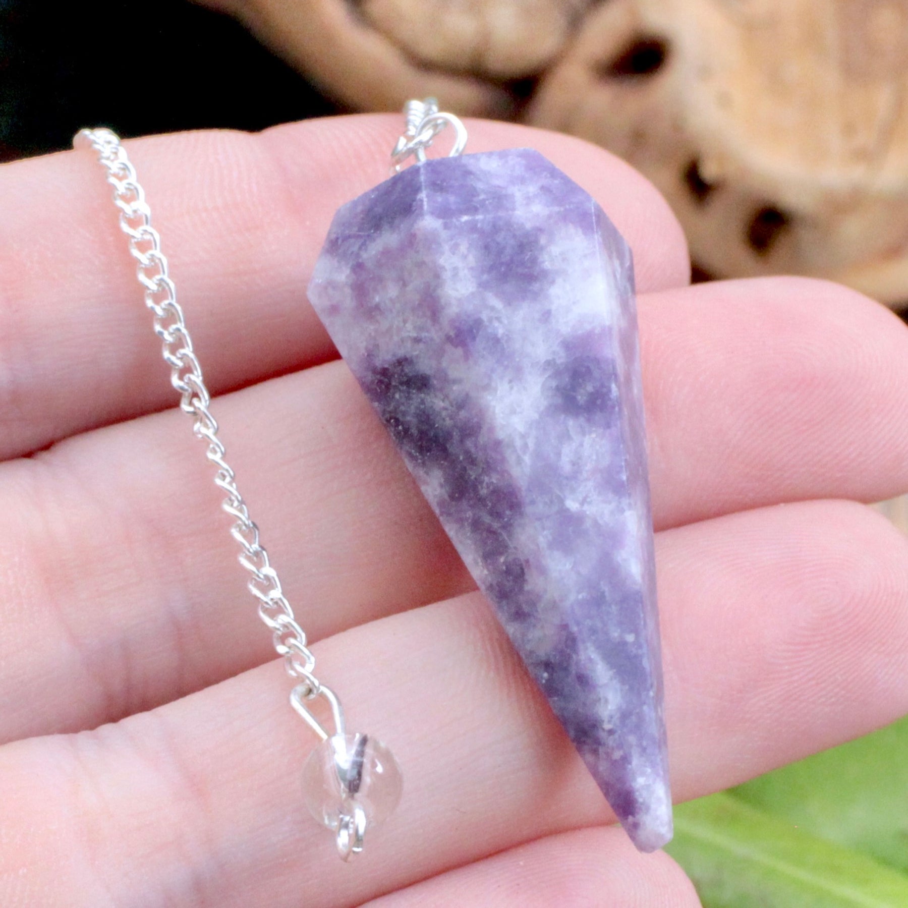 Rediscover serenity with this Lepidolite Pendulum. Lepidolite's soothing energy quiets obsessive thoughts, guiding you to emotional equilibrium. This piece also comes with a Quartz bead at the end of the chain to amplify the beautiful properties of Lepidolite.