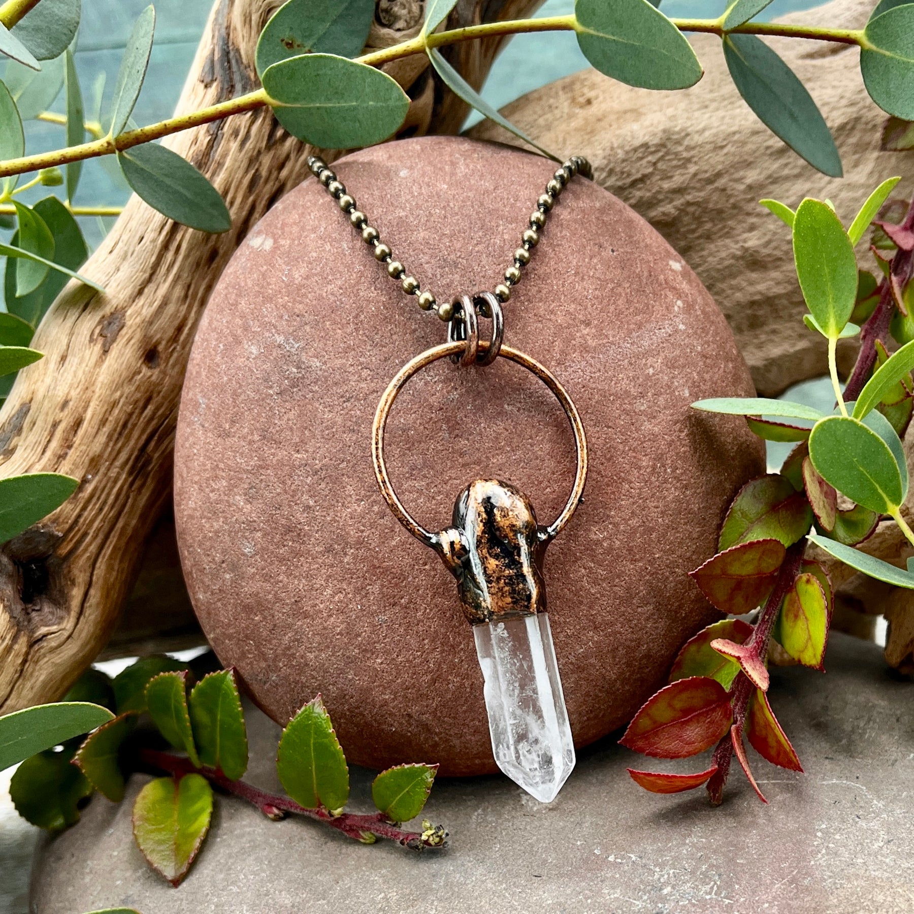 Connect to your higher self with this Quartz Point Circle Necklace. Done in a fashionable bronze finish, this necklace is genderless statement piece that will amplify the properties of any other stones in your collection.