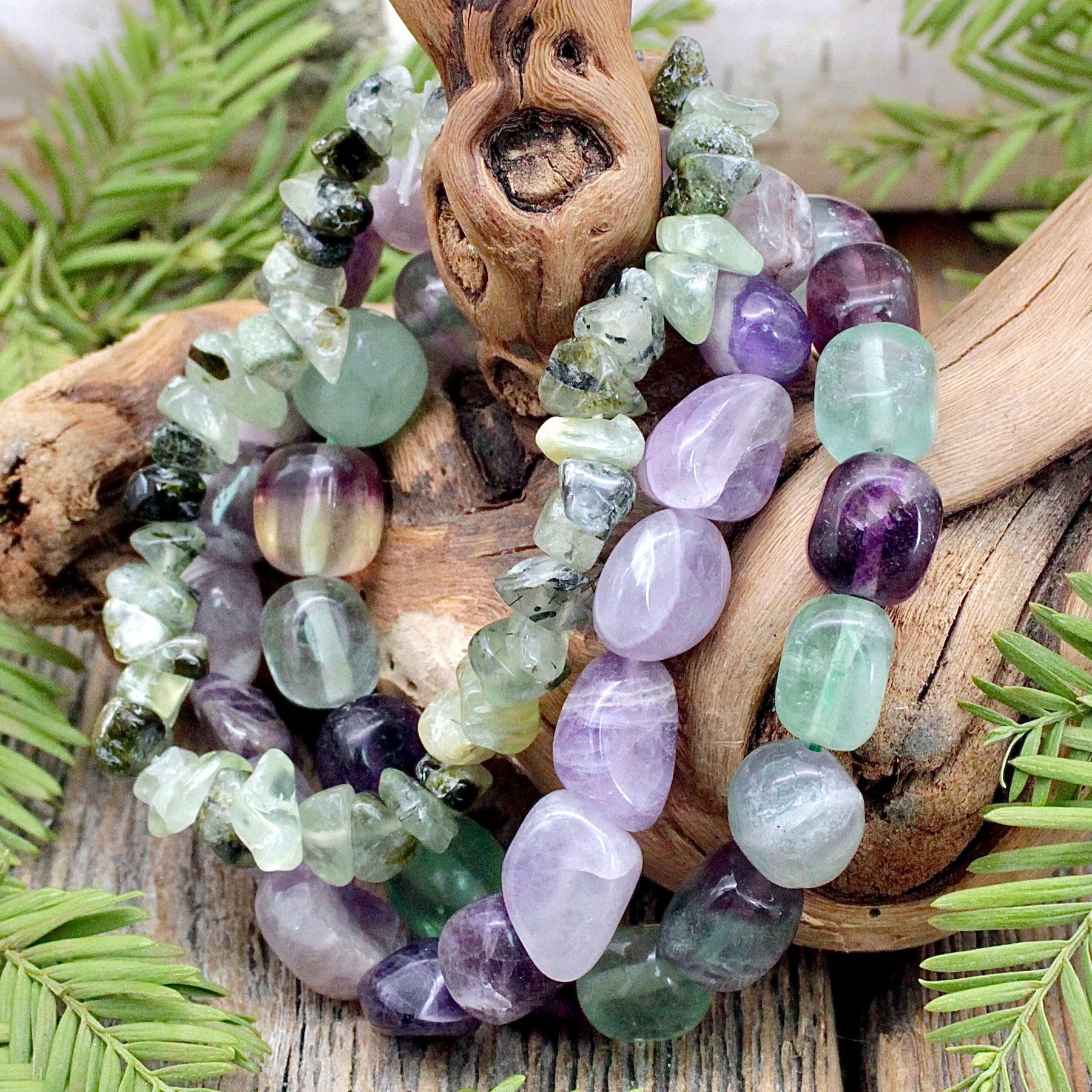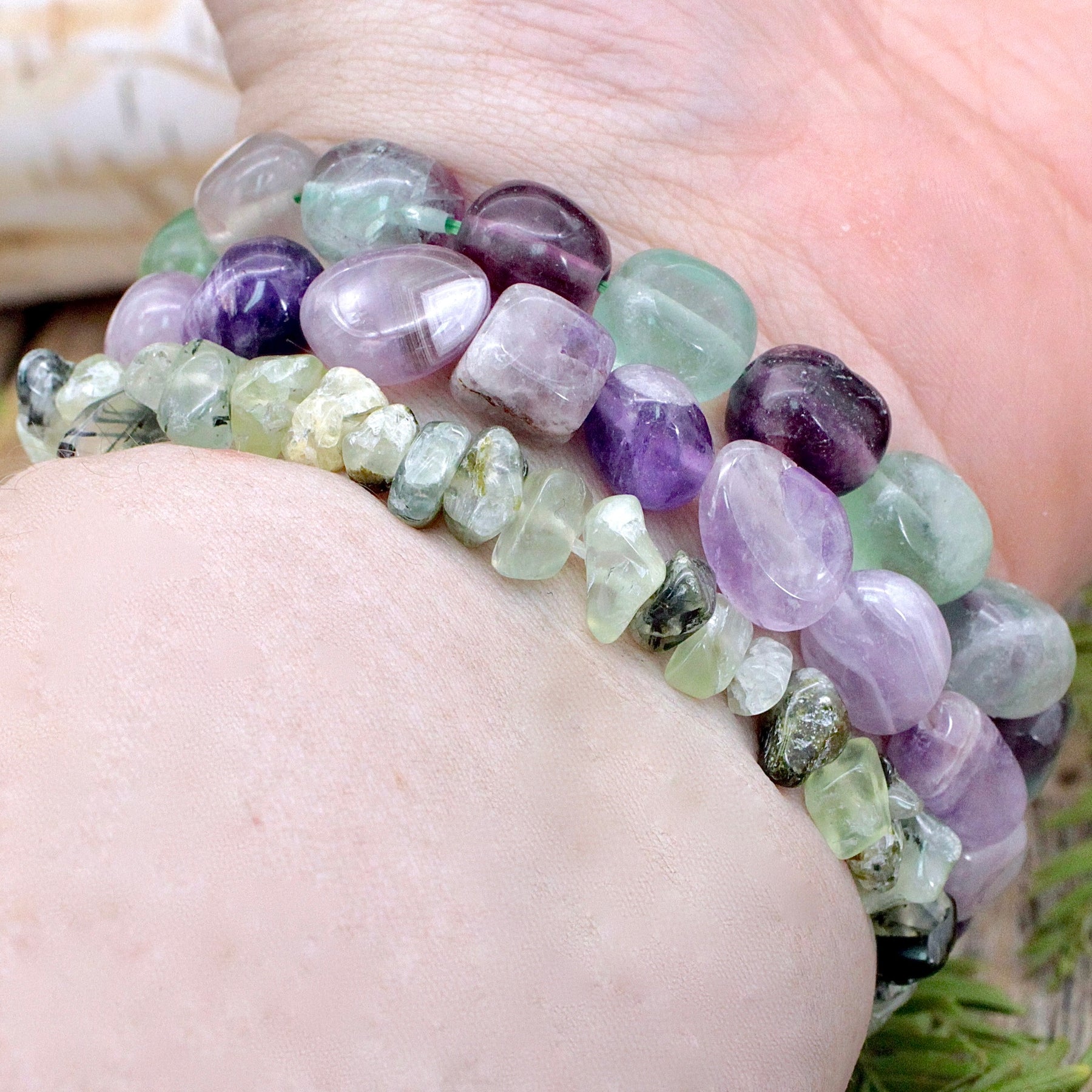 Each set comes with an Amethyst tumble bracelet, a Prehnite chip bracelet and a Fluorite tumble bracelet.