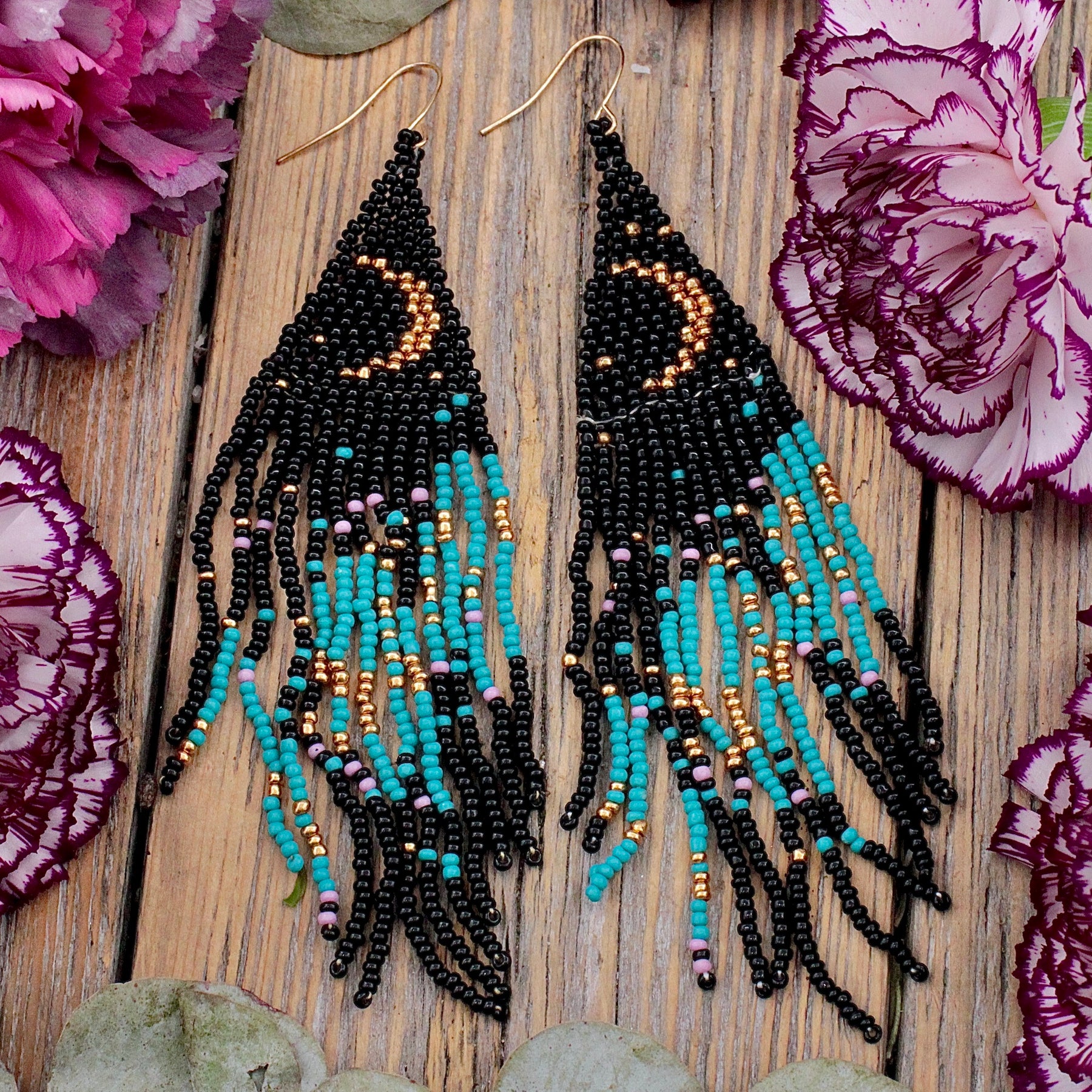 Add style and movement to your look with these Beadwork Fringe Earrings. Available in Evil Eye (a protective symbol) or Crescent Moon designs, these beautifully crafted earrings make a lovely gift for the fashion forward person in your life.