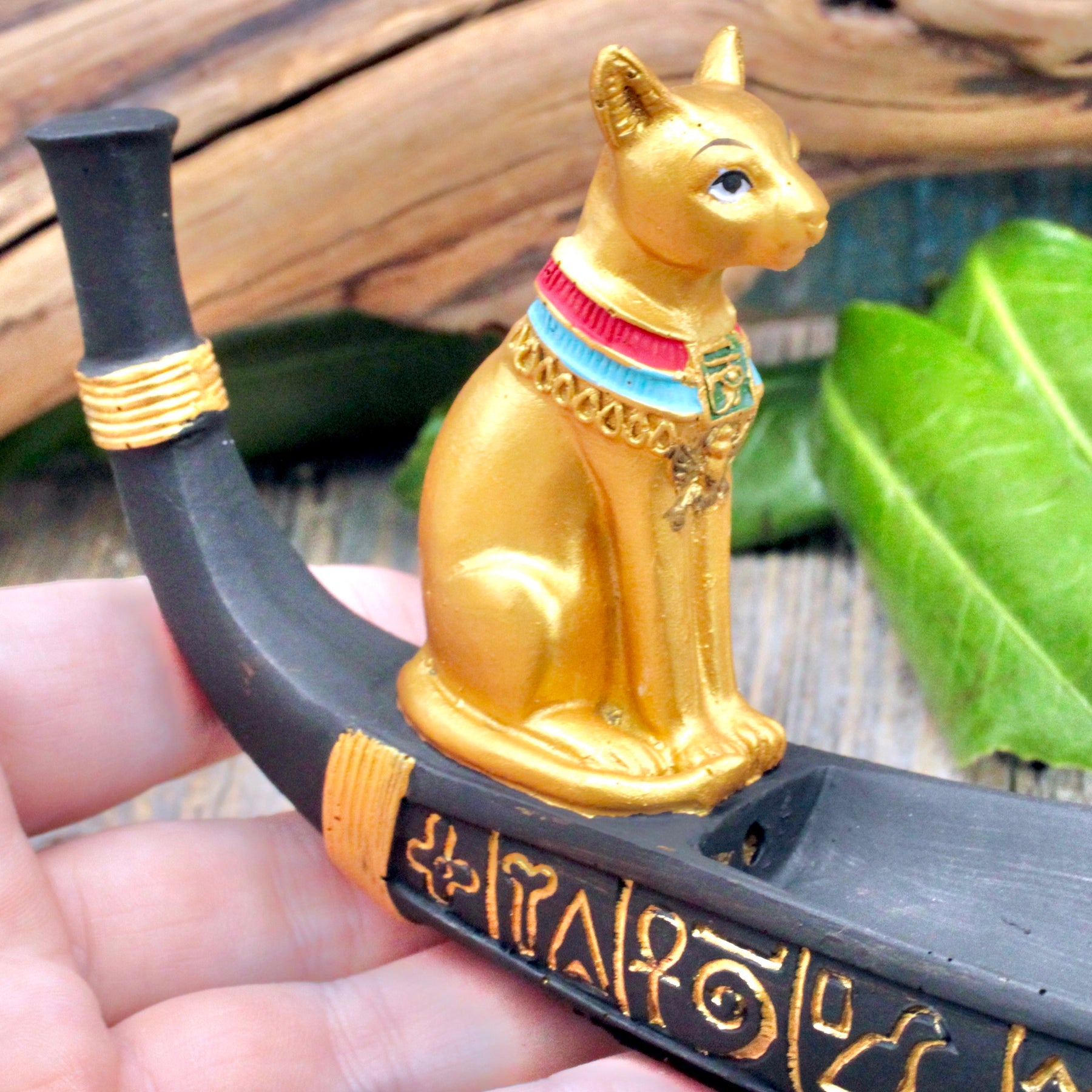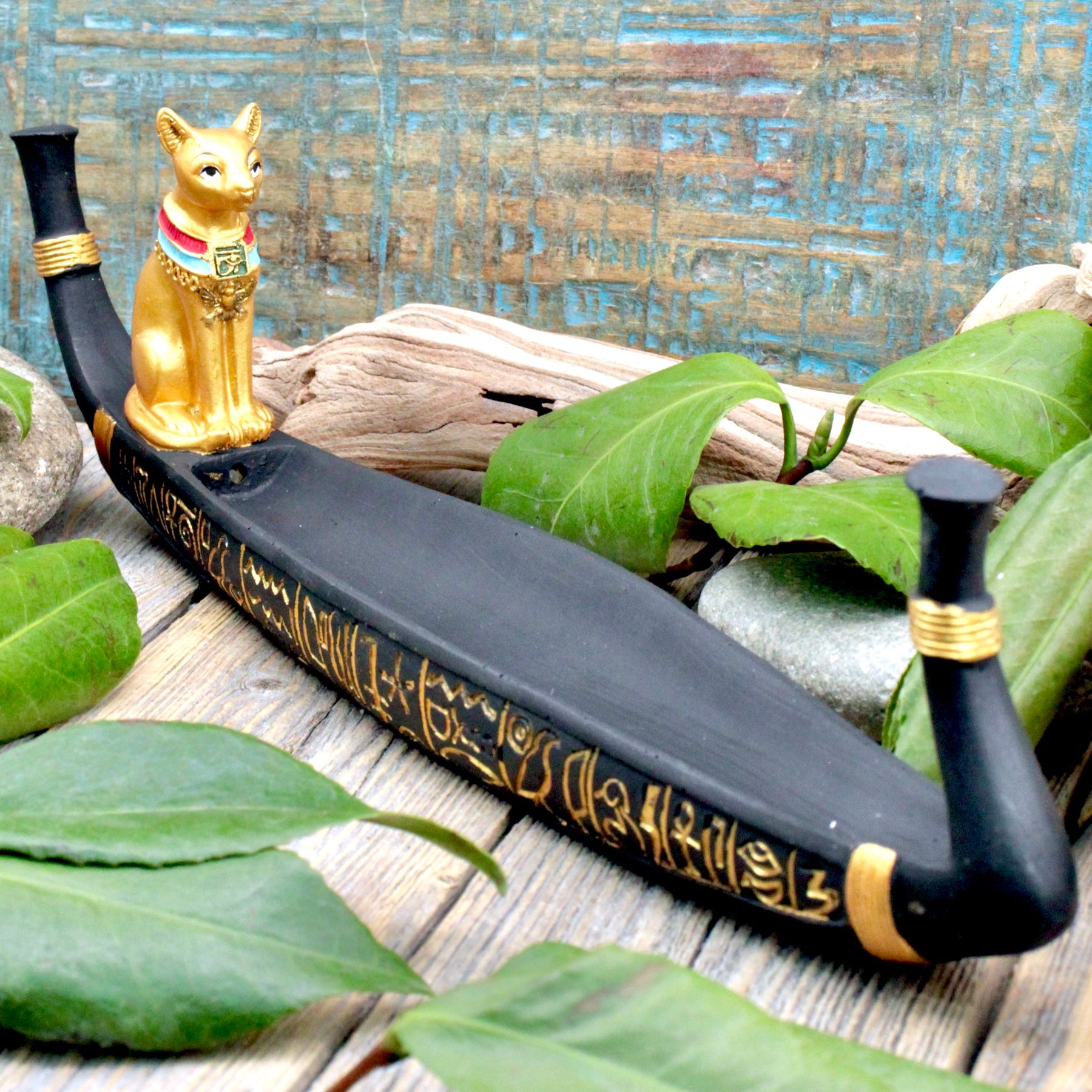 Invoke the energy of Bastet with this exquisite Bastet on Boat Incense Holder. Crafted for spiritual enthusiasts, it adds a touch of ancient mystique to your sacred space. Explore mystical ambiance now.