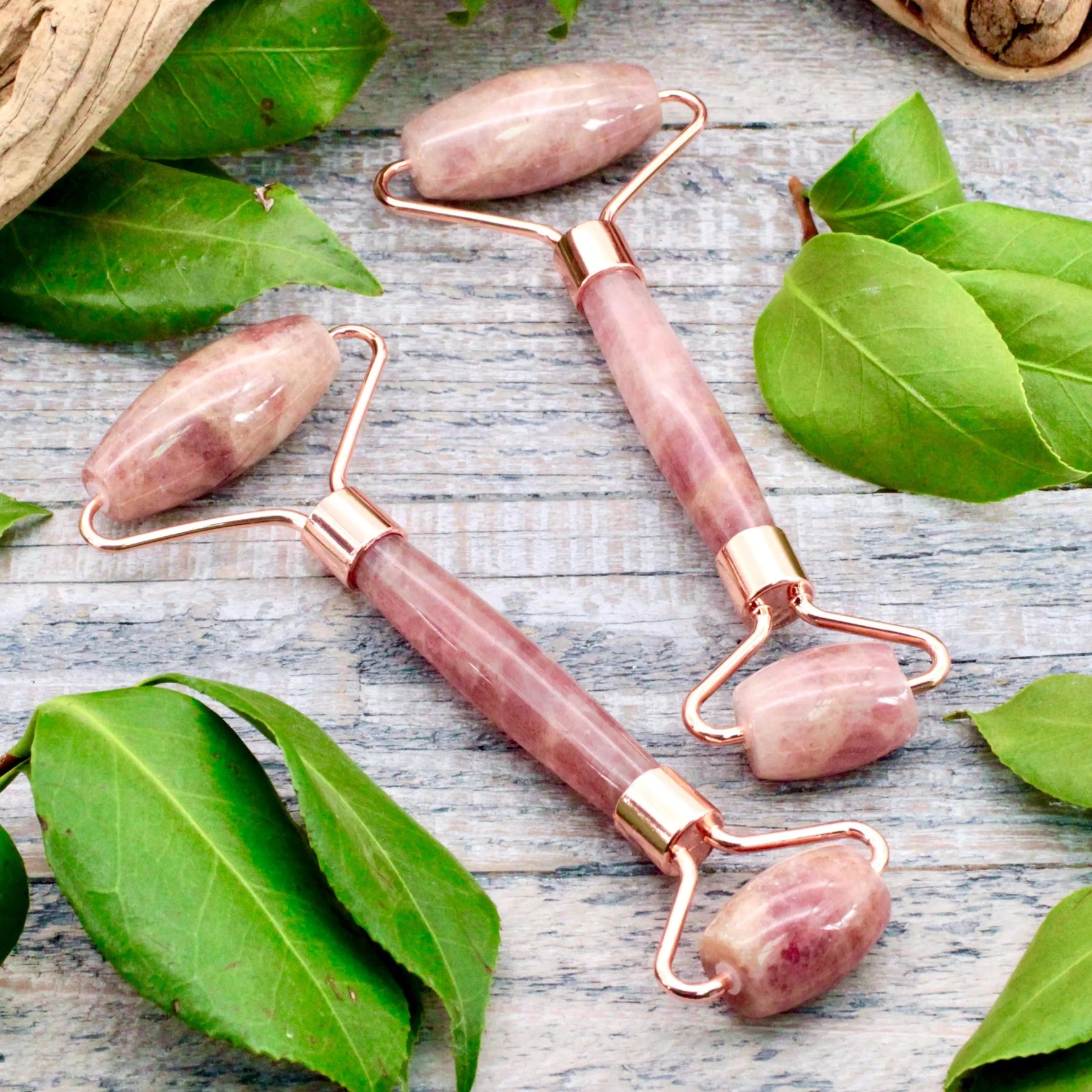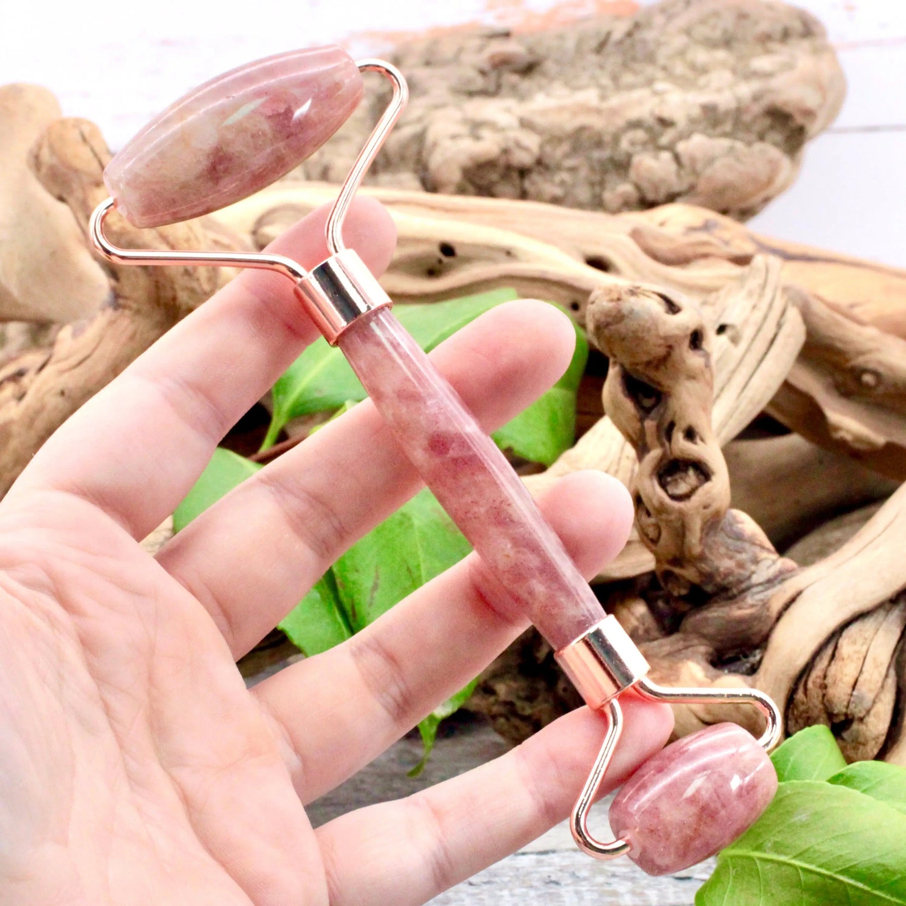 Balance your energies with this Strawberry Quartz facial roller. Strawberry Quartz is a stone that helps us focus on self-improvement and restoring balance to our chakras and our overall energy.
