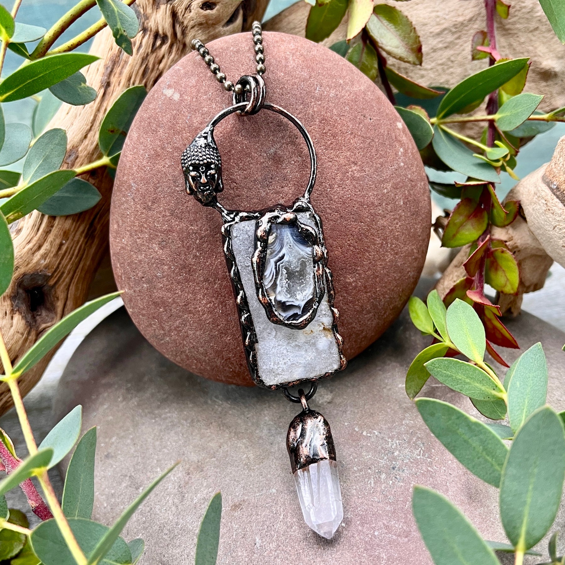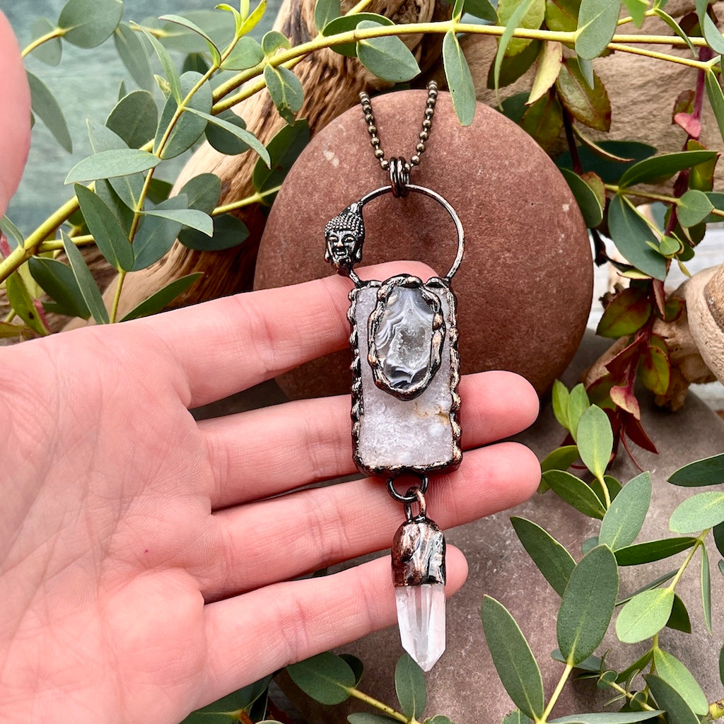 Manifest confidence with this Agate Druzy Necklace. Done in a beautiful bronze finish and accented with a dangling Quartz Point, this necklace adds bohemian flair to any outfit.