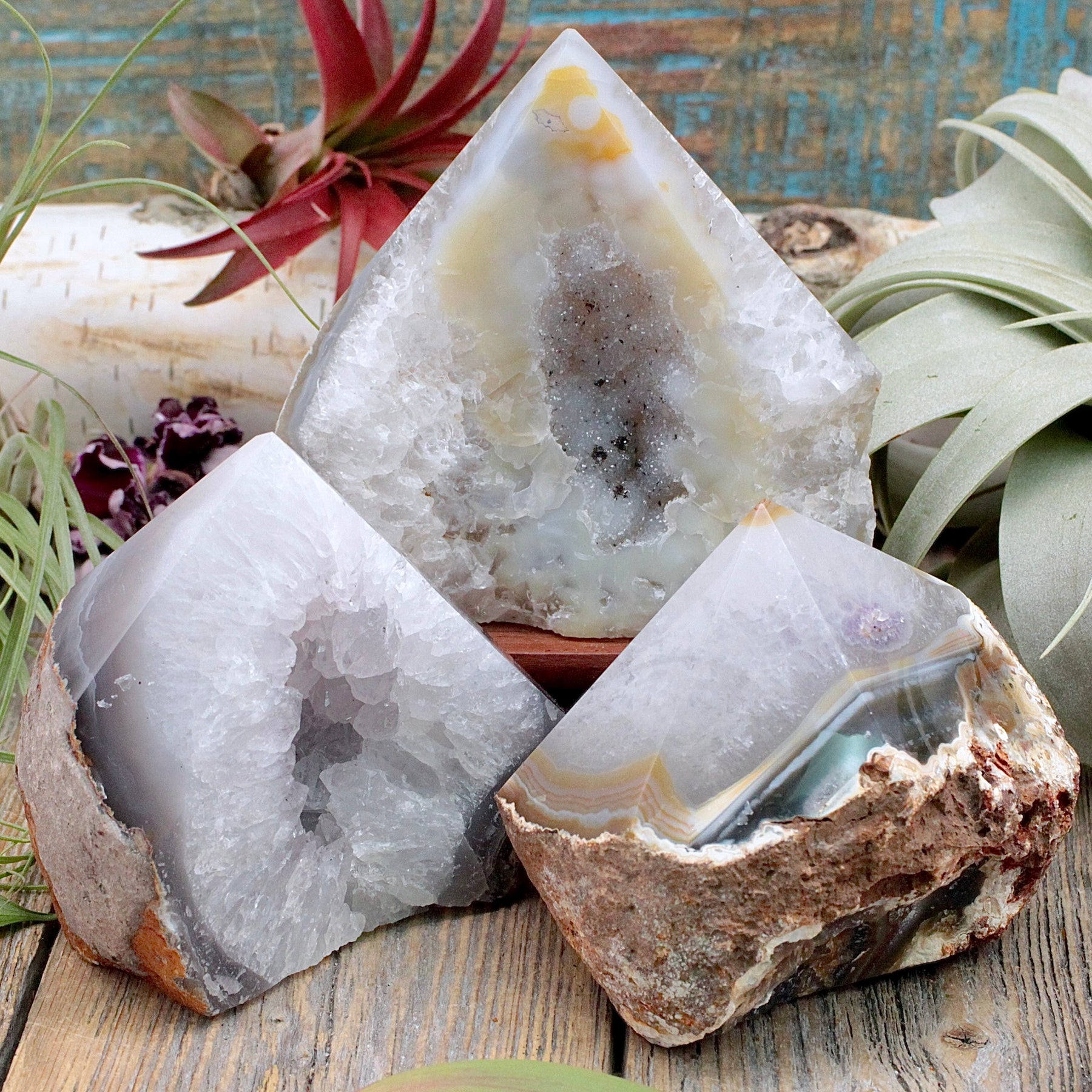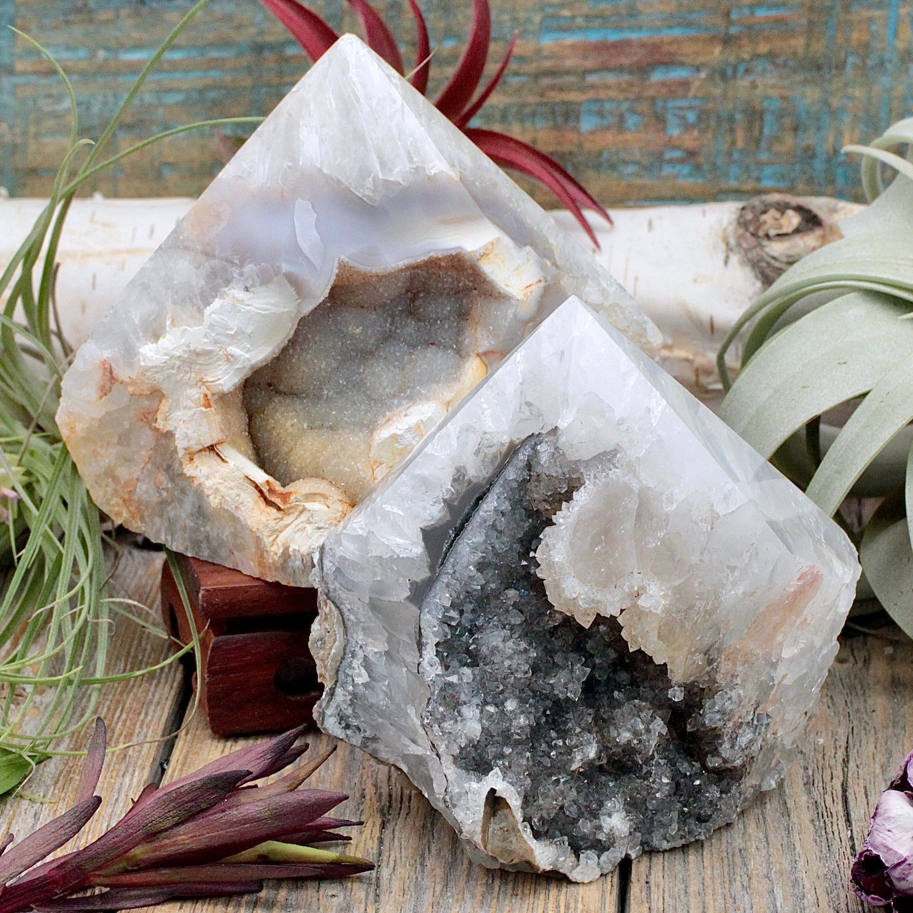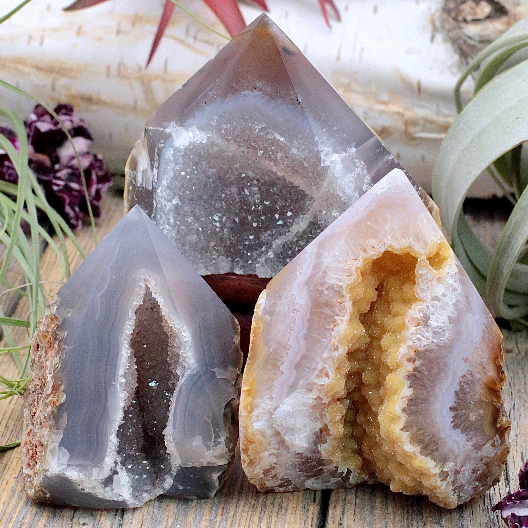 Manifest growth and confidence with these Agate Druzy Power Points. This sparkly and powerful point shows off the stones natural beauty while also offering a polished point which works to focus and direct the energy of the stone.