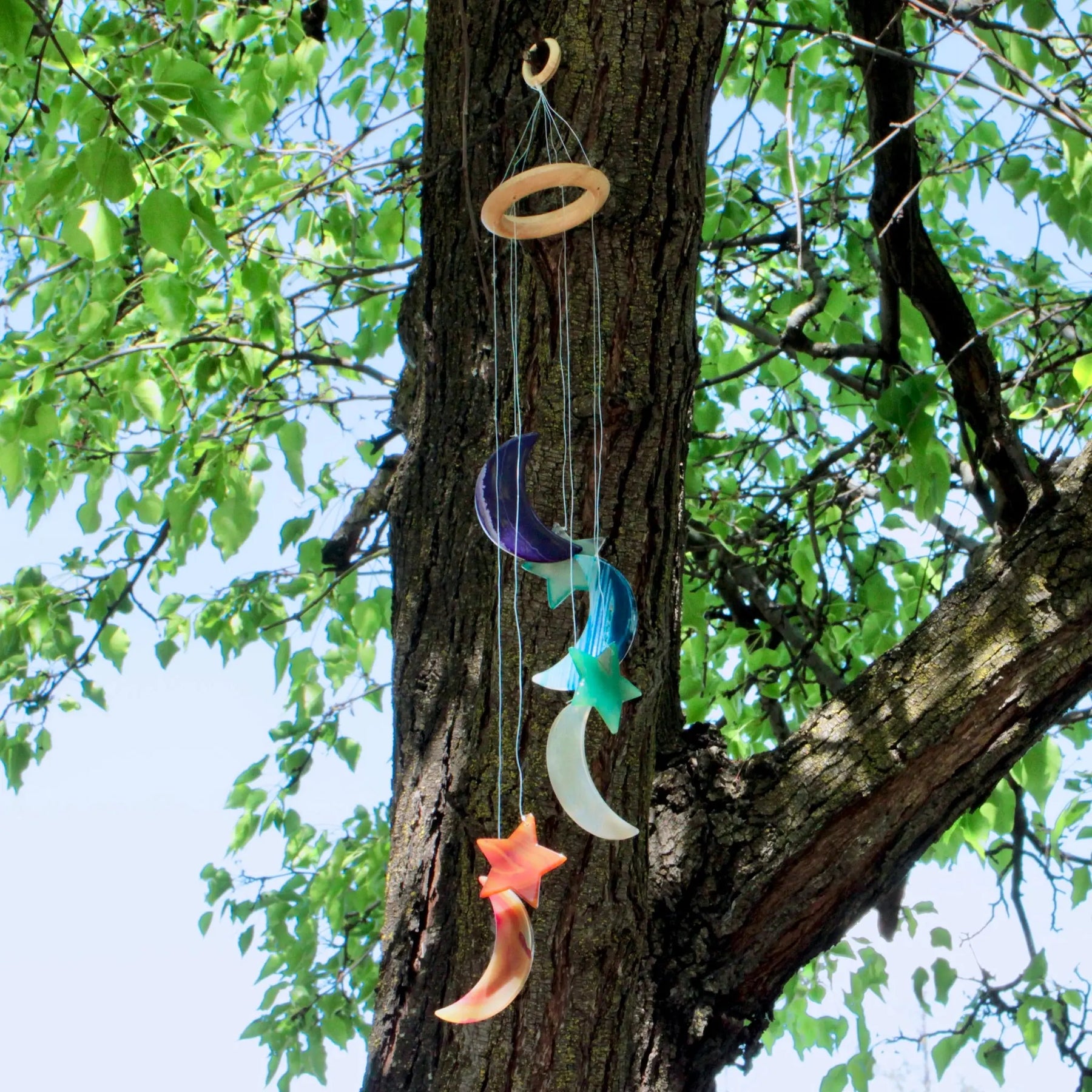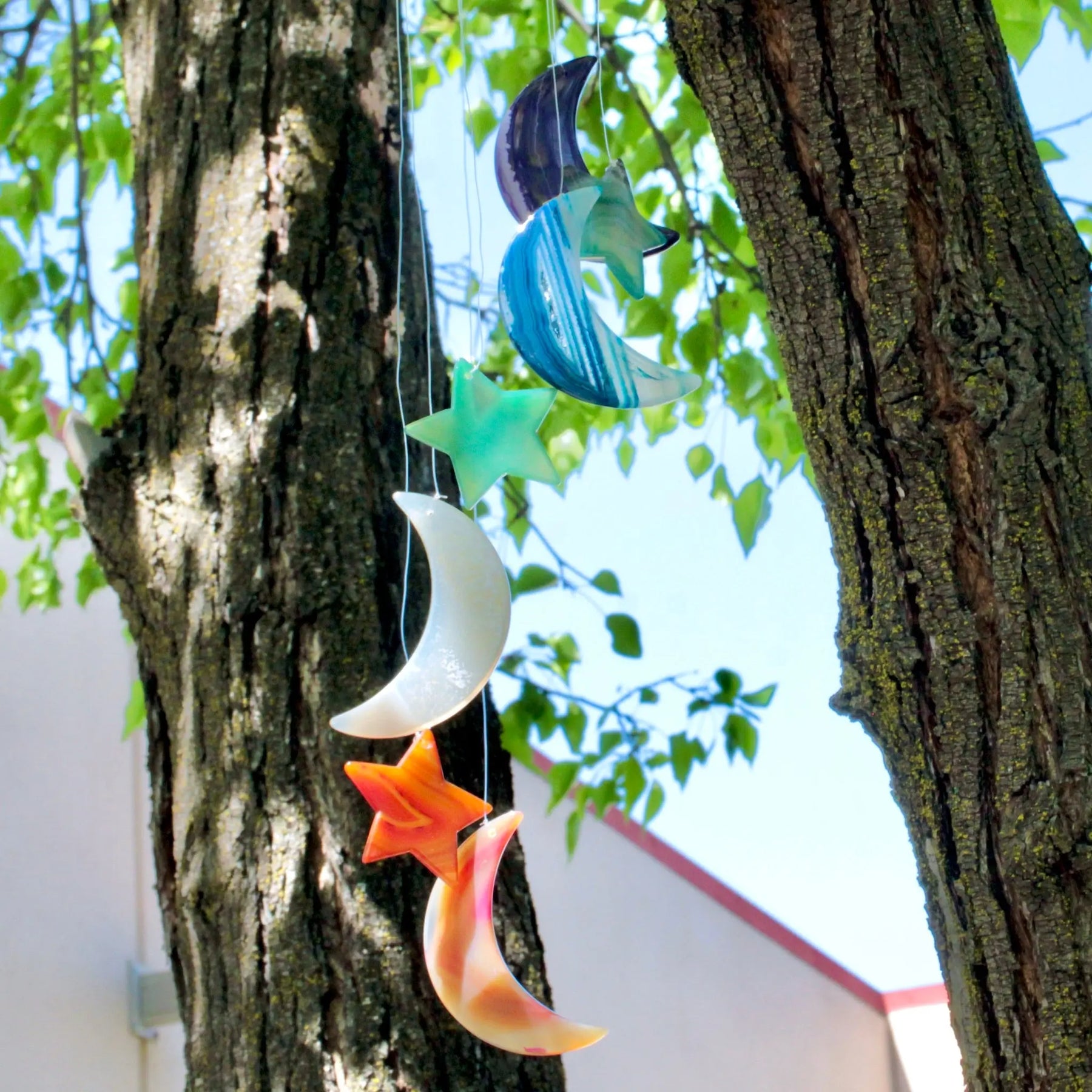 Relax with the gentle sounds of the wind in this Agate Stars and Moons Windchime. The delicate sound of the agate stars and moons as they shift if the wind is sure to impart the calm grounding the stone offers.