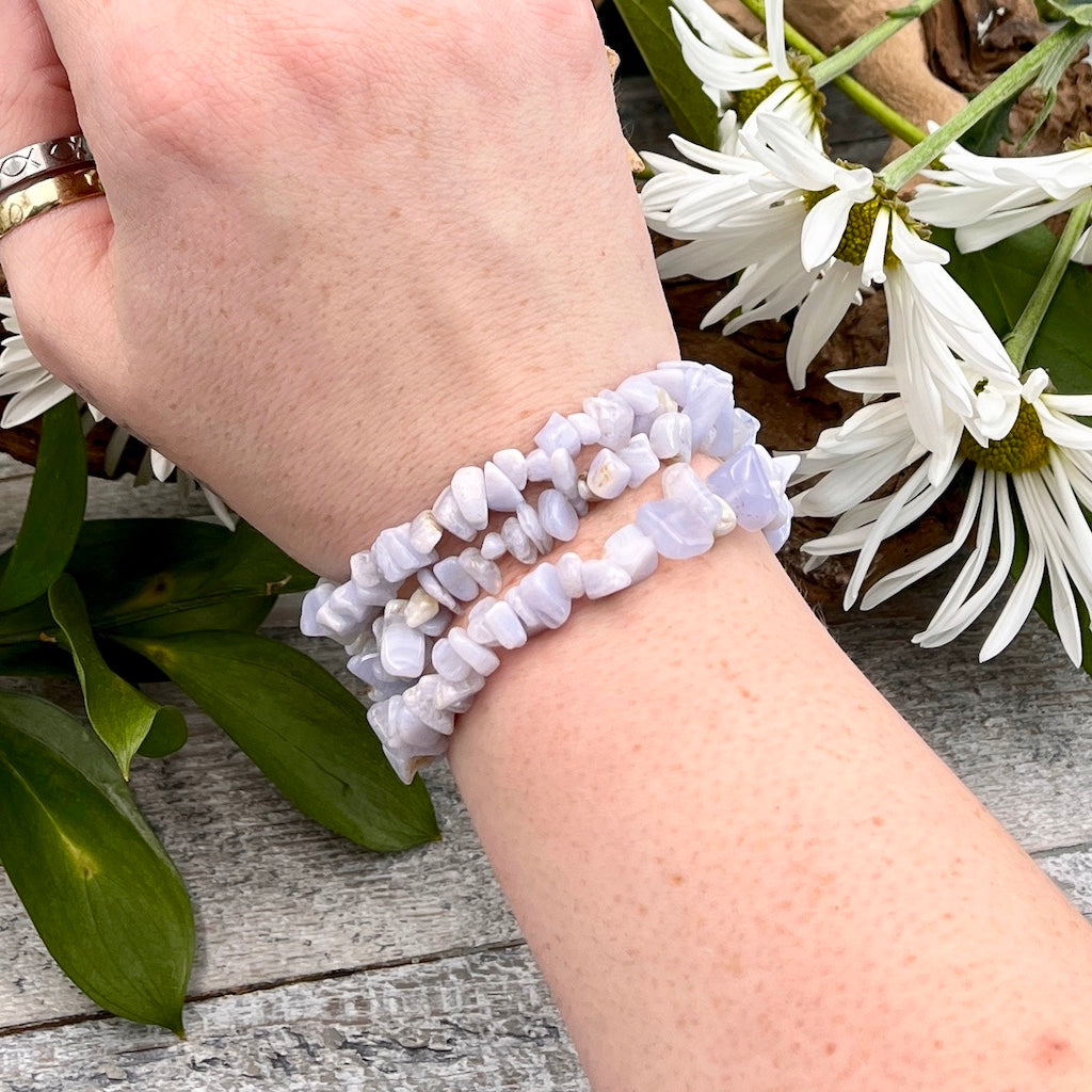 Embrace the calm soothing energy of a Blue Lace Agate Bracelet. This chip bead bracelet is a cute, affordable way to add a little positivity to your day.