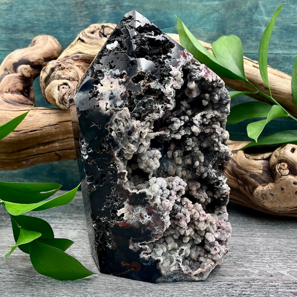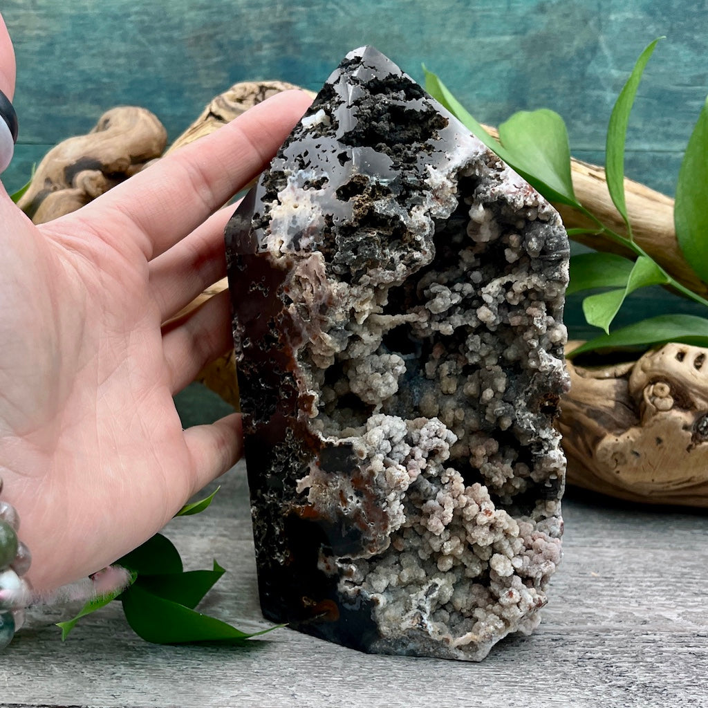 Facilitate personal and spiritual growth with this Huge Druzy Agate Tower. With sparkly botryoidal structure this unique stone is ready to help you add positive, protective energy to your home.