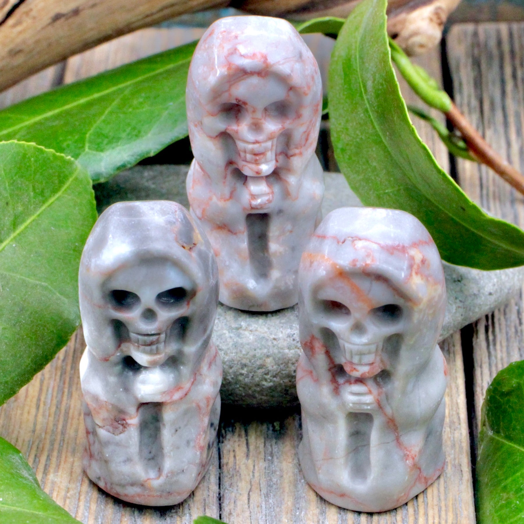 Bring in a little spooky decor with this Cloaked Skeleton Carving. Each stone offers a different energy that can befit your home and life. Keep it on an alter or in a spooky season decoration.