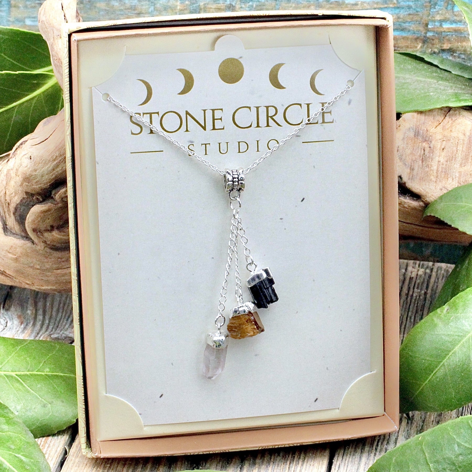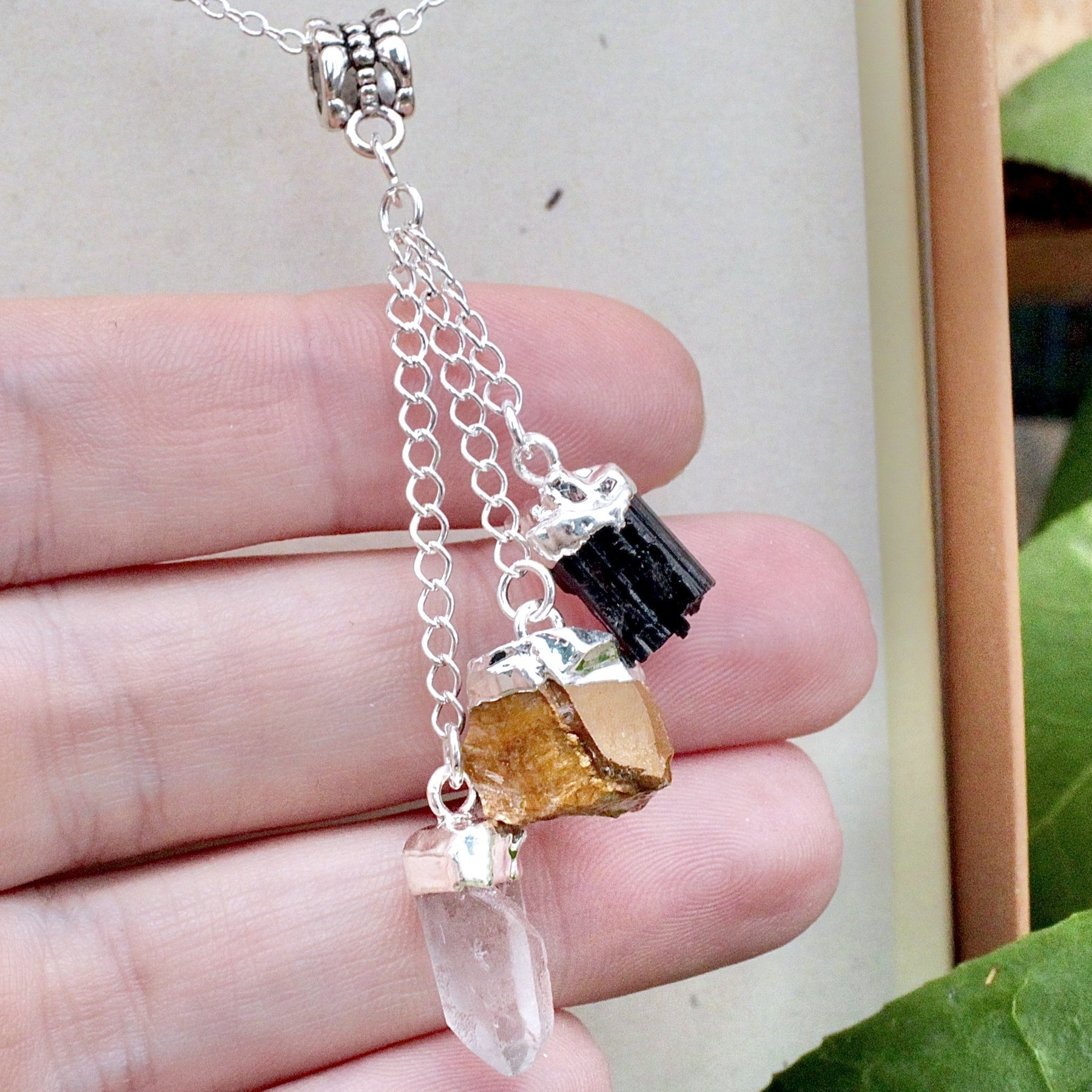 Elevate your energy with this Protection Triple Drop Pendant. Amplify clarity, courage, and protection in this harmonious gemstone combination of Tiger's Eye, Black Tourmaline and Quartz.
