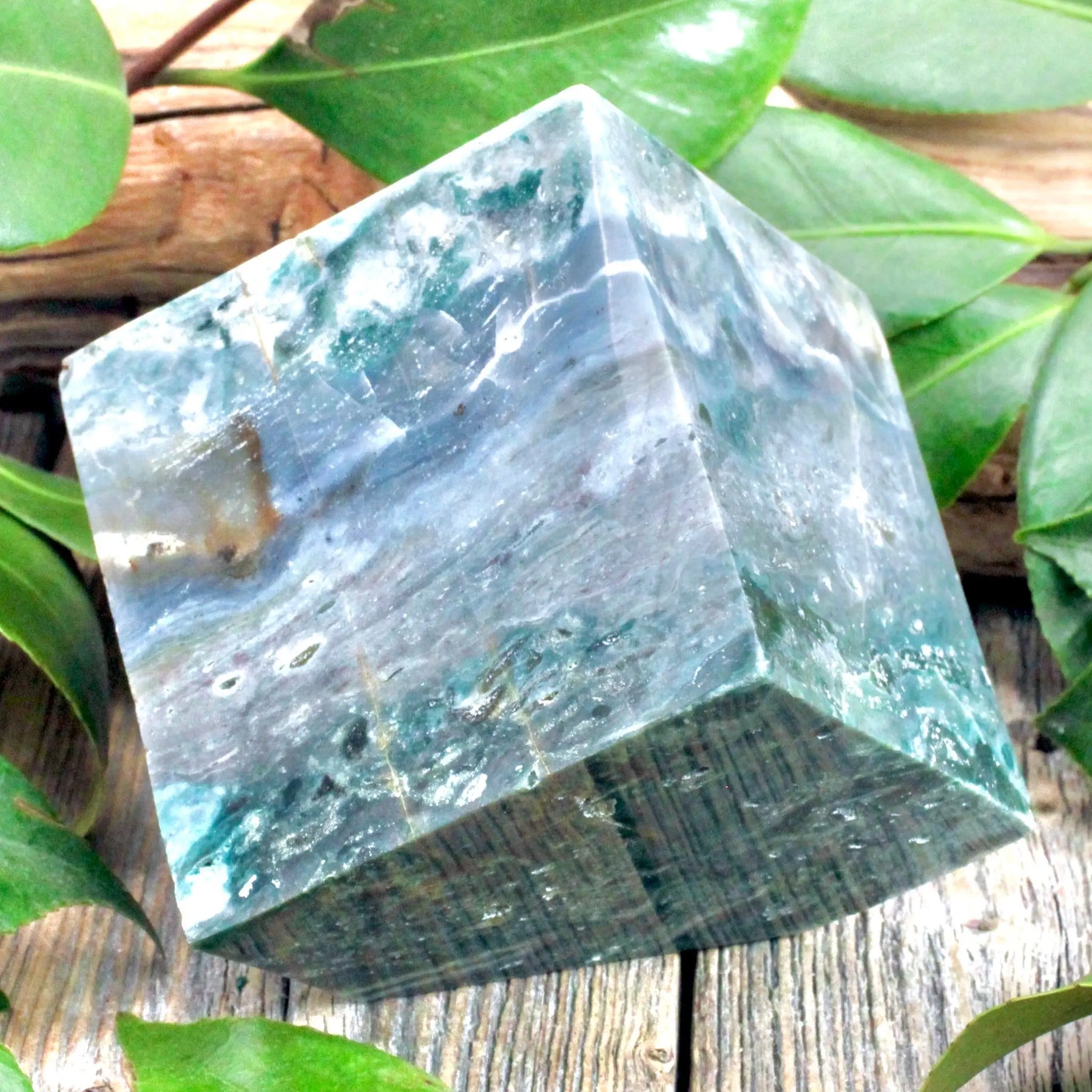 Manifest wisdom and joy with this Ocean Jasper Cube. Ocean Jasper emanates ancient knowledge and releases feelings of negativity from our hearts. This Ocean Jasper cube is a solid representation of the energies of Ocean Jasper.