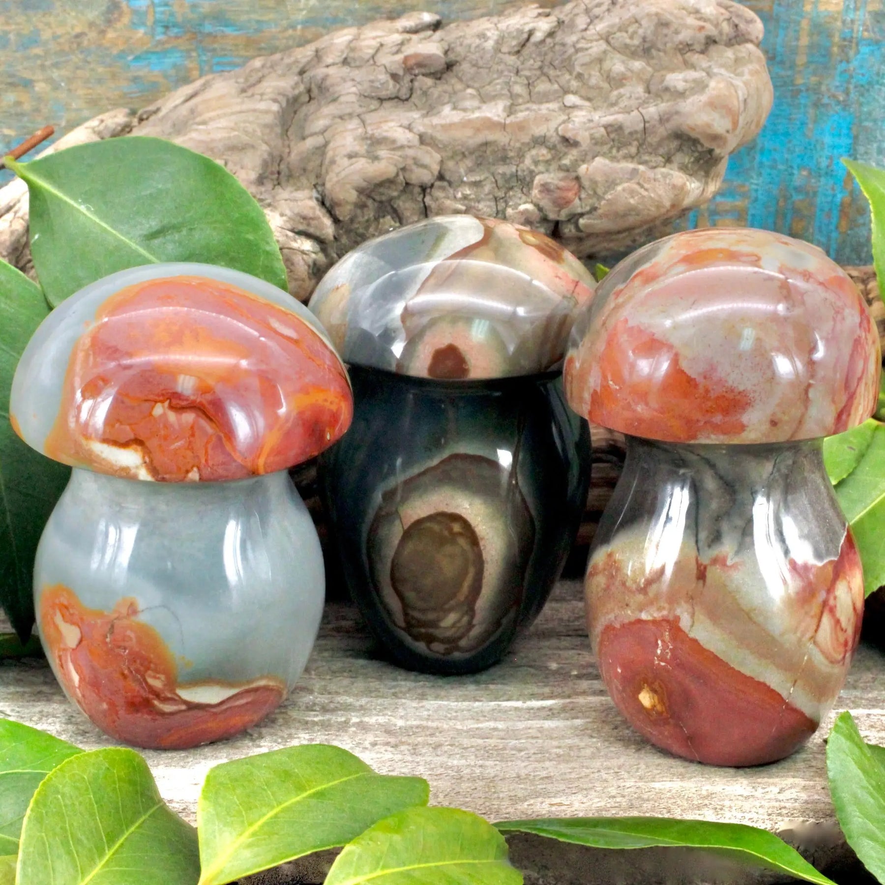 Call in passion and vitality with a Polychrome Jasper Mushroom. With a wide range of earthy colors, and vivid contrasts, these mushrooms add warmth to any space.