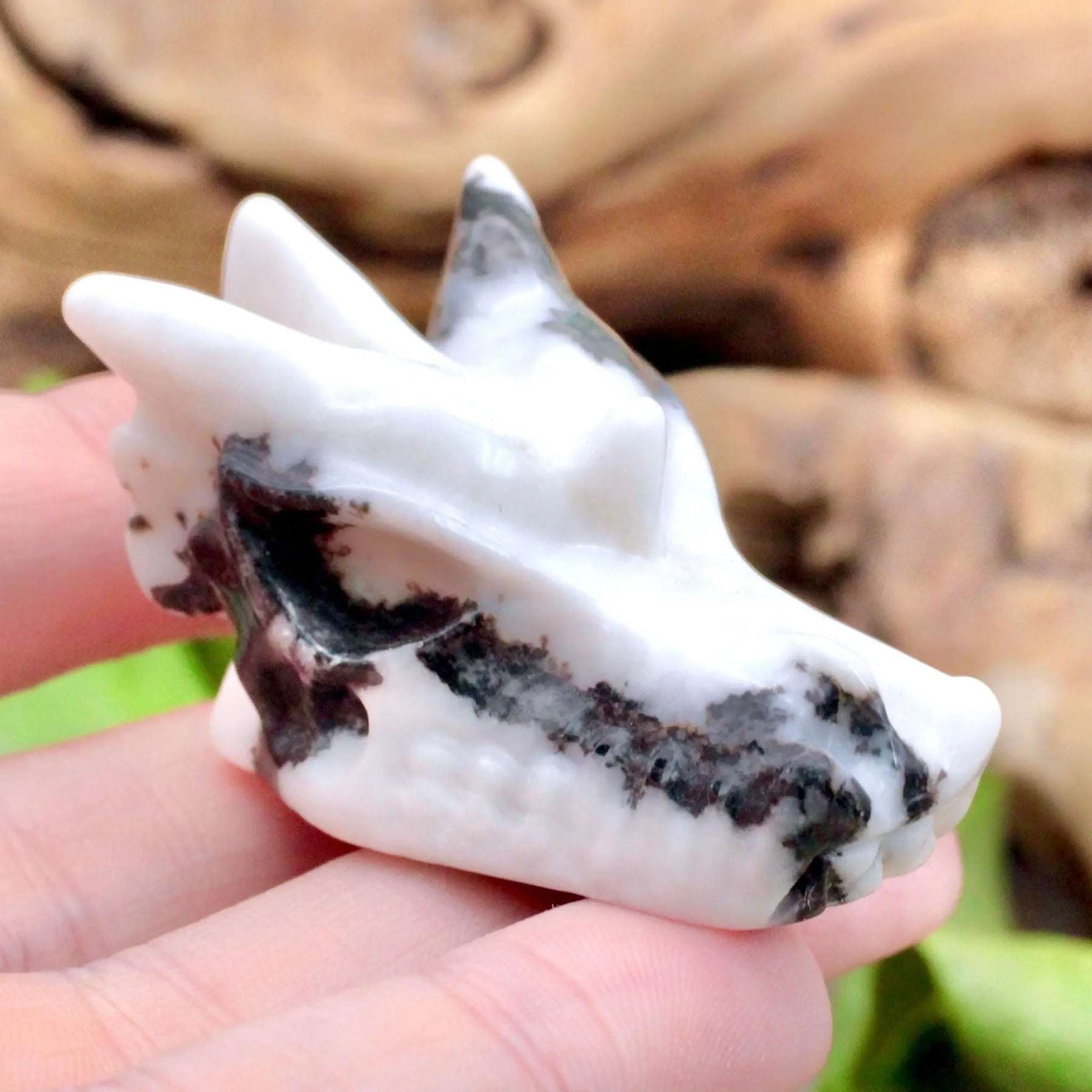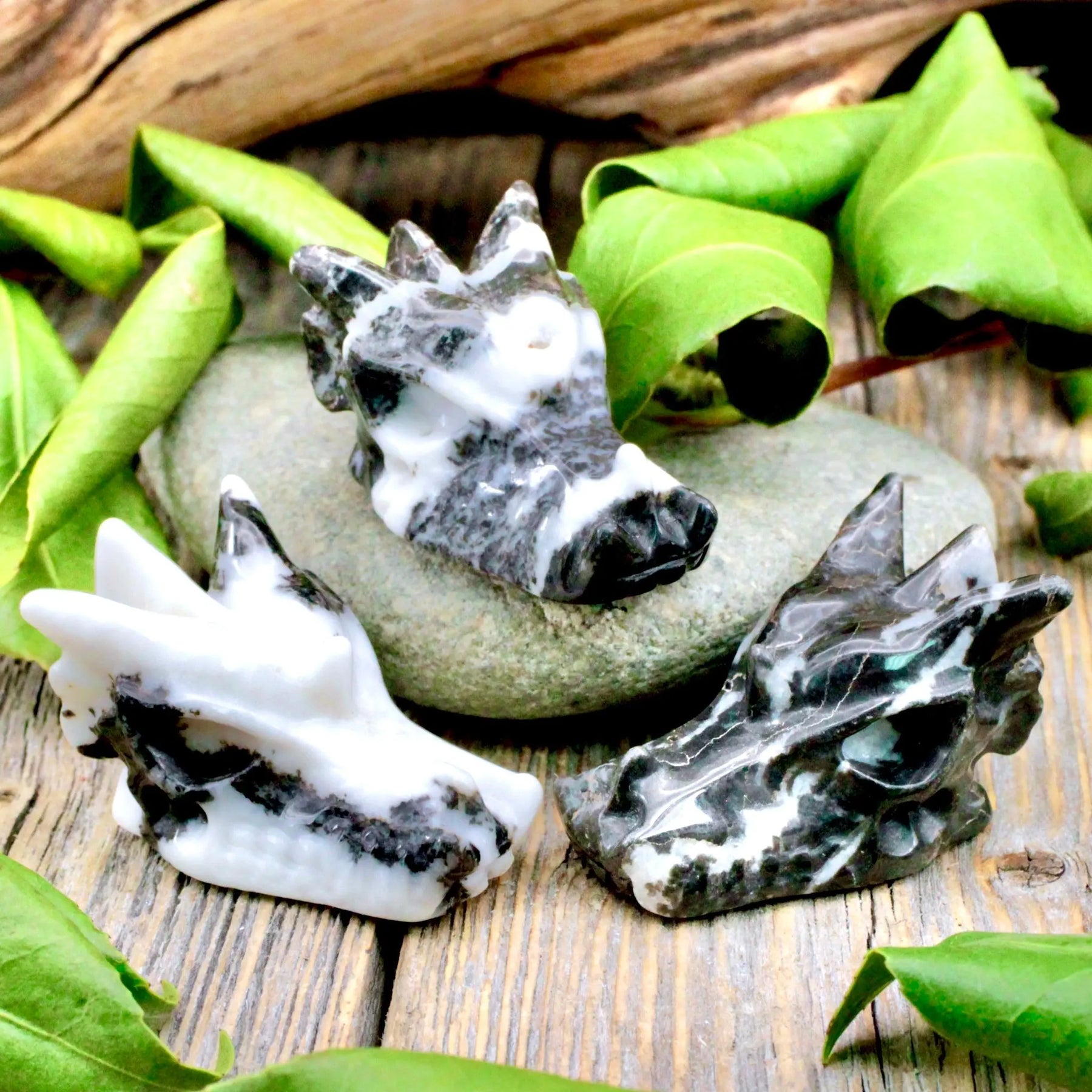Face challenges head on with this Zebra Jasper Dragon Skull. Zebra Jasper doesn't just look cool. It offers strength in the face of adersity and drive to accomplish your goals.