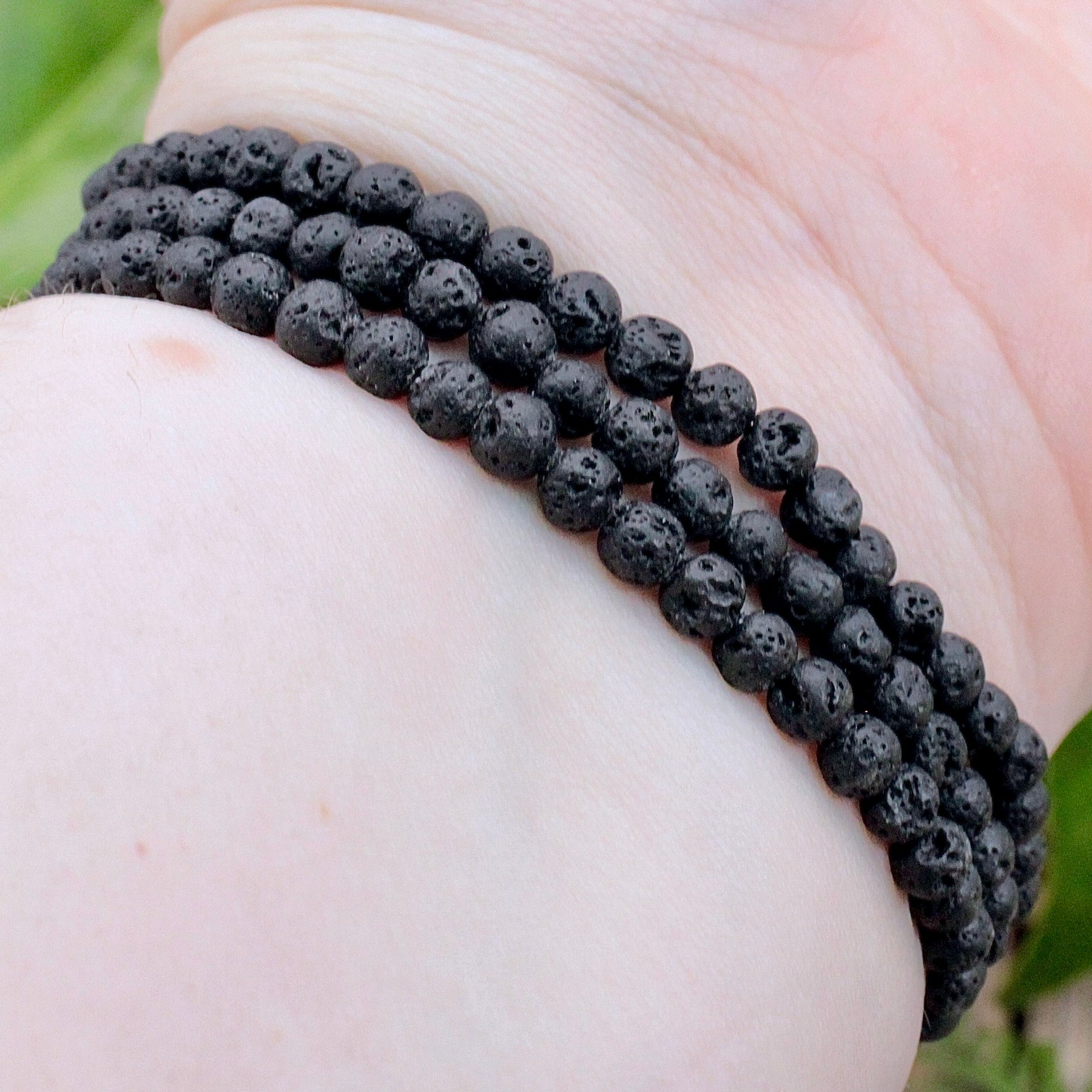 Hand shown for scale. Each bracelet will fit an approximately 7" wrist and beads are approximately 4mm in diameter.