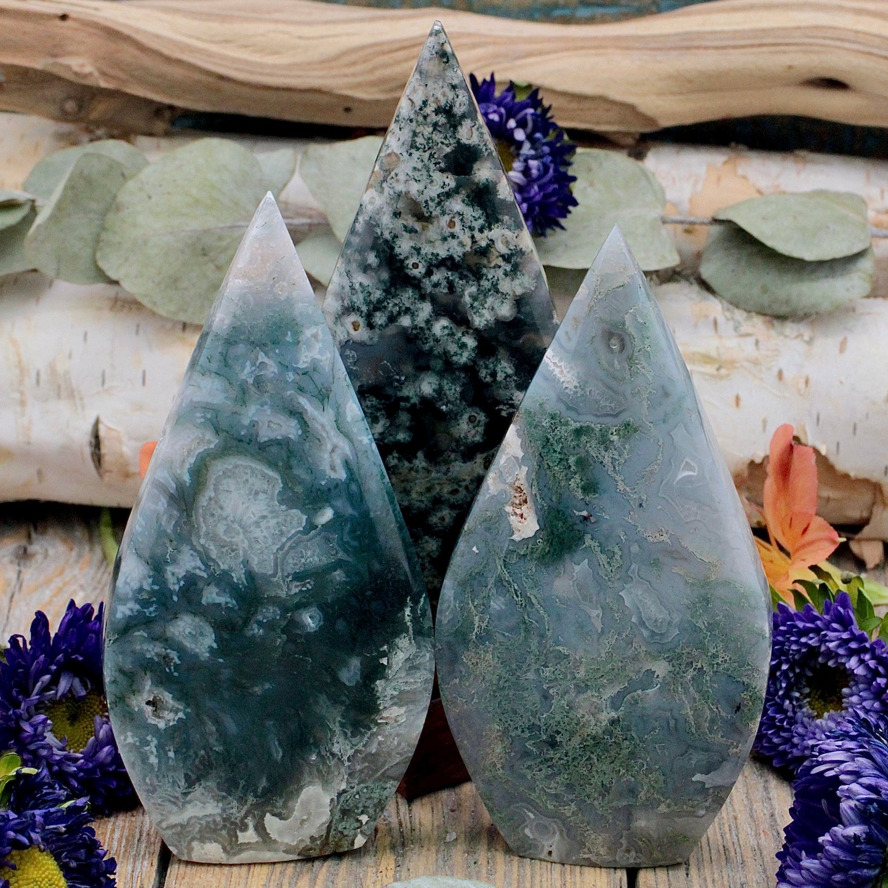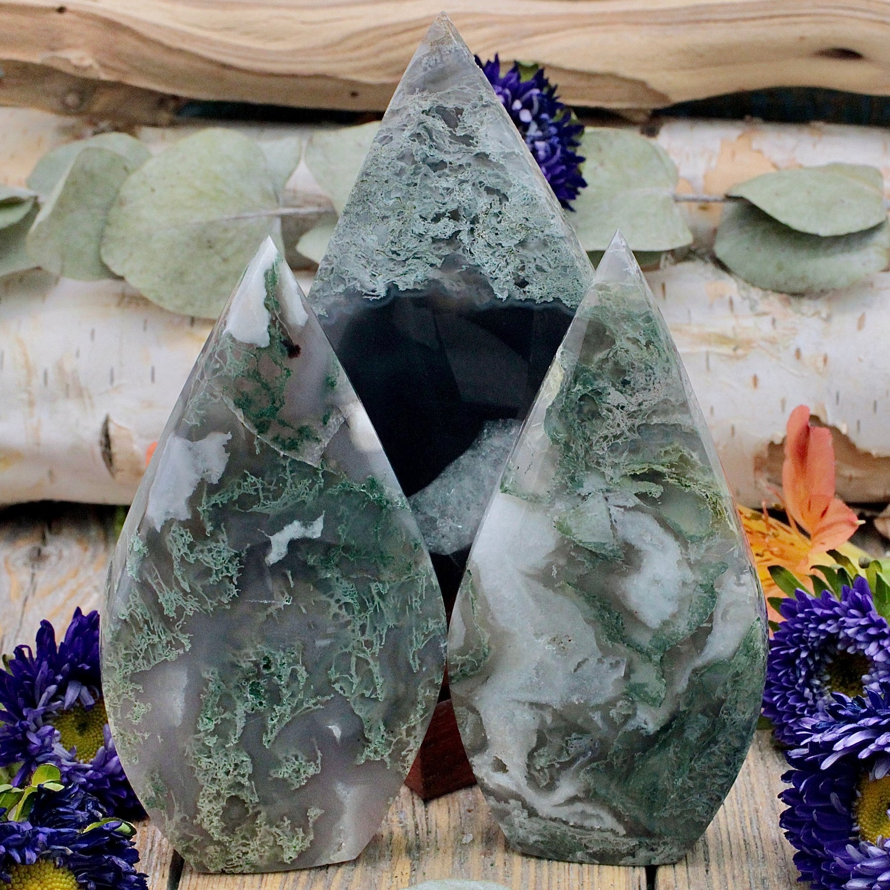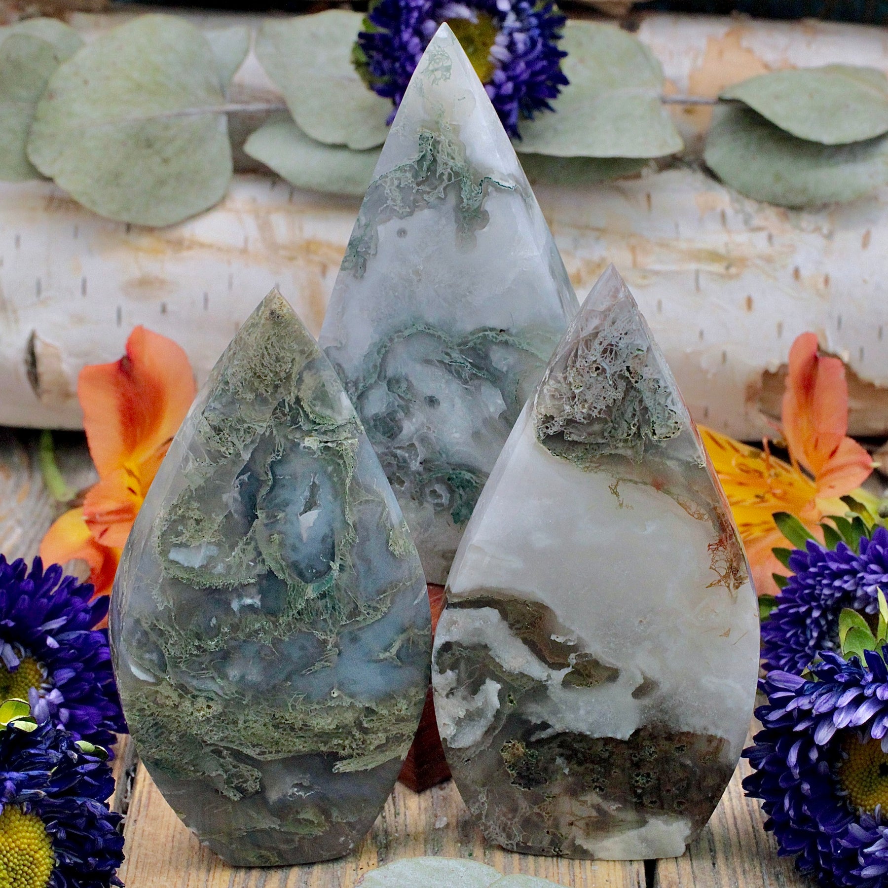 Moss Agate offers many gifts. It is a stabilizing stone that helps balance emotions, relieving stress and fears. Known as a birthing crystal, it supports midwives in their work, helping to ease pain and ensure a healthy delivery. Deeply healing, it supports both emotional and physical health, facilitates healing and helps speed recovery. Moss Agate attracts good fortune and abundance and refreshes the soul. It inspires hope, trust and belief in your dreams and ideals.