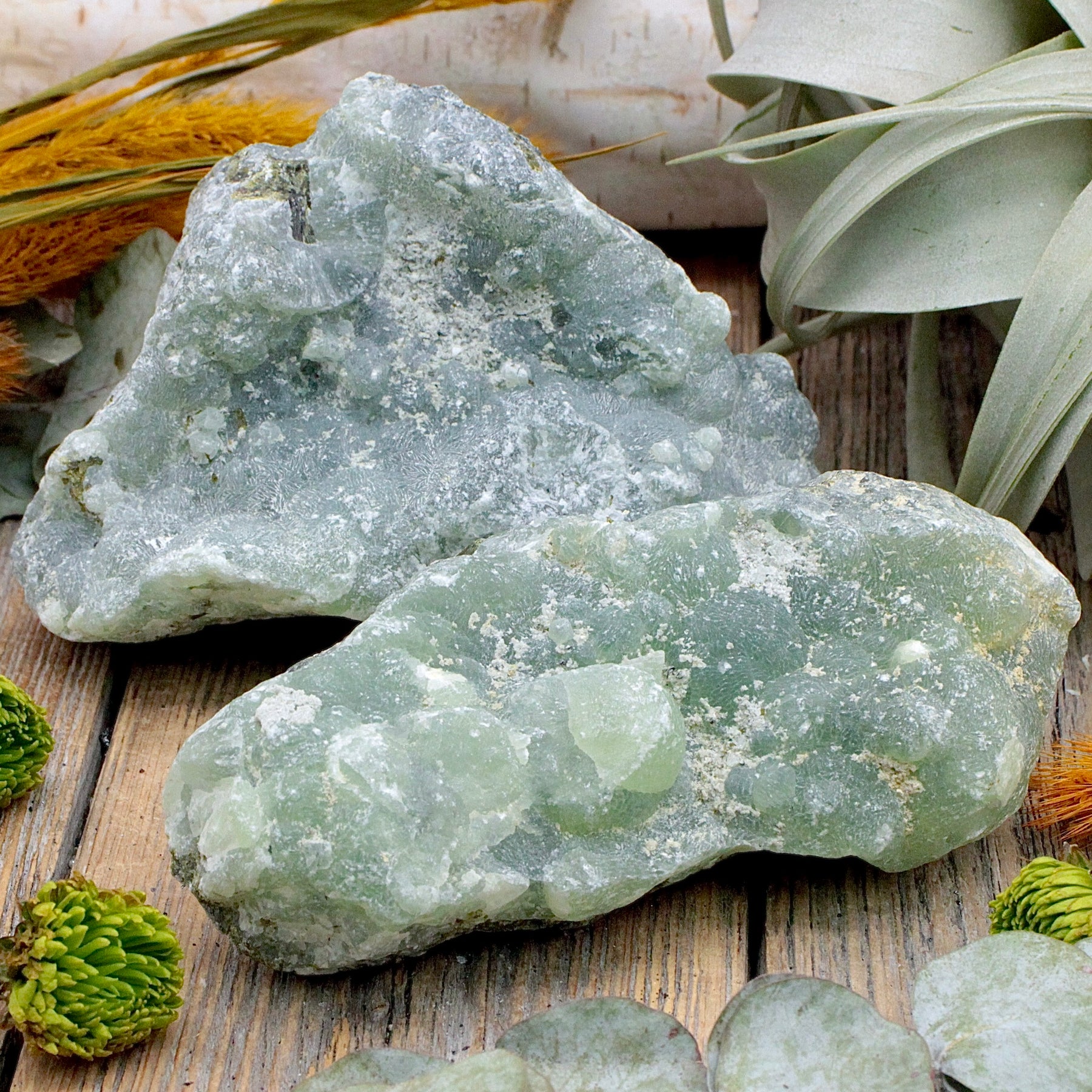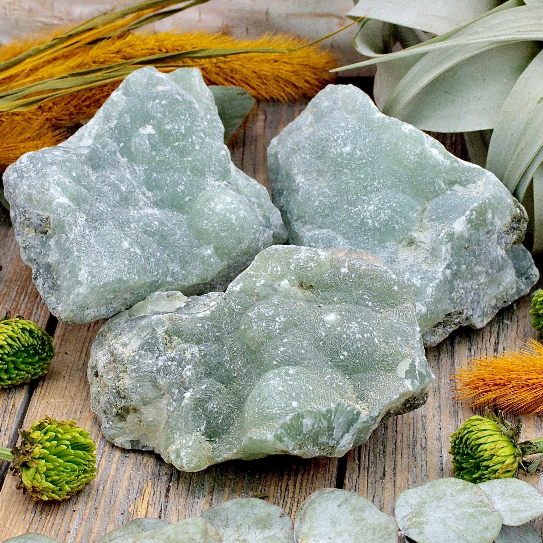 Enhance harmony in your space with a Prehnite Rough Chunk. These rough specimens really show off the stone's natural beauty, and some pieces even have a botryoidal texture.