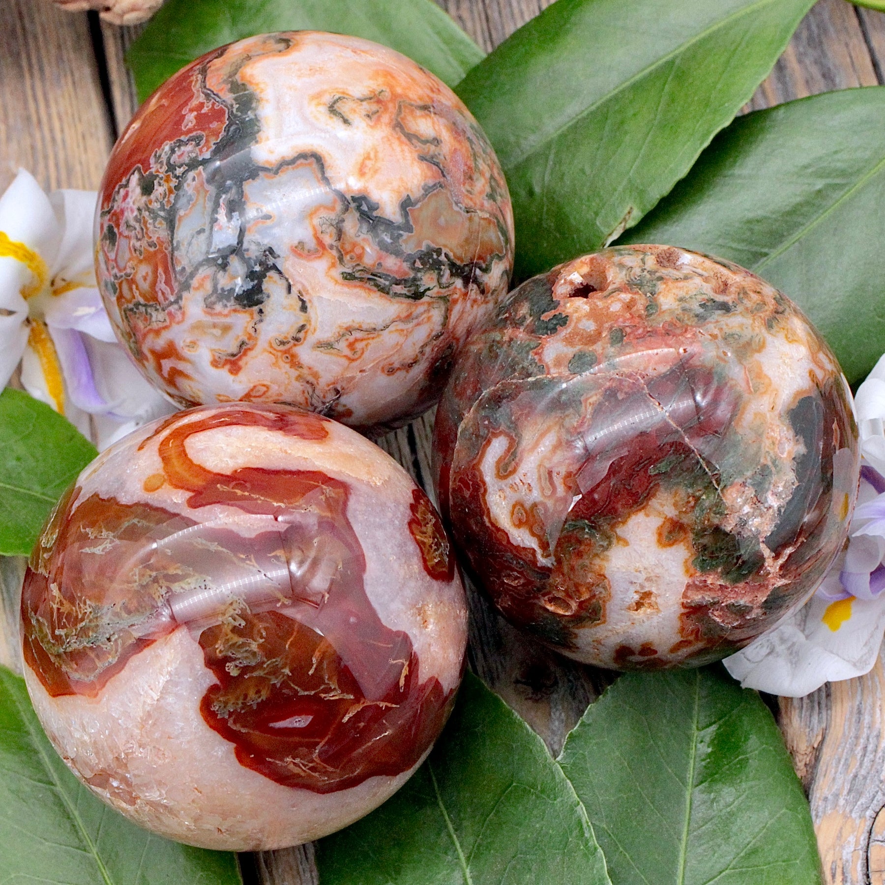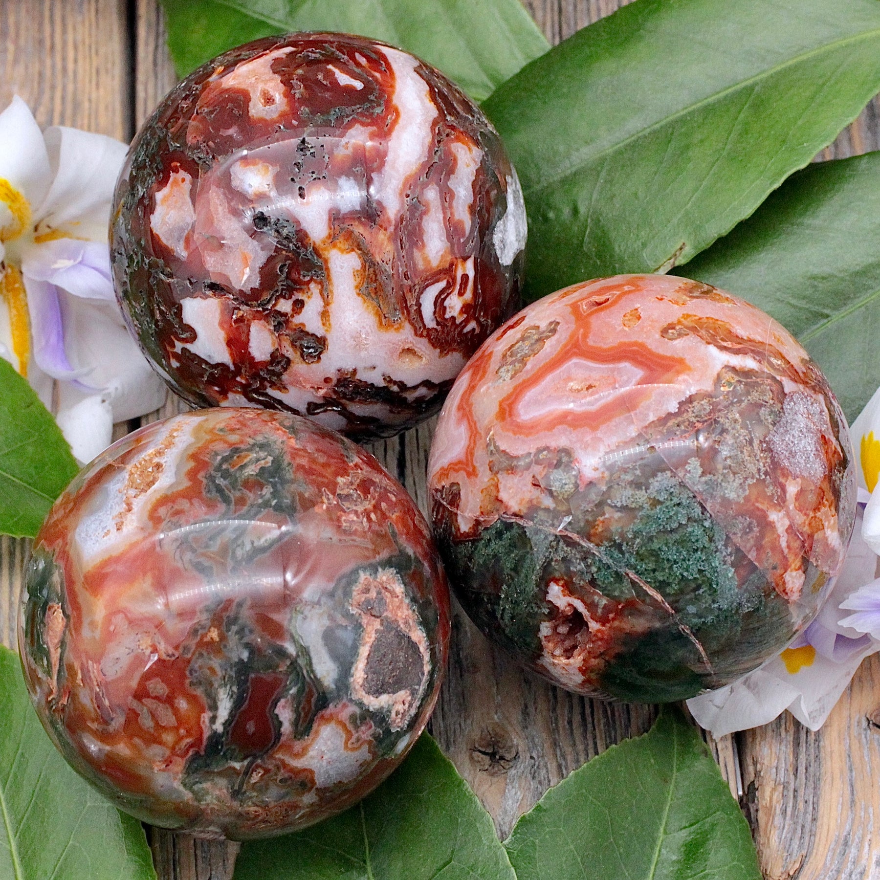 Wash away stress and fear with this Red Moss Agate Sphere. The lovely reds of this moss agate are stunning to look at. This lovely stone can offer us a calming energy to find peace in our lives.