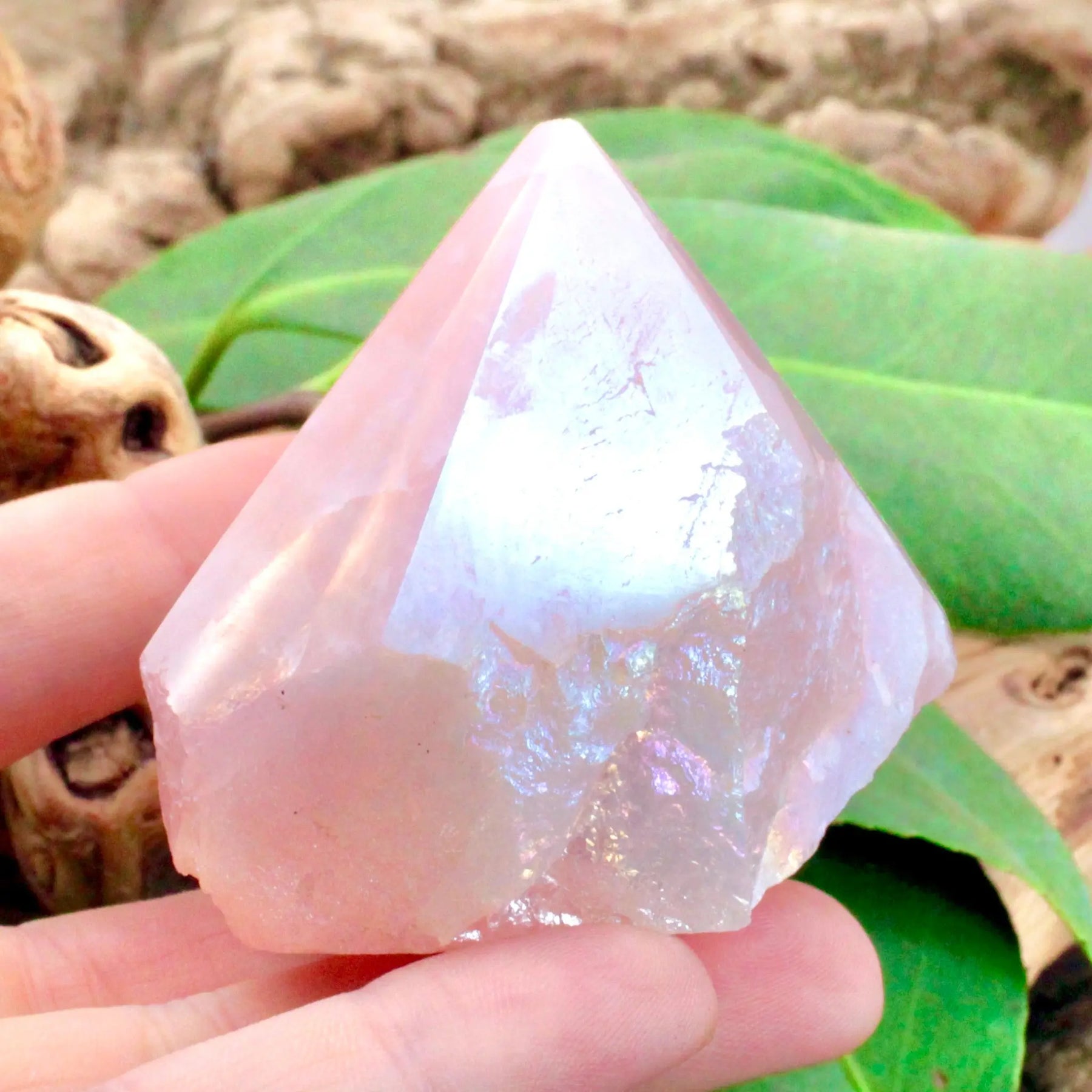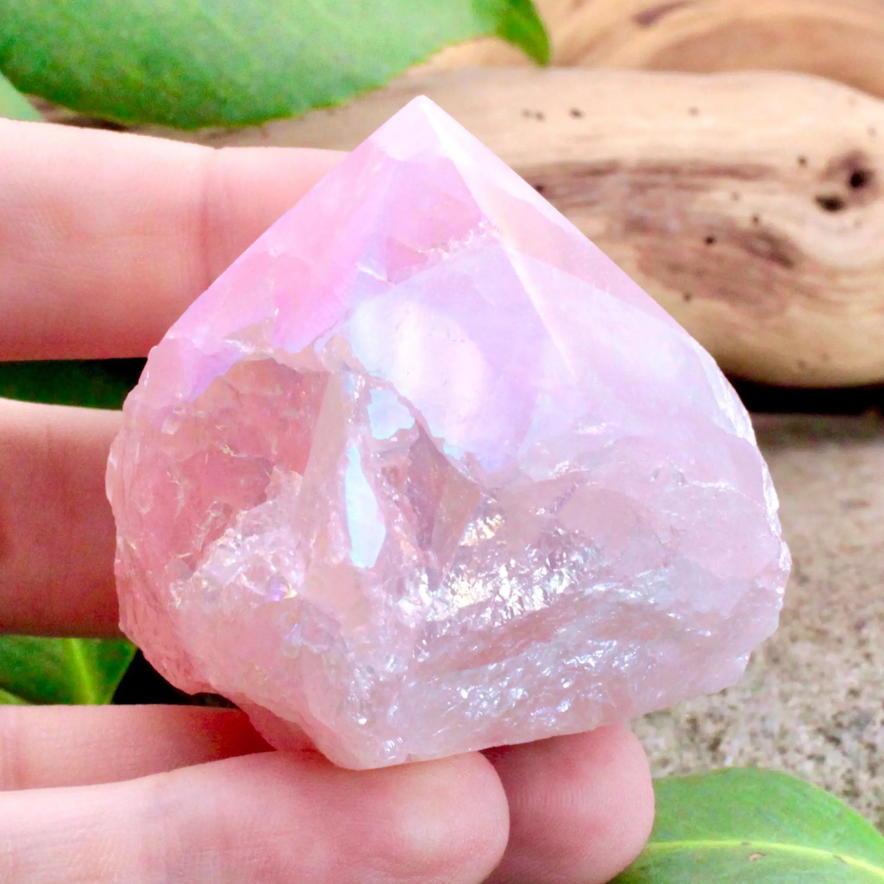 Aura Rose Quartz is a natural crystal, enhanced through a chemical process that super-heats and transfers ionized particles of metal to the crystal's surface, creating a permanent molecular bond and changing the color of the stone. The quartz retains its inherent qualities, and the precious metal enhances the crystal's already high vibration. It encourages connection with our authentic selves, dispelling limiting beliefs and behaviors, and freeing us to explore and embrace new experiences and new ways of seeing the world.