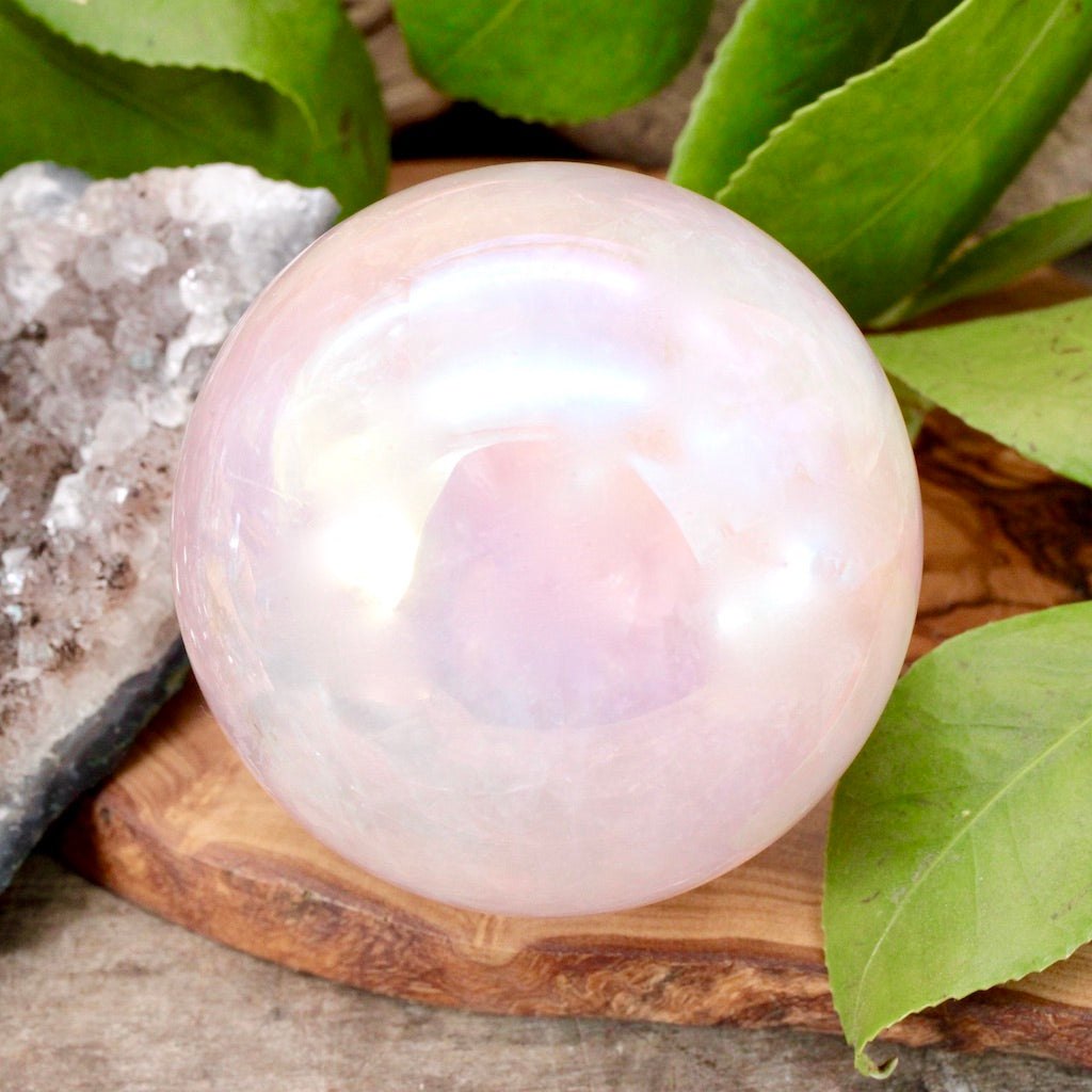 The treasure at the end of this rainbow is this exquisite Aura Rose Quartz Sphere. The shimmery rainbow flashes are breathtaking and we love Rose Quartz for the warm feeling of love that it instills in us. The Angel Aura that gives this piece its rainbows brings about joyful, inspirational energy which we are sure would be a welcome addition in any home.
