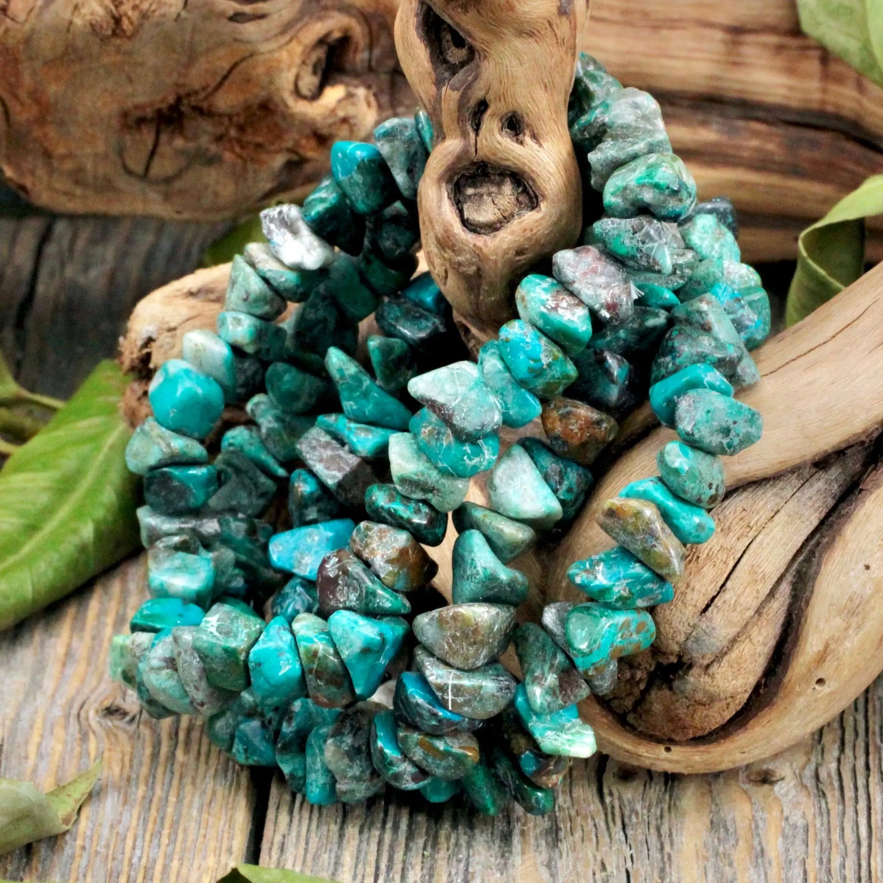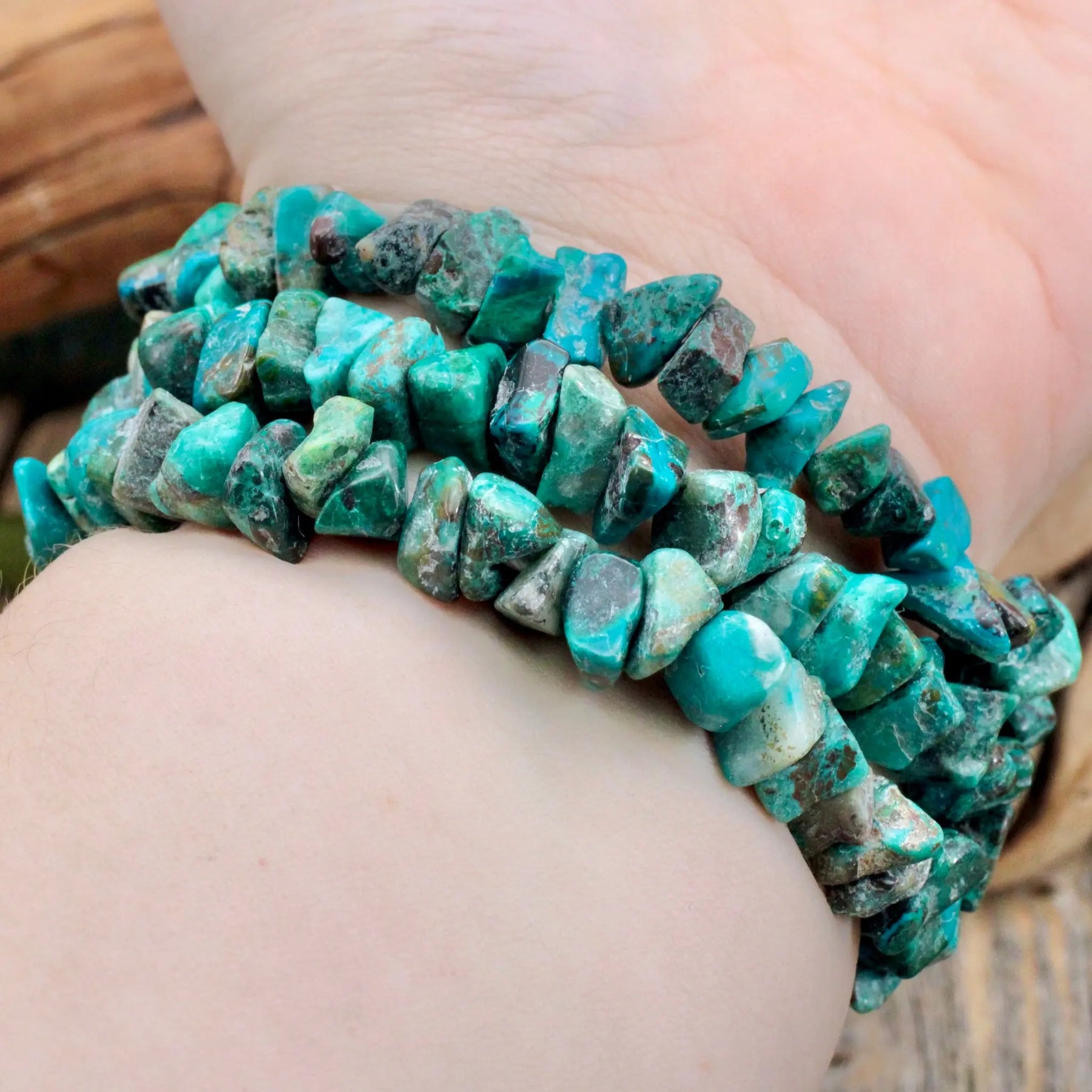 Strengthen your will with this Chrysocolla chunky chip bracelet. Even just looking at Chrysocolla can imbue you with energy and a new appreciation for life. Wearing the stone is sure to amplify those feelings and bring you to a new and improved place in life.