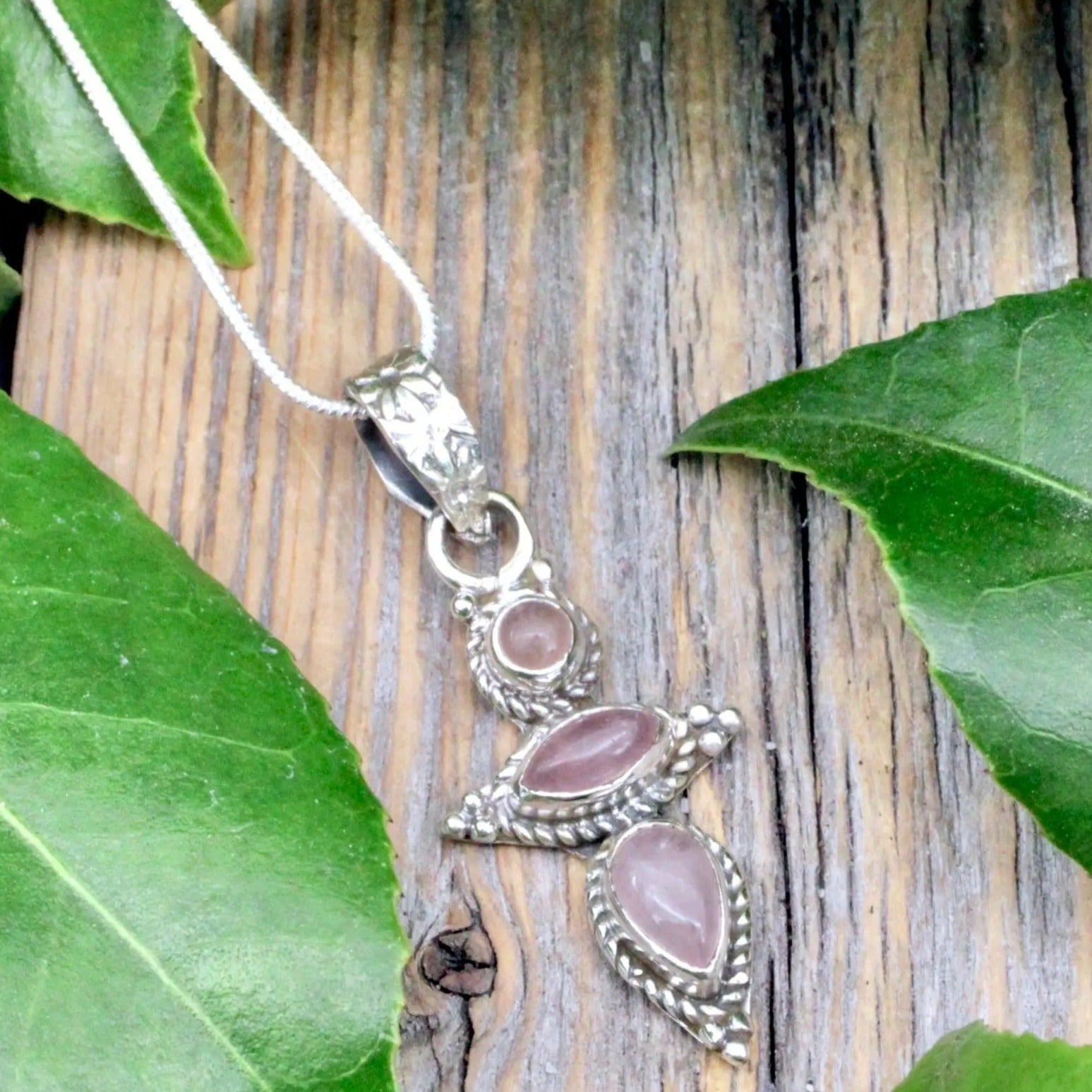 Rose Quartz Triple Stone Pendant - Sterling Silver