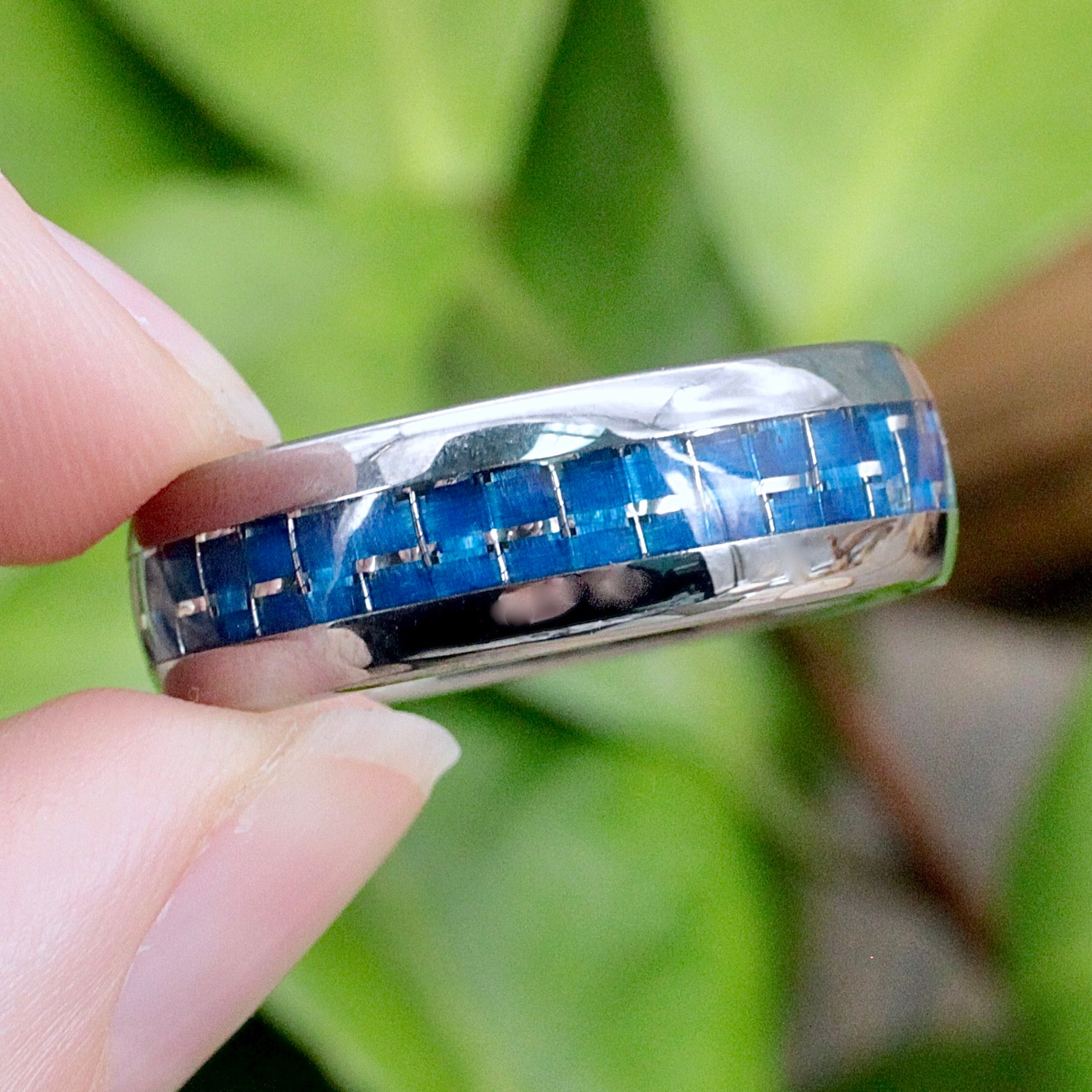 Discover sophistication with this Men's Tungsten Ring with Blue Mosaic Inlay. Skillfully crafted, it exudes elegance, complementing any attire effortlessly. Elevate your style with this timeless piece of refined craftsmanship.