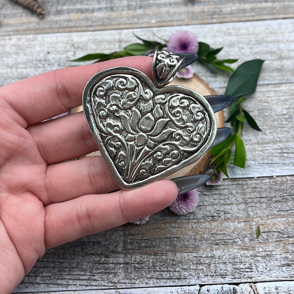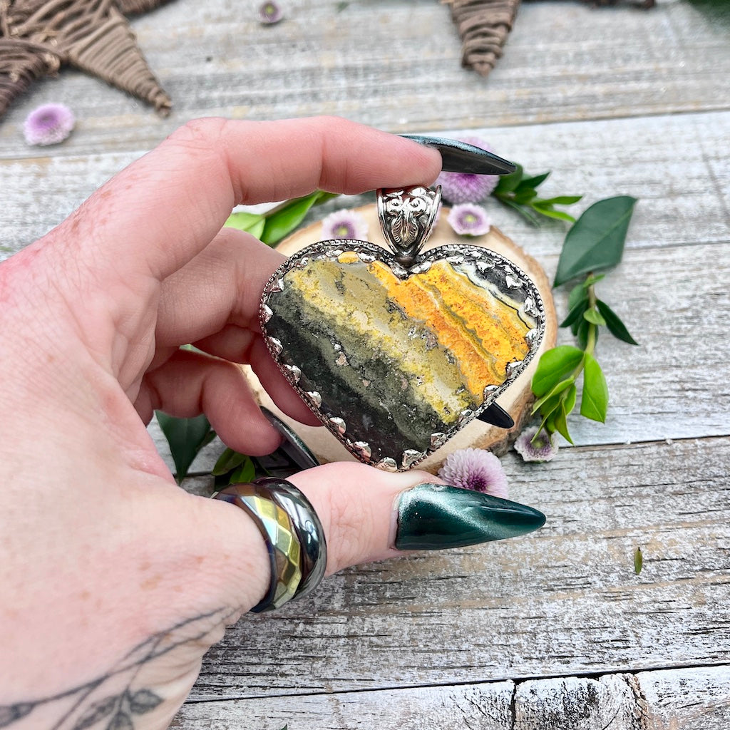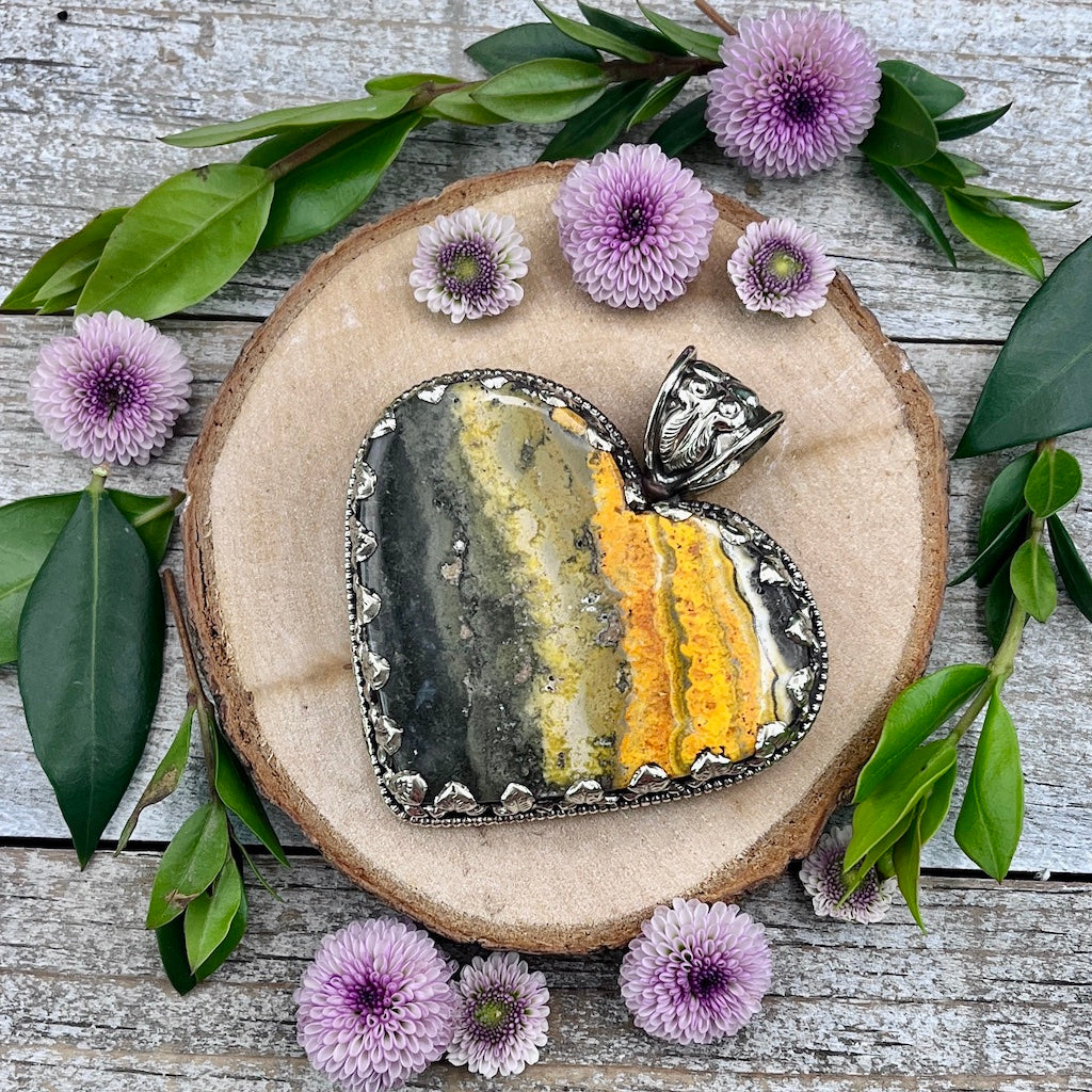 Instill a sense of purpose and joy with a Bumblebee Jasper Heart Pendant. Set into Tibetan silver and accented with a floral design, this unique pendant offers help with clearing and energizing your sacral Chakra.