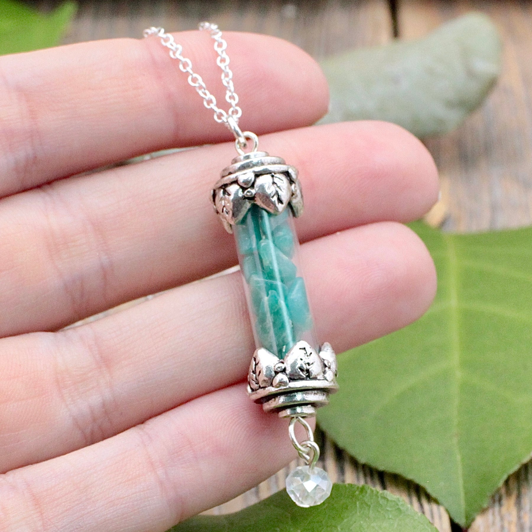 Comes on an 18" silver-plated chain.