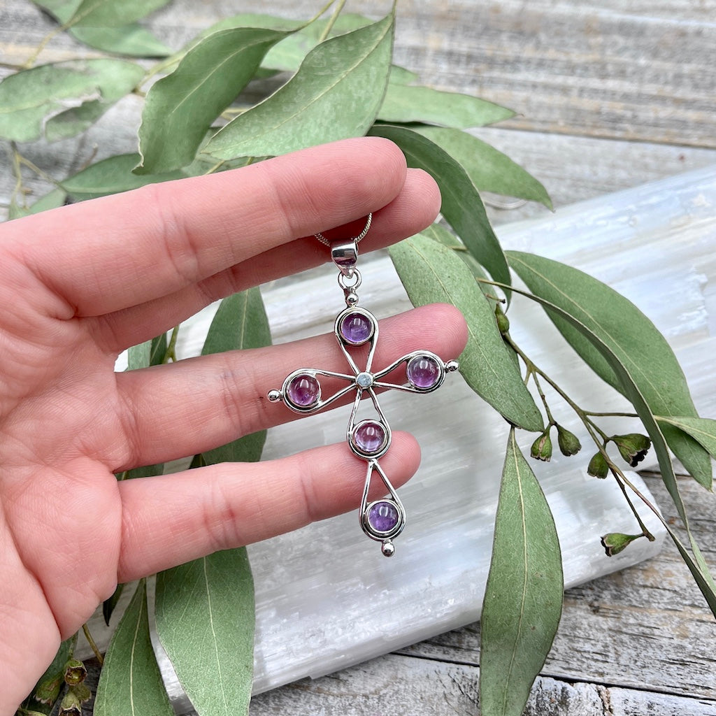 Facilitate your connection to the Divine with this Amethyst Cross Pendant. Made of sterling silver and set with 5 polished Amethyst stones, this sparkling necklace brings in a gentle, loving energy to help you get through your day.