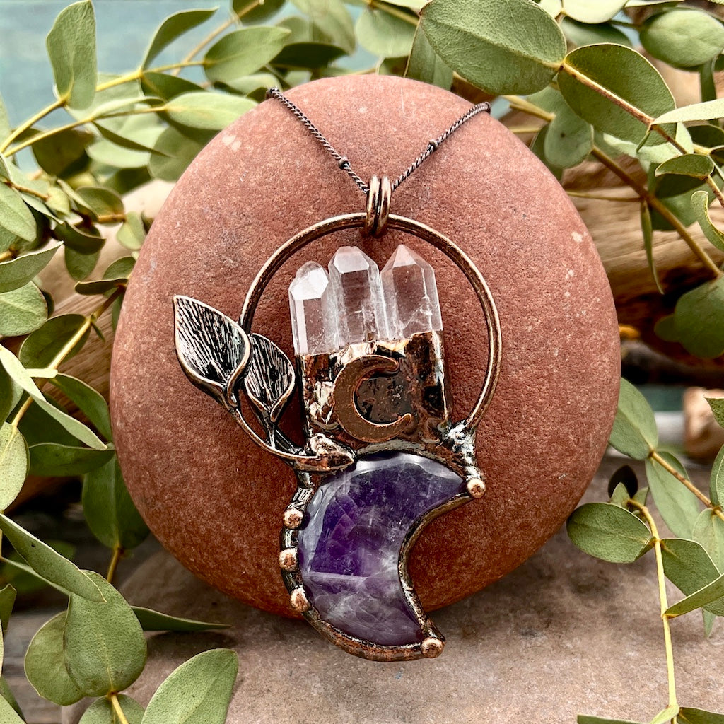 Open and align your crown chakra with this Amethyst Moon Flower necklace. Done in a warm bronze finish and accented with a trio of Quartz crystal points, this necklace is ready to help you take your vibe to the next level.