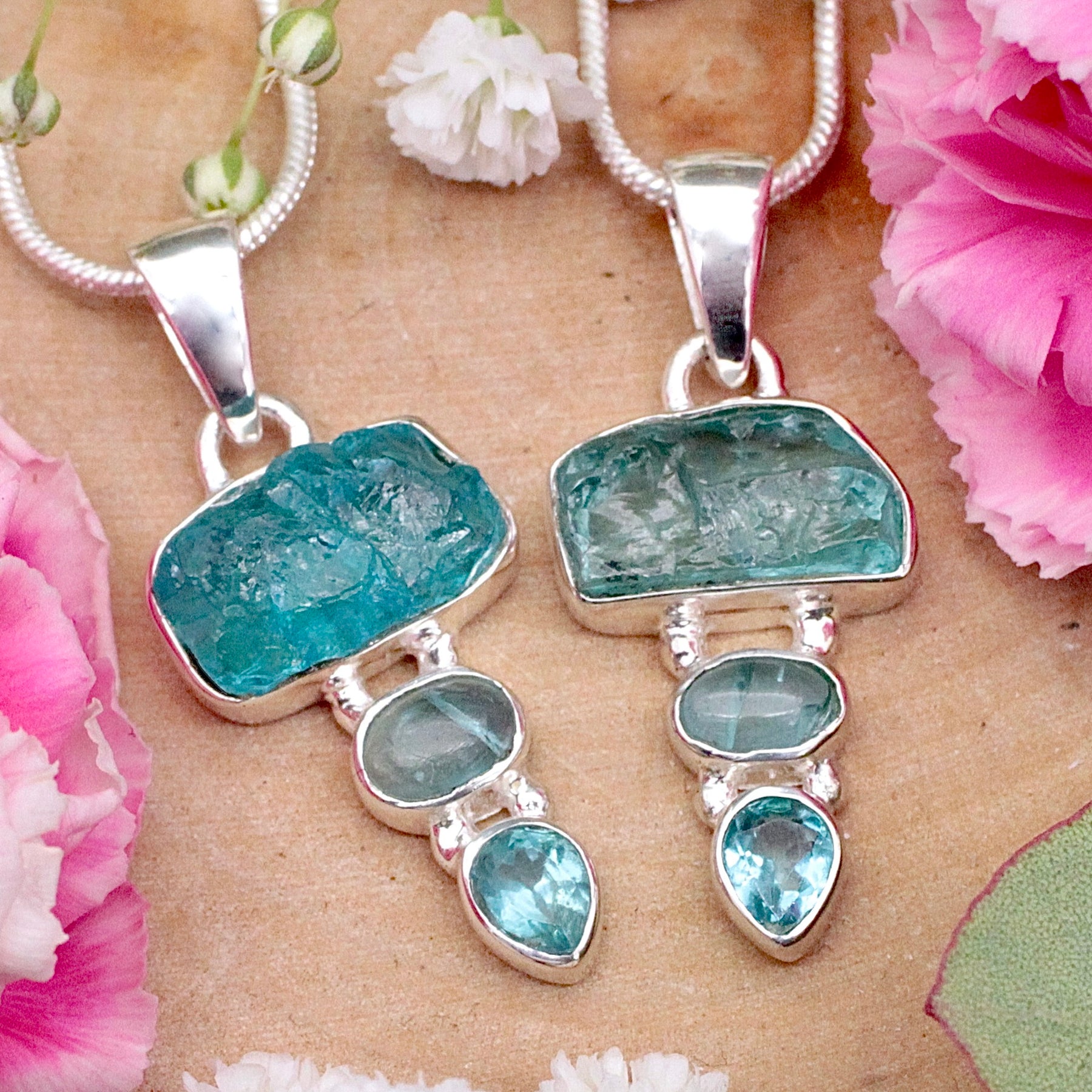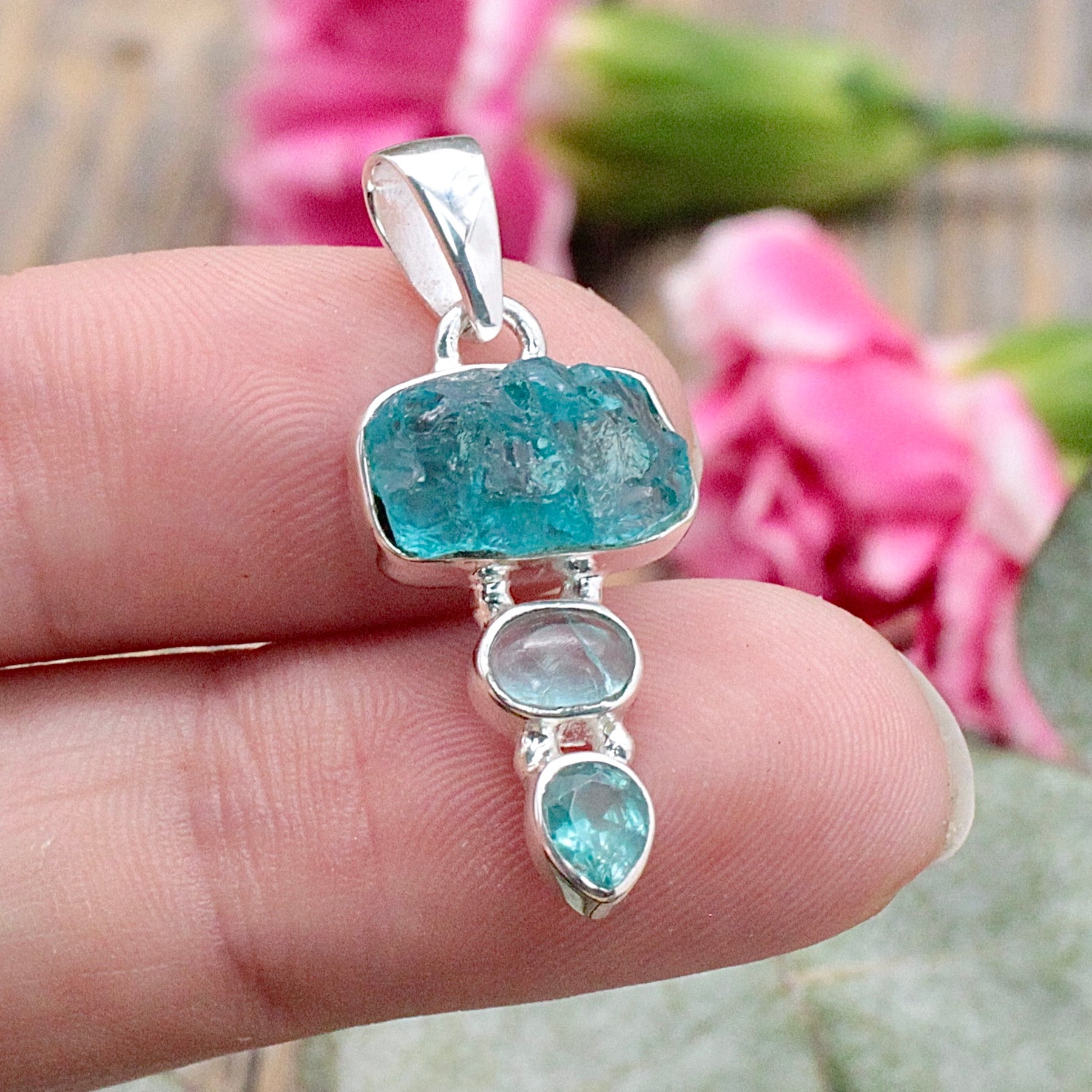 Spark your creativity with this Apatite Three Stone Pendant. Adorned in stunning blue hues, this captivating piece highlights the natural beauty of apatite. Keep it nearby to absorb its invigorating energy and inspiration.
