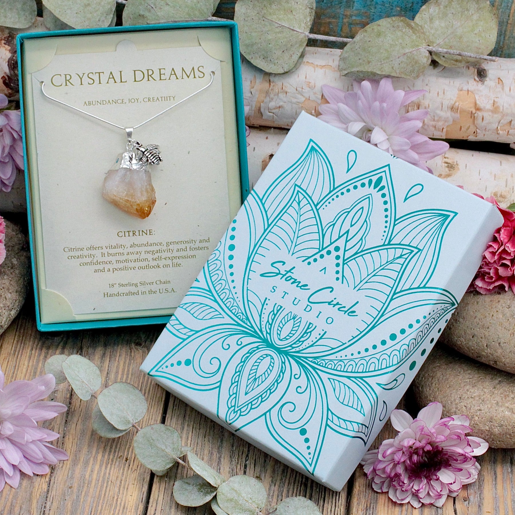 Each pendant in the Stone Circle Studio Crystal Dreams series comes in a lovely gift box that includes a card with the description of the crystal properties.