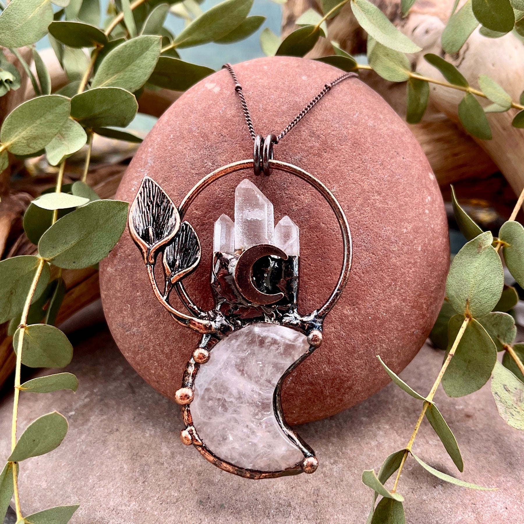 Connect to your higher self with this Quartz Moon Flower Necklace. Done in a warm bronze finish, and accented with a trio of Quartz points, this fabulous floral wonder is ready to help you raise your vibration to the next level.