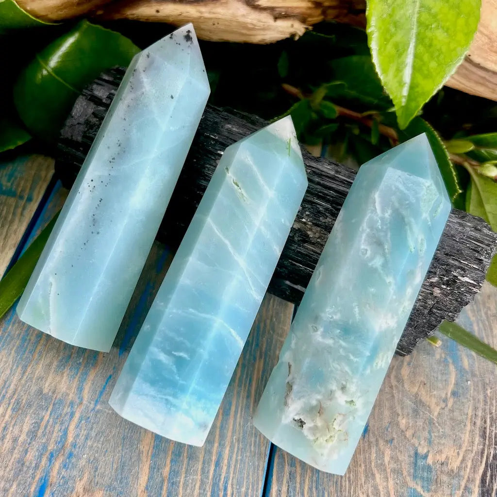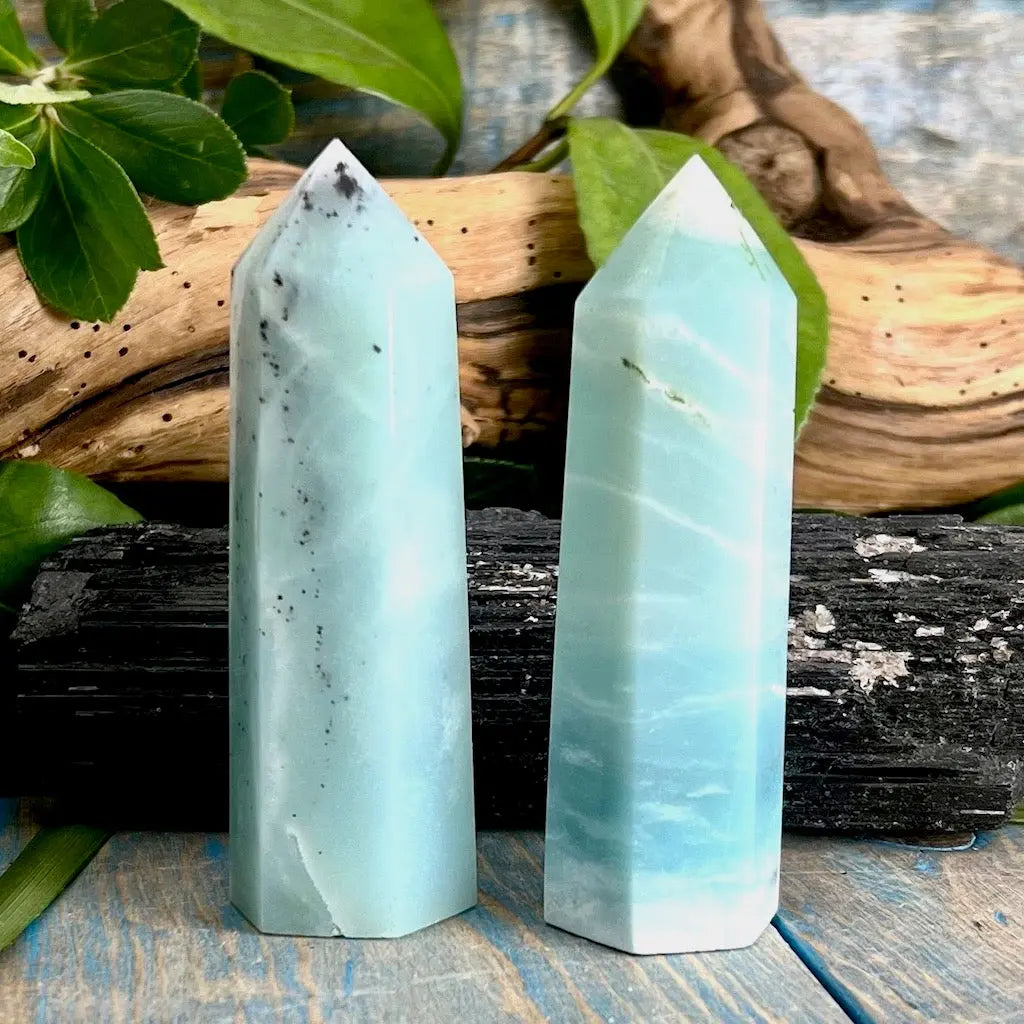 This collection of Amazonite towers is giving us such beachy vibes! The swirls and streaks of creamy white, set against the backdrop of aqua blue is like looking at a beautiful seascape. It's kind of like a day at the beach that you can hold in hand!