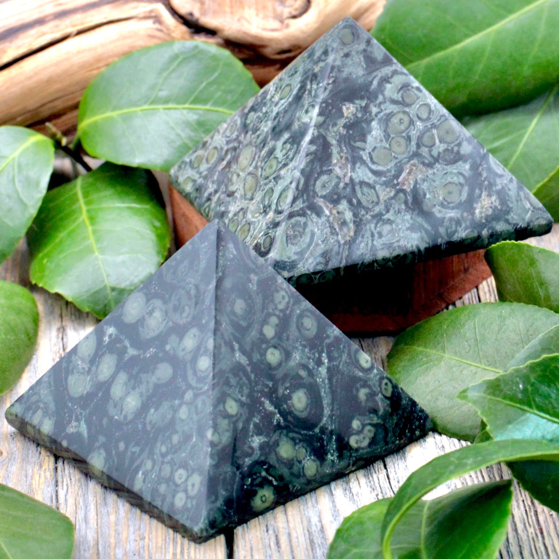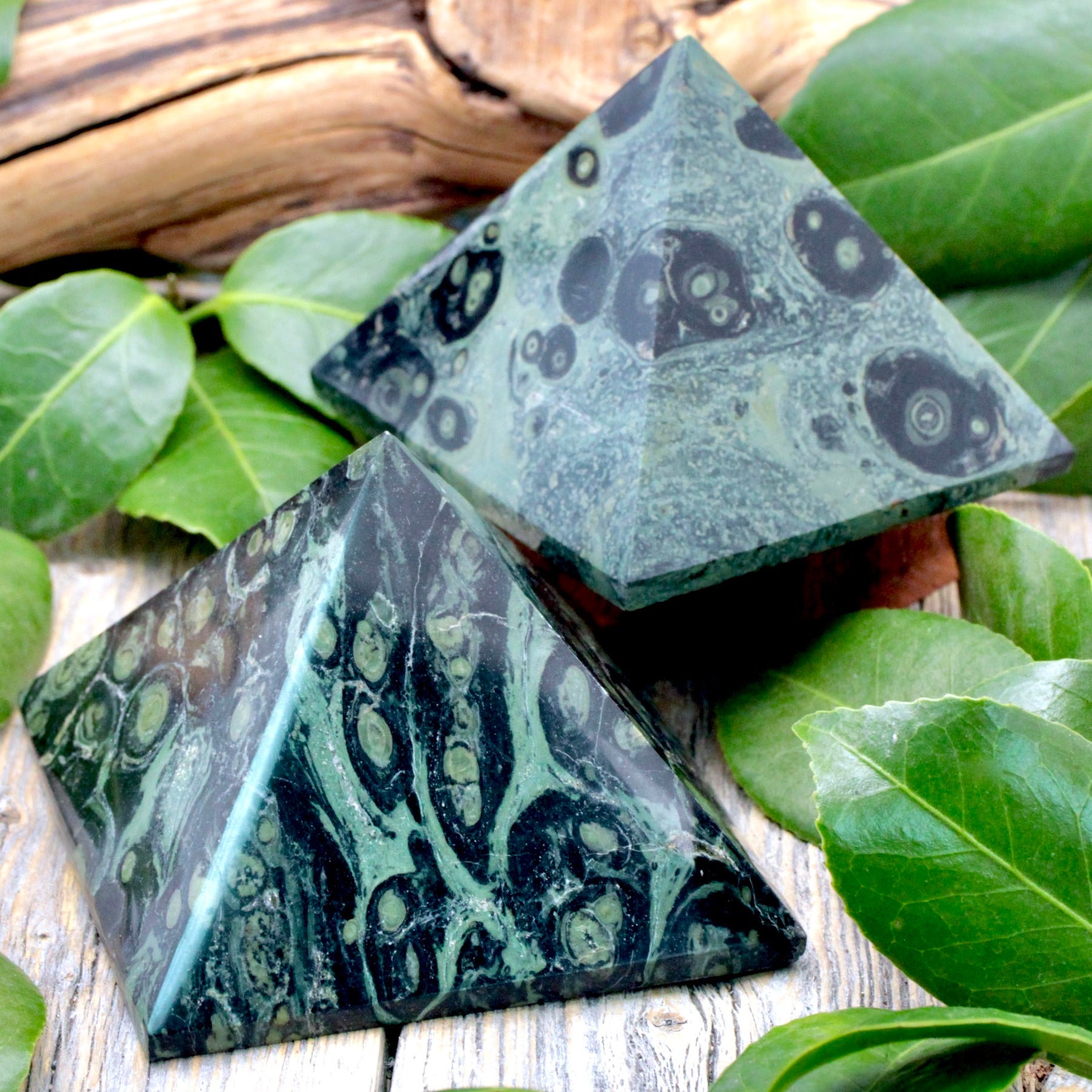 Invite balance into you life and heart with this Kambaba Jasper Pyramid. The circles found in kambaba are a reflection of the energy it offers to us. They are like a gate way to opening our heart and finding a balance with in. These beautiful dark greens will look amazing in any space you wish to keep the energy of kambaba in.