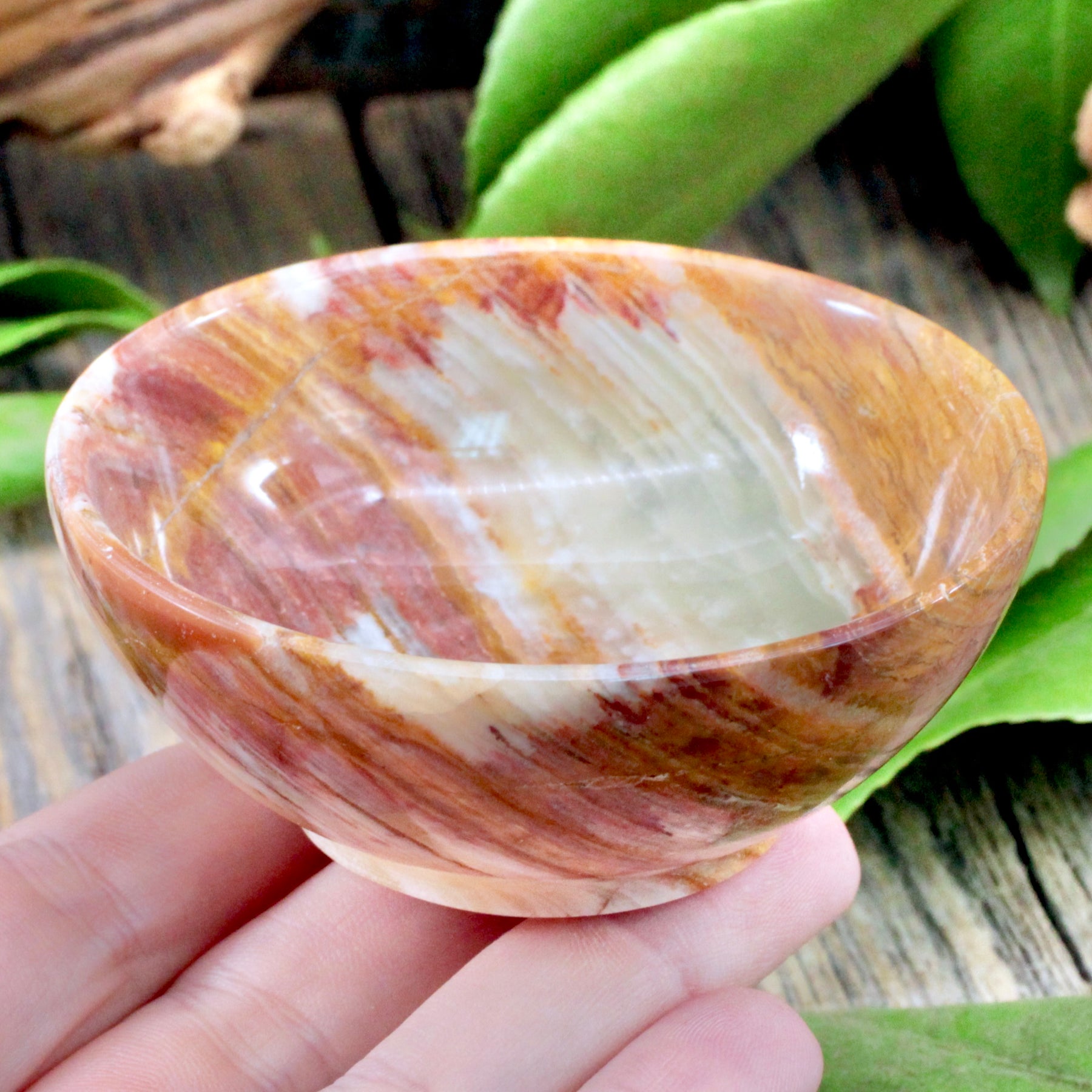 Bring a sense of energy into any space with this Green Banded Calcite Bowl. Green Banded Calcite is a stone of clear thinking and self-esteem. It helps us to feel strong and deeply  connected to our emotions. It can also bring us peace and confidence.