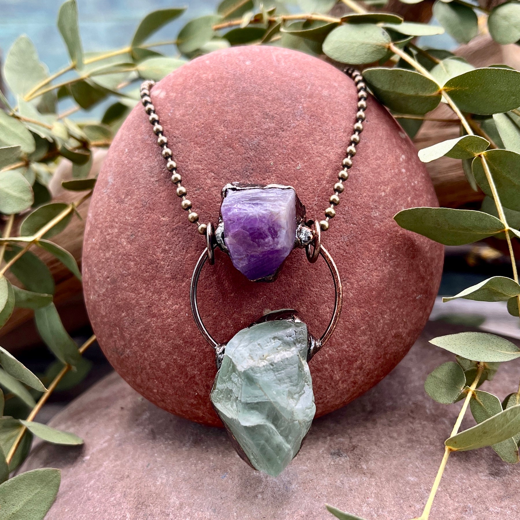 Calm the nerves with this Amethyst and Fluorite Double Decker necklace. Set in bronze finish metal, these rough little chunks of stone add a touch of natural, bohemian style to any look.