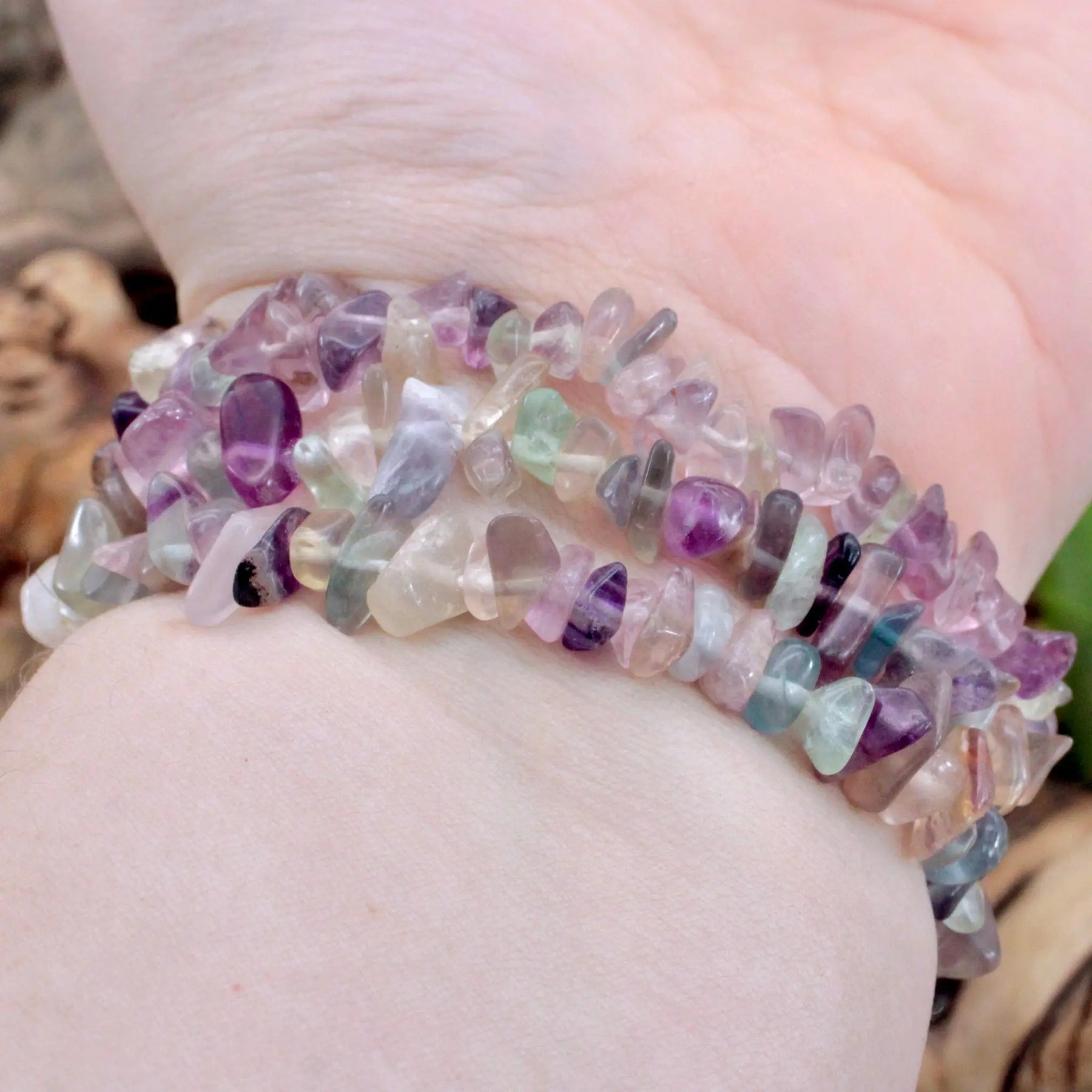 Reduce your stress and anxiety with this Rainbow Fluorite chip bracelet. It can help awaken the soul and bring you towards you goals in life.